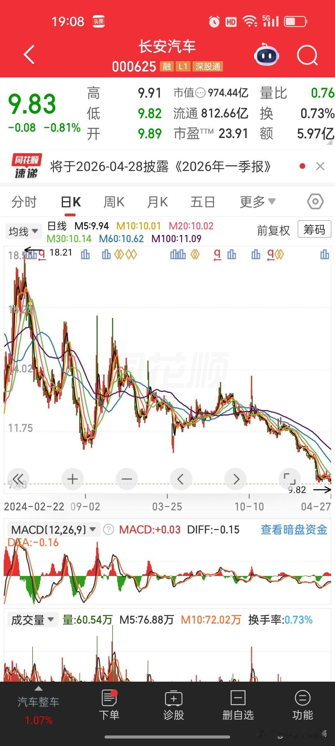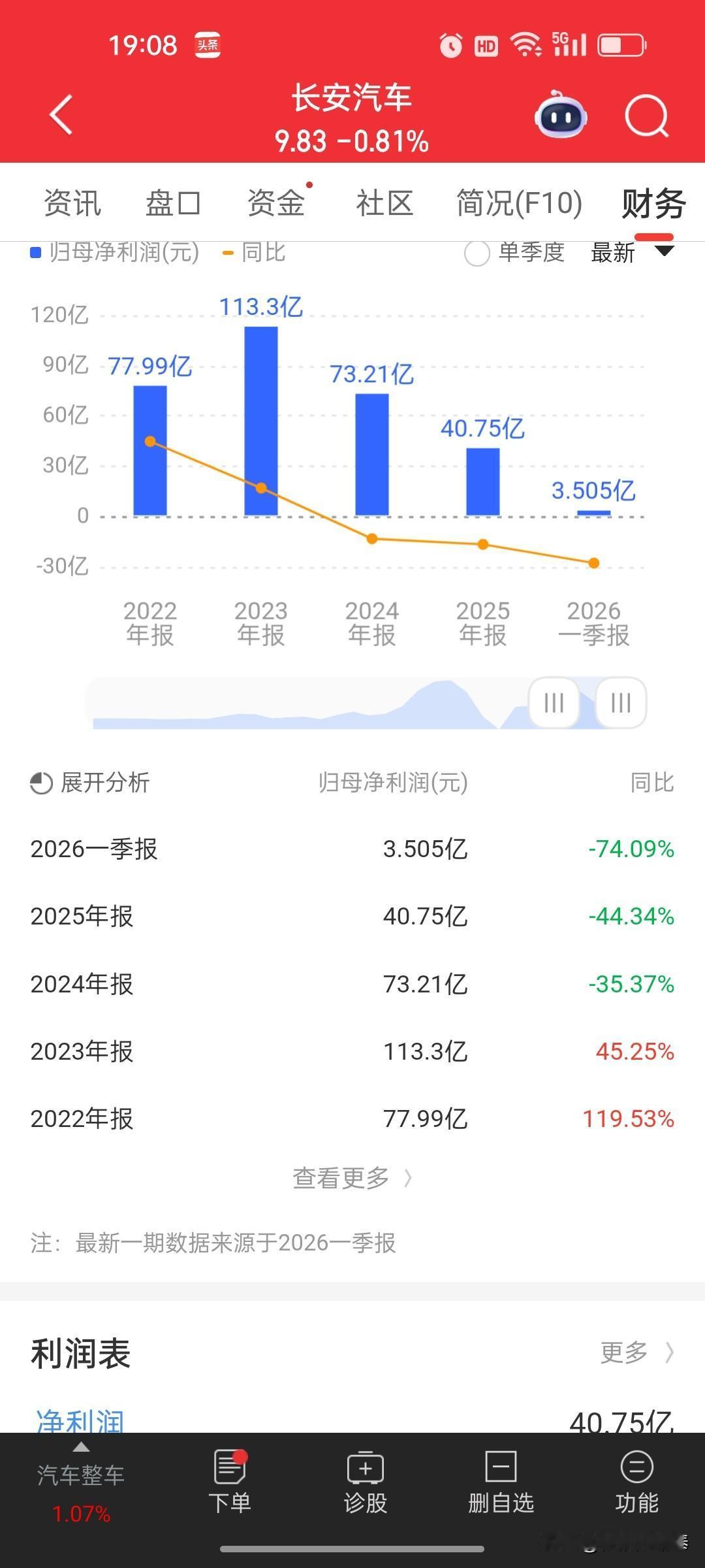 长安汽车(000625)全面点评:利润连续腰斩,股价趋势性破位 一、基本面:利润连续下滑,行业价格战下的“失血”困境 1. 年报业绩:利润连续三年下滑,从巅峰腰斩 - 2023年归母净利润113.3亿(历史巅峰),2024年73.21亿(同比-35.37%),2025年40.75亿(同比-44.34%)。 - 三年利润从113亿跌到40亿,几乎腰斩再腰斩,说明行业价格战、新能源转型压力,已经把公司的利润空间彻底打穿。 - 利润下滑的核心原因:燃油车业务持续萎缩,新能源车型销量不及预期,为了保市占率被迫降价,单车利润大幅缩水。 2. 一季报数据:利润暴跌74%,行业寒冬直接暴露 2026年一季报核心数据: - 归母净利润仅3.505亿,同比暴跌74.09%,创下近年单季利润新低; - 这组数据,直接把之前的“利润下滑”坐实成了“断崖式下跌”: 1. 价格战愈演愈烈:新能源车企集体降价,长安为了跟上节奏,旗下车型被迫降价促销,毛利率大幅下滑; 2. 新能源转型不及预期:长安深蓝、启源系列销量不及竞品,高端化路线受阻,无法通过高毛利车型对冲压力; 3. 成本压力上升:电池、芯片等原材料价格波动,叠加营销费用、研发投入增加,进一步挤压利润。 3. 估值:看似不高,但缺乏业绩支撑 - 当前股价9.83元,对应市值974.44亿,市盈率TTM约23.91倍,在乘用车行业中处于中等水平; - 但这个估值是基于“新能源转型成功、利润企稳回升”的预期,而一季报的暴跌,直接打破了市场预期,估值缺乏足够的业绩支撑,存在向下修正的风险。 二、技术面:日线空头排列,下降趋势加速 1. 股价走势:从高点腰斩,进入加速下跌通道 - 股价从18.21元的历史高点持续回落,最低下探9.82元,当前报9.83元,累计回调超46%,几乎腰斩; - 日线图上,股价已经跌破5/10/20/30/60/100日所有均线,形成典型的空头排列,上方每一条均线都是强压力位,短期反弹阻力重重。 2. 量能与资金面:缩量阴跌,资金关注度持续下降 - 近期日均成交额仅5.97亿,换手率不足1%,说明市场资金关注度持续下降,缺乏增量资金推动股价企稳; - MACD指标处于零轴下方,DIFF线与DEA线粘合,绿柱持续缩短,属于下跌过程中的弱势反弹,尚未形成明确的反转信号,整体趋势仍向下。 三、核心逻辑与风险点 1. 行业逻辑:乘用车行业进入存量厮杀期 - 燃油车时代落幕:燃油车市场持续萎缩,长安作为传统车企,燃油车业务的利润贡献正在快速消失; - 新能源内卷严重:新能源车企集体降价、技术迭代加快,行业从增量竞争进入存量博弈,中小玩家被快速出清,头部企业也面临利润挤压; - 市场份额争夺白热化:比亚迪、吉利、上汽等头部企业强势扩张,长安的市场份额持续被挤压,缺乏爆款车型支撑。 2. 公司风险点:转型乏力+利润崩塌 - 新能源转型不及预期:长安深蓝、启源系列销量增长缓慢,无法形成规模效应,高端化路线受阻,难以突破中低端市场; - 利润持续下滑:价格战导致单车利润大幅缩水,叠加成本压力,利润连续下滑的趋势短期内难以扭转; - 行业竞争加剧:头部车企持续降价、推出爆款车型,长安的品牌力、产品力不占优势,市场份额和利润面临双重挤压。 四、操作建议(风险厌恶型投资者参考) 1. 短期:观望为主,不急于抄底 当前股价处于明确的下降通道,均线压力重重,业绩层面也未出现企稳信号,抄底的风险远大于收益,建议以观望为主。 2. 中期:重点跟踪二季度销量与业绩,验证转型逻辑 2026年二季度是乘用车行业的传统旺季,二季度的销量和业绩,是判断公司经营是否改善的关键: - 若新能源车型销量大幅增长,带动利润企稳,股价才有机会突破均线压力; - 若销量和利润继续下滑,全年业绩大概率不及预期,股价可能进一步下探。 3. 长期:转型成功才有翻身机会,否则难言底部 作为传统车企,长安的长期价值完全取决于新能源转型的成败;若无法推出爆款车型、实现品牌升级,很难在存量竞争中突围,当前的股价下跌可能只是开始。 一句话总结 长安汽车2023年以来利润连续腰斩,2026年一季报利润暴跌74%,行业价格战和转型压力下,利润崩塌的趋势已经形成;股价处于明确的下降通道,短期缺乏企稳信号,中期需跟踪二季度销量和业绩,长期需等待转型逻辑验证,当前不具备配置价值。 (信息来源:深交所、同花顺财经 以上内容均为个人观点与解读,仅供参考,不代表平台立场,也不构成任何投资或决策建议。