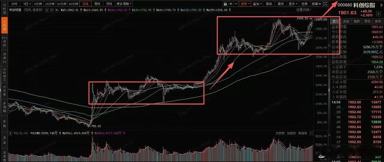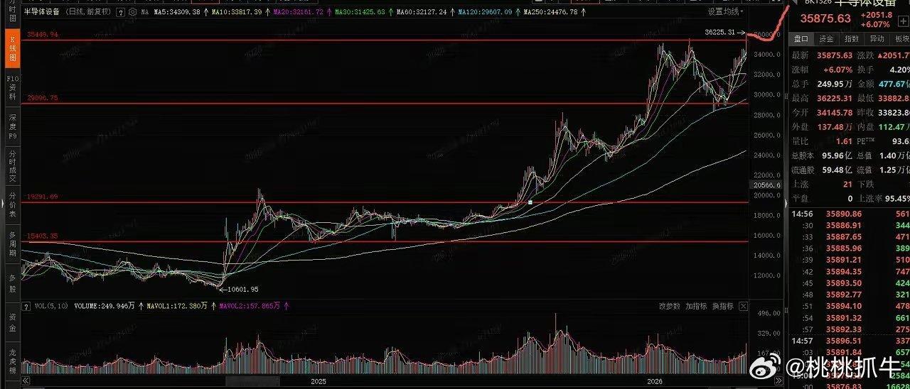 半导体全线大涨!半导体、半导体设备、科创综指、科创芯片走势分析周五晚上美股半导体大爆发,今天A股跟进,半导体大涨主要是涨价利好影响,涨价大概率会持续下半年,AI上游硬科技抱团行情,不管是CPO、通讯设备、半导体、pcb等一时半会不会结束,有调整依旧是机会。半导体设备今天涨了6%,已经突破前期高点,半导体已经接近前期高点。而今天白酒又跌了2.3%。强者恒强,弱者恒弱。说完消息面,技术面分析如下:1、半导体设备。大涨6%,突破了前期高点,放量大阳线,放量突破前高,是有效突破,接下来要么继续放量拉大阳线,要么横盘震荡下等5天均线上来,然后继续上涨,最好是第二种,第二种没有上车才有机会上车,并且震荡久一点,行情走的慢一点,才能走的更长远。这个板块其实我基本每天都在分享。2、半导体。距离前高一步之遥,这个高点肯定是能过去的,过去以后走势上基本和半导体设备一样了,突破区间后,最好有一个横盘震荡过程,时间稍微久一点,未来就能走的更长远。3、科创综指。今天中阳线,突破了前期高点,创了历史新高,突破区间后,上方已经没有套牢筹码,相比于半导体等倍量阳线,这个是阶梯量,5天均线之上继续看涨。4、科创芯片。基本可以参考半导体设备。就不赘述了。目前第一阶段行情随着大涨和放量,距离结束不会太远了,第二波行情如果有的话,大概率也要5月下半个月了。也就是突破箱体后震荡2周左右,再来一波概率比较大。财经观察官