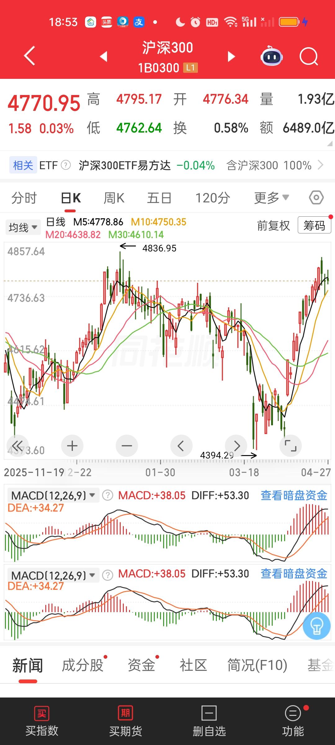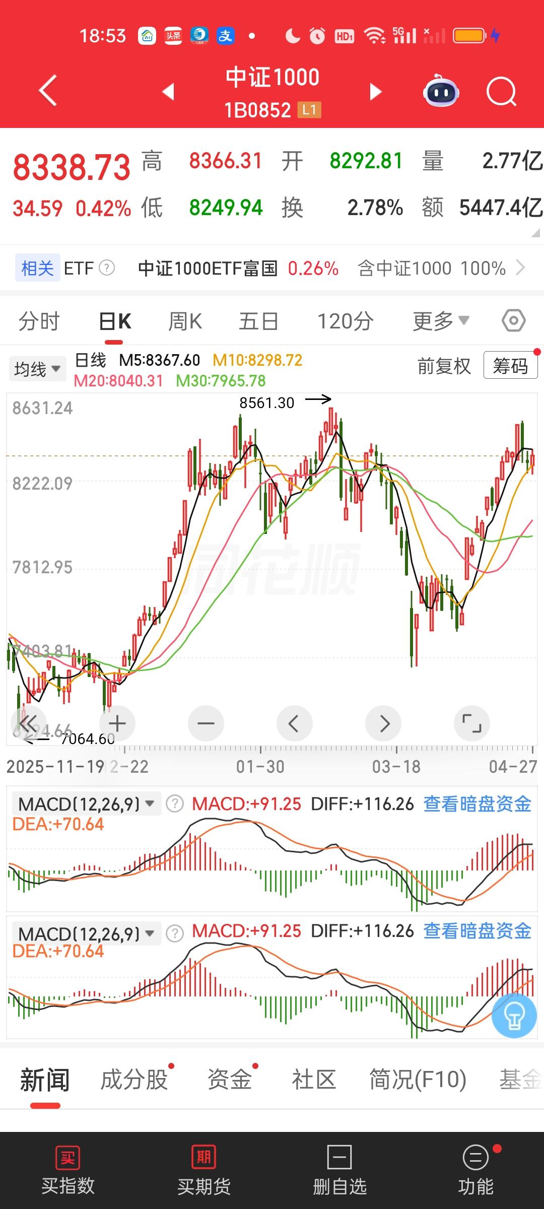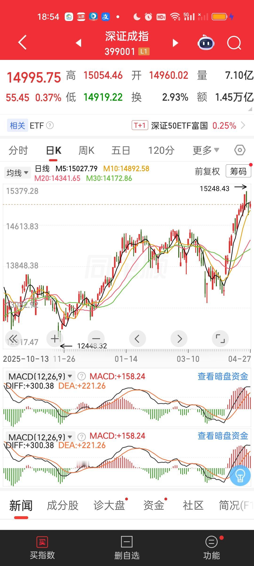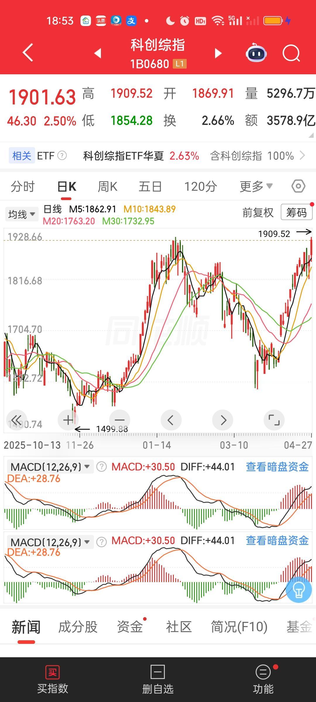 下一个破新高的指数会是谁呢?这次是创业板指最新破新高,随后是深指和今天的科创综指。创业板指数与CPO板块几只核心大票深度捆绑,它们创了新高创业板指肯定也会跟着创新高。 现在科创50,沪深300和中证1000离前高是最近的,上证指数,上证50,北证50反而还有很远的距离。谁会成为第四个创新高的指数呢? 科创50今天收盘收在1508.38,前高1588.83,1588.83/1508.38=1.0533,还差5.33%。 沪深300今天收在4770.95,前高4836.95,4836.95/4770.95=1.0138,只差1.38%。 中证1000今天收在8338.73,前高是8561.30,8561.30/8338.73=1.0267,还差2.67%。 目前来看下一个创新高的指数应该是沪深300,其次是中证1000。