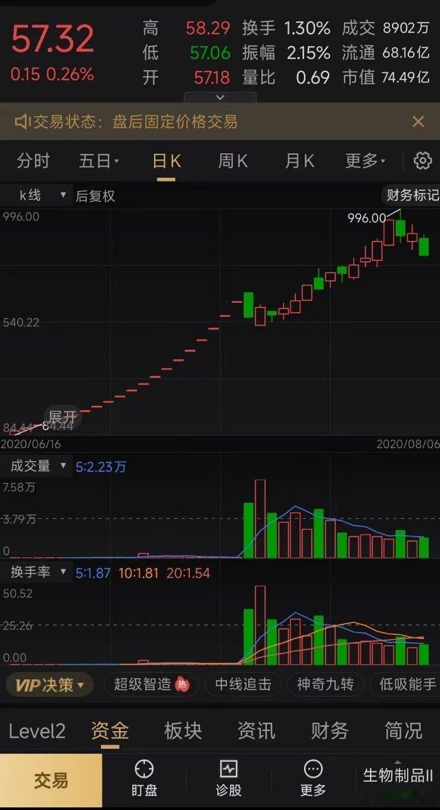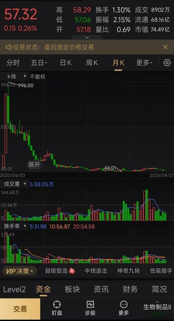 发行价70.37元,上市后34个交易日涨到996元,中一签最高盈利达到462800元,涨幅高达1315.38%,目前票价只剩下57.32元!在大A有这么一家公司,发行价70.37元的它在上市后仅用34个交易日就走出一波超过13倍的行情,成为当时市场上盛极一时的大妖股。该股于2020年6月16日在创业板上市,其主要从事冻干人用狂犬病疫苗(人二倍体细胞)和ACYW135群脑膜炎球菌多糖疫苗生产和销售及其他疫苗的研发。当时正值非常时期,而它的主营业务又刚好站在其风口上,因此成为风靡一时的概念股!在6月16日上市后它连续拉了20个涨停板,票价从70.37元暴涨到619.73元,7月16日它以659.97元开盘,由于未能继续封涨停板,因此中签者相争选择落袋为安,票价开始快速回落,最终当天以跌停价557.76元收盘。全天53500手,成交额高达31.76亿元,但是换手率只有35.69%。在接下来的13个交易日票价再次被拉升,8月3日涨停后票价已经涨到951.50元,8月4日以951元开盘,开盘后涨到了996元,离千元大关仅差一步之遥,可惜的是当天收盘价最终定格在887元,而996元也成为它的顶,如果中签者有幸在996元清仓,那么这一签它将获得462800元,即便以涨停板打开那一天的开盘价清仓也能收获接近300000元的盈利。从上市到现在仅仅过去6年,然而它的票价随着时间的流逝而不复从前,目前的票价仅剩下57.32元,即便复权之后也只有140.59元,较996元高点跌去了85.88%。它之所以在短短的6年下跌85.88%,除了因为当时是特殊时期而它刚好站在风口之上,更重要的是它业绩大变脸,净利润在2021年达到8.295亿元后,已经连续下降四年,到了2025年它的净利润只剩下2.199亿元。虽然它有着90.98%的毛利率,但是净利率却只剩下15.87%,这说明它的营业成本还是不低的。对于这样一只从高位超跌下来的票,不知道在座的各位股友对它有什么看法?欢迎在评论区分享一下您的个人观点!