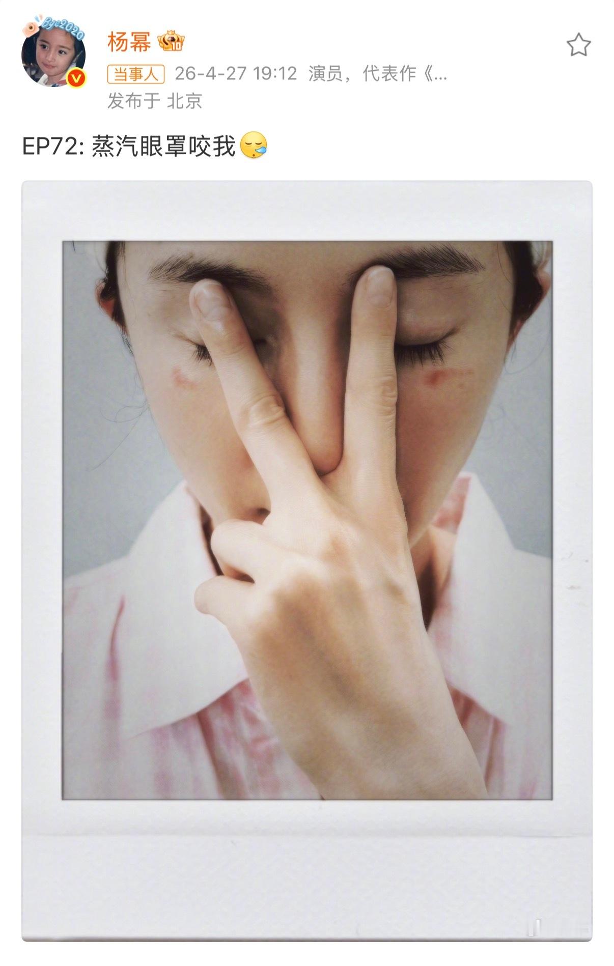 杨幂脸被蒸汽眼罩烫伤了明星果然不一样,吐槽图片都有杂志封面大片感……充满艺术气息不过这也算广而告之,大家用蒸汽眼罩时也得注意一下。