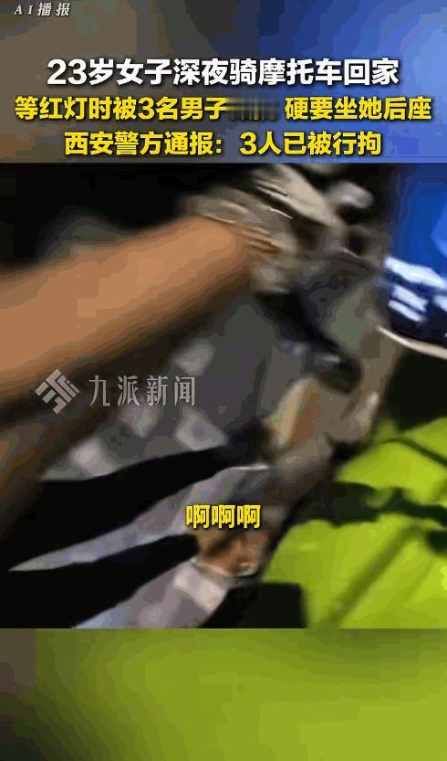 “真是刷新了做人的下线!”谁能想到,在车水马龙的西安街头,等个红灯的功夫,竟然能被人当街死死围堵? 这件事发生在今年4月22日深夜,西安长安区一处十字路口,夜里十一点,城市依旧车来车往,23岁的小姑娘小鱼刚刚结束一天的工作,骑着摩托车准备回家,奔波了一整天,她满心疲惫只想早点到家休息。 路口红灯亮起,小鱼规规矩矩停在非机动车道上,戴好头盔,停稳车辆,安静等待通行,全程安分守己,没有任何出格举动,就在这时,一辆黑色轿车停在了她的身旁,车窗缓缓落下,车内的司机主动搭话,借口夸赞小鱼的摩托车好看,询问能不能坐到后座体验一下。 面对陌生人突兀的搭讪,小鱼保持警惕,礼貌且坚定地拒绝了对方,表示自己没有多余头盔不方便载人,本以为拒绝之后,对方就会就此作罢互不打扰,可谁也没想到,对方的恶意远远超出想象。 很快绿灯亮起,小鱼拧动油门,准备正常驶离路口,但这辆黑色轿车却死死跟在她身后,一路尾随追击,跟着她行驶到下一个十字路口,等再次红灯亮起,小鱼被迫停车,轿车上瞬间下来三名男子径直朝着她围了过来。 三人分工明确,从正面侧面双向封堵,彻底挡住道路,把小鱼和摩托车牢牢困在路口中央,完全切断了她的逃生路线,紧接着一名男子直接试图坐上摩托车后座,还有人趁机上手,轻薄触碰小鱼的腰部。 最让人脊背发凉、无比寒心的是,车上还下来了一名女子,本以为同为女性,她能够共情小鱼的无助,出面劝阻同伴制止闹剧,可她不仅没有半点劝阻的意思,反而主动上前,死死按住小鱼的双手,帮几名男子困住孤立无援的女孩,旁人眼里本该共情互助的女性,反倒成了恶意的帮凶,这份冷血冷漠远比几名男子的骚扰行为更让人窒息。 被多人围堵控制,双手被按住,面对陌生人的轻薄骚扰,小鱼瞬间慌了神,陷入极度的恐惧,危急关头,她抓住对方短暂松手的空隙,不顾一切拧动油门,直接闯红灯狂奔数百米,拼尽全力才成功摆脱这群人的围堵。 成功脱险后,劫后余生的小鱼紧绷的情绪彻底崩溃,蹲在路边崩溃大哭,平复情绪后第一时间选择报警维权。 接到报警后,当地警方反应迅速办案高效,不到48小时就将涉案的三名男子全部抓获,依法处以行政拘留,警方通报事实清晰,明确判定三人滋扰骚扰,违法事实确凿,有媒体透露,事发前几名涉案人员聚餐饮酒,但成年人喝酒从来不是寻衅滋事,骚扰他人的借口,恶意违法就必须付出代价。 事件曝光后,瞬间引爆全网,网友集体愤怒,大家气愤的不只是突如其来的围堵骚扰,更是整件事暴露的现实问题,繁华都市的深夜街头,独自出行的女性安全感竟然如此脆弱,只是安分等一个红灯,短短几十秒就会遭遇无妄之灾。 更让人无奈的是,事发当时路口车流不少,全程只有一名路人远远拍下视频,没有任何人敢上前出手相助,从无端搭讪尾随追击,到围堵控制动手轻薄,整套流程娴熟,根本不是临时起意,而是精准拿捏了深夜人少女生独居弱势的心理,肆无忌惮宣泄恶意。 所幸警方及时出手,让恶人受到了应有的惩罚,但这件事也给所有人敲响警钟,城市的繁华不等于绝对的安全,深夜出行的弱势群体,一直都在直面未知的风险,也希望社会能够加强夜间街头巡逻,守护每一个深夜赶路的普通人,更愿每个人都能心存善意,在他人身陷困境时,不要冷眼旁观做黑夜里温暖人心的微光。