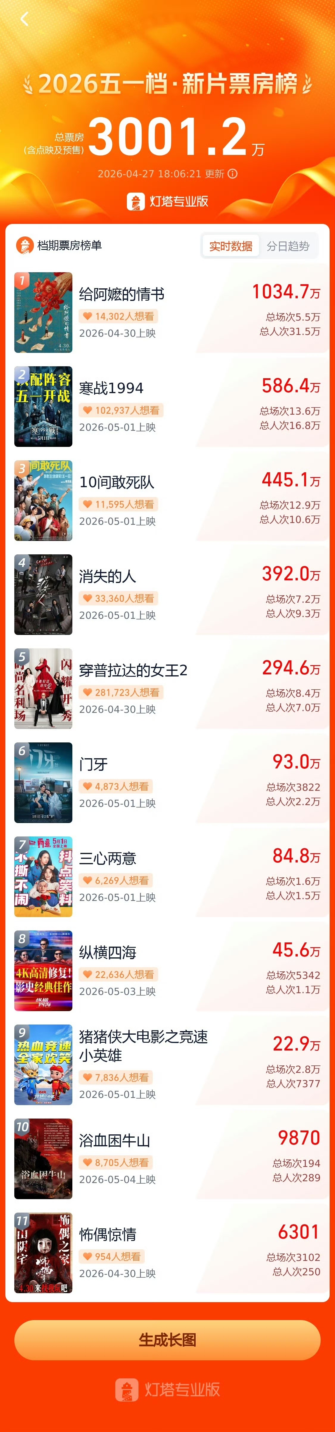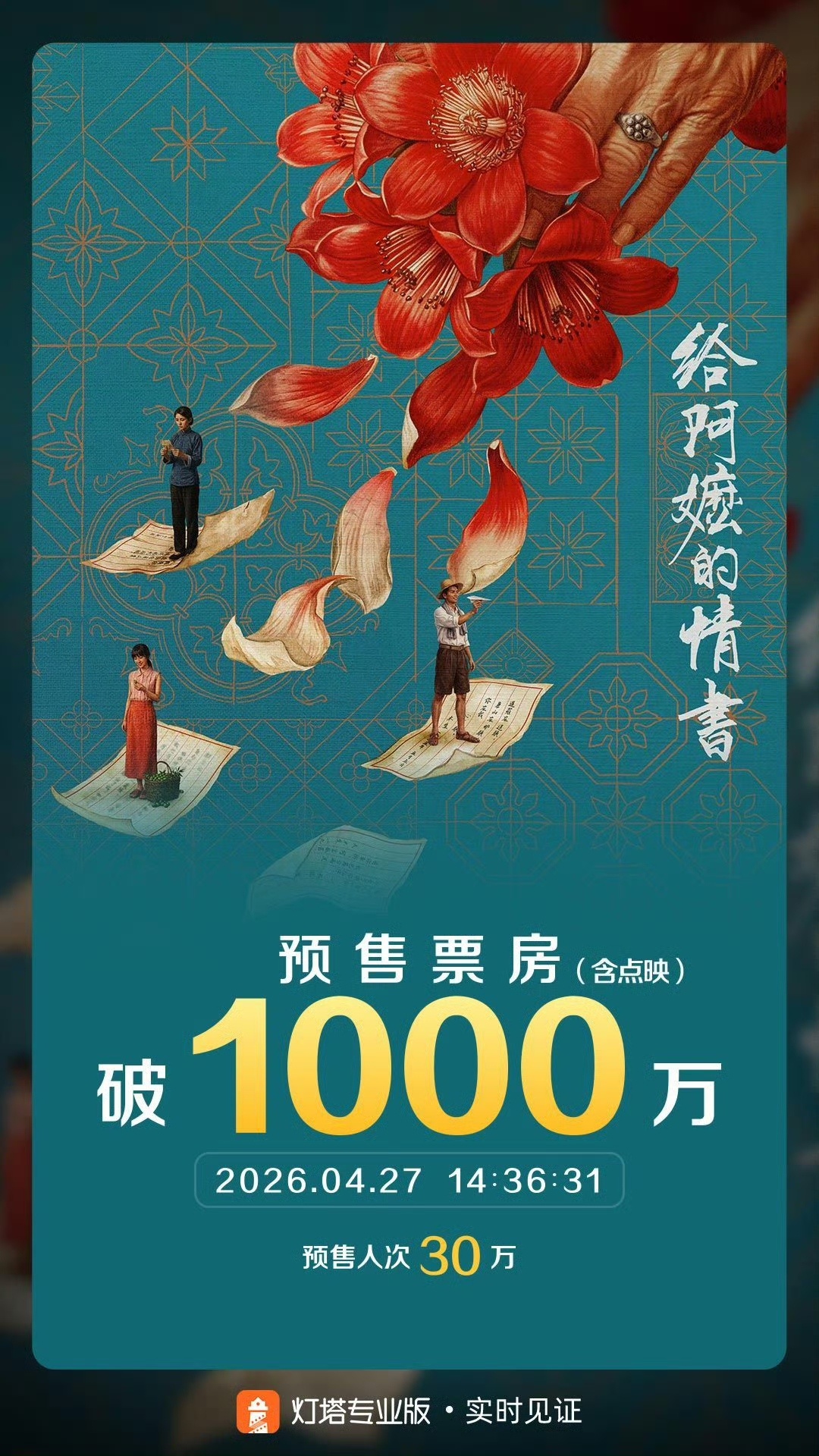 2026年五一档新片点映及预售总票房突破3000万,温情电影《给阿嬷的情书》率先突破1000万票房领跑,全程使用潮汕方言对白,目前热度主要集中在广东省。其次是《寒战1994》,预售票房破500万!