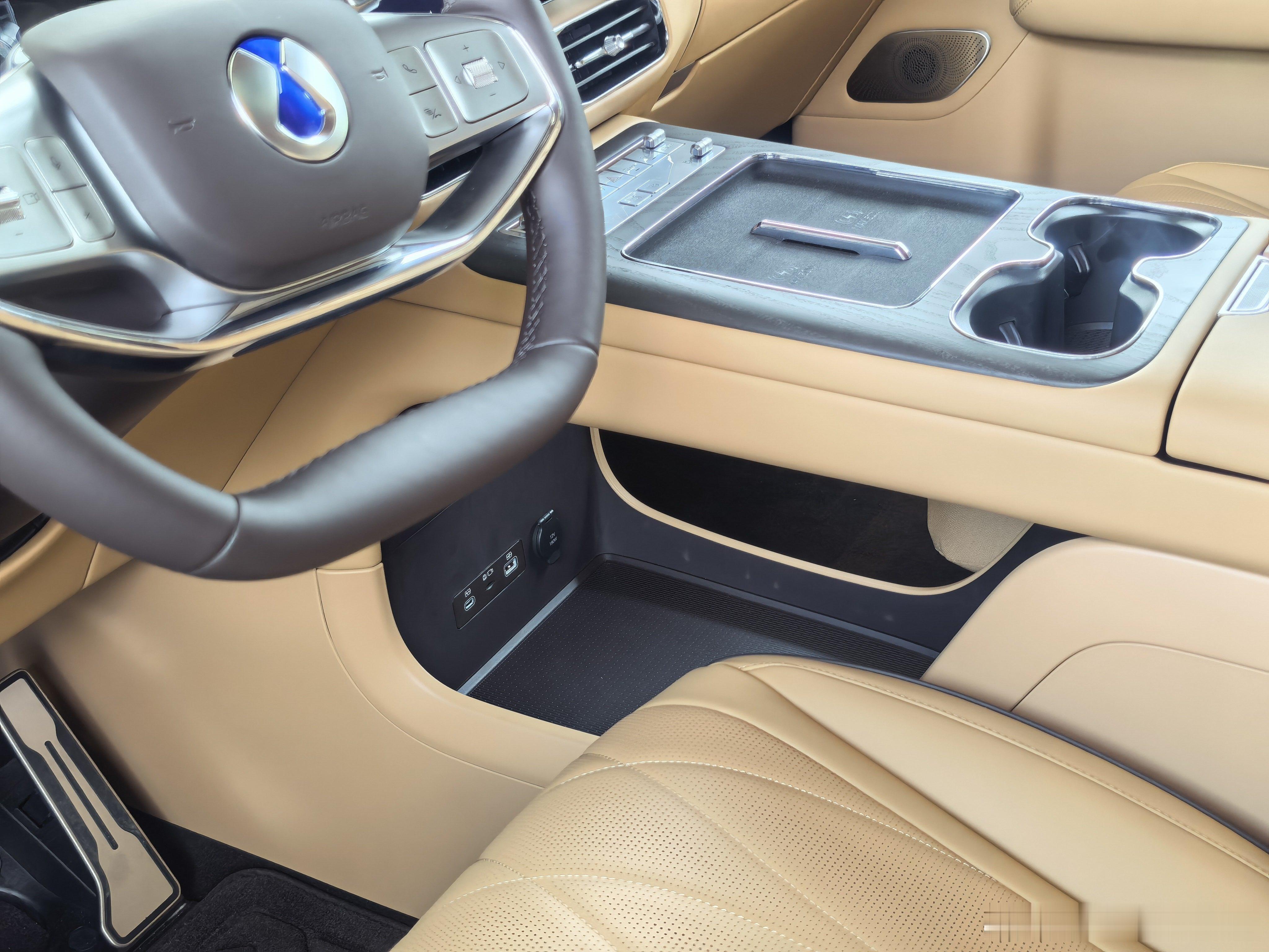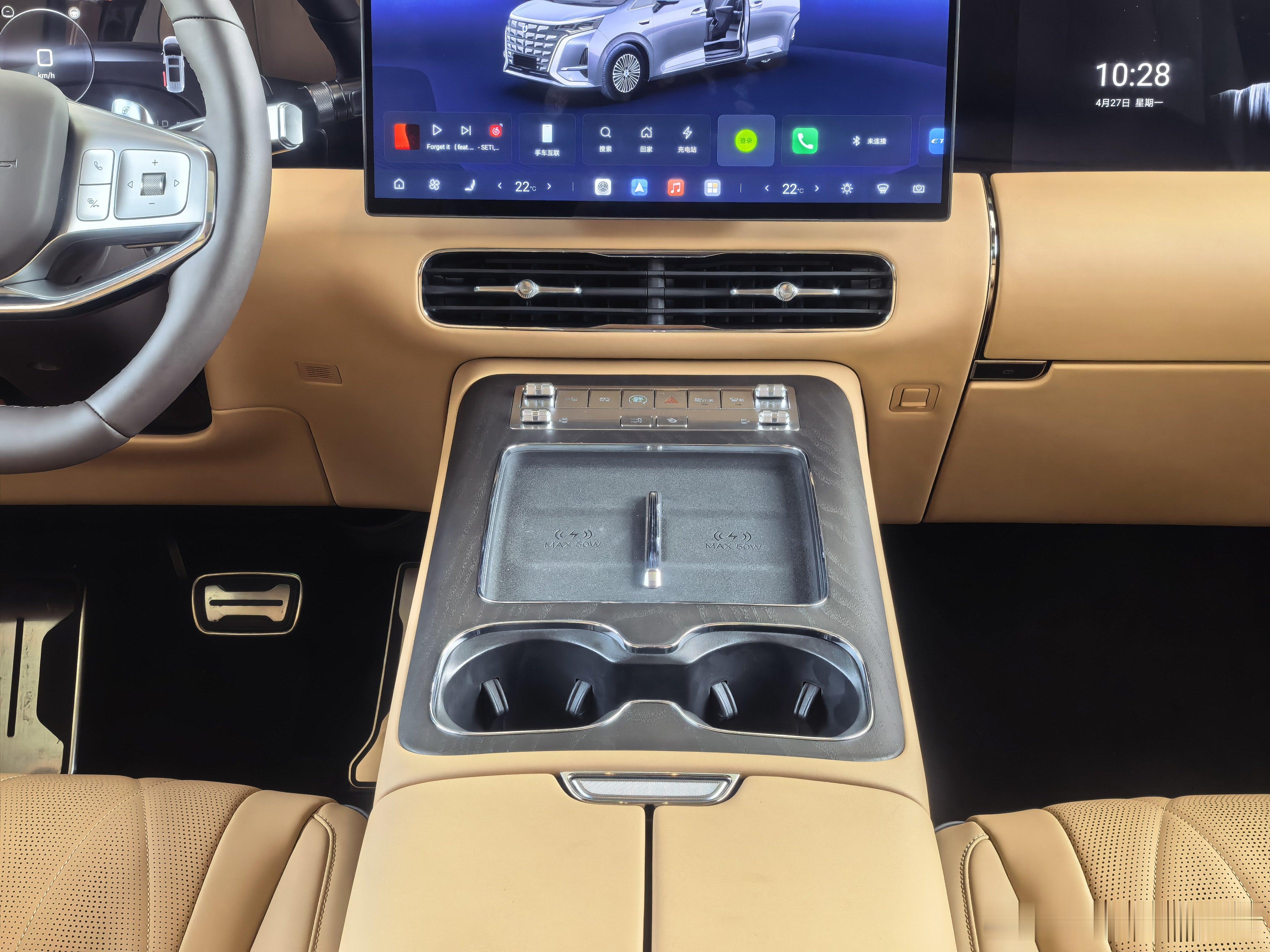 怀档上车后中控扶手区域的空间就释放出来了,所以这一次升级到了两个 50W 手机无线充电。