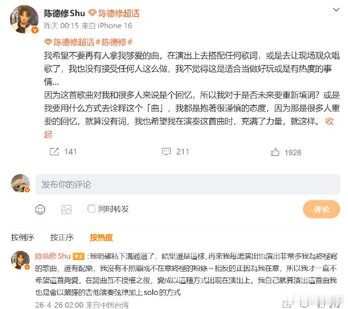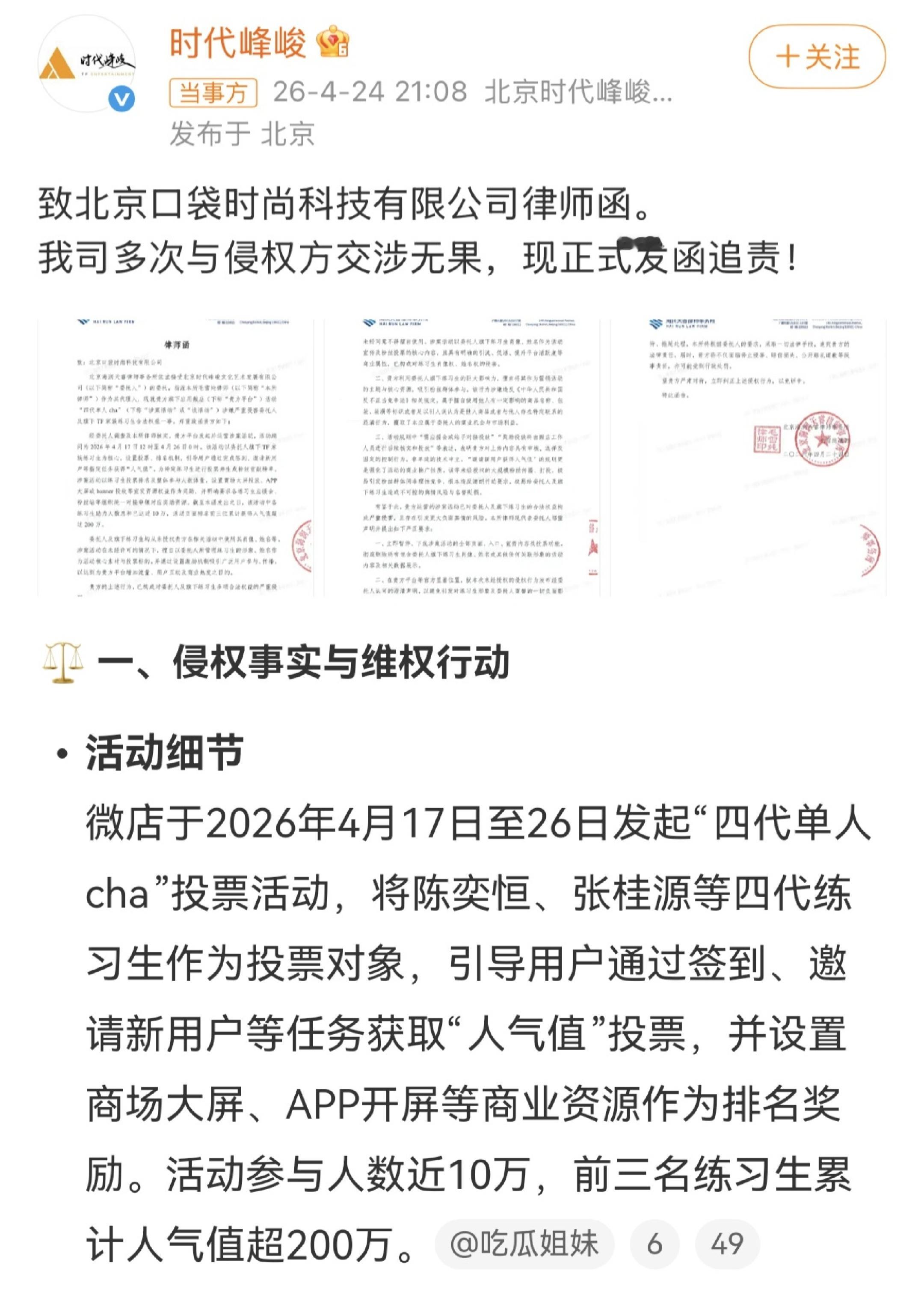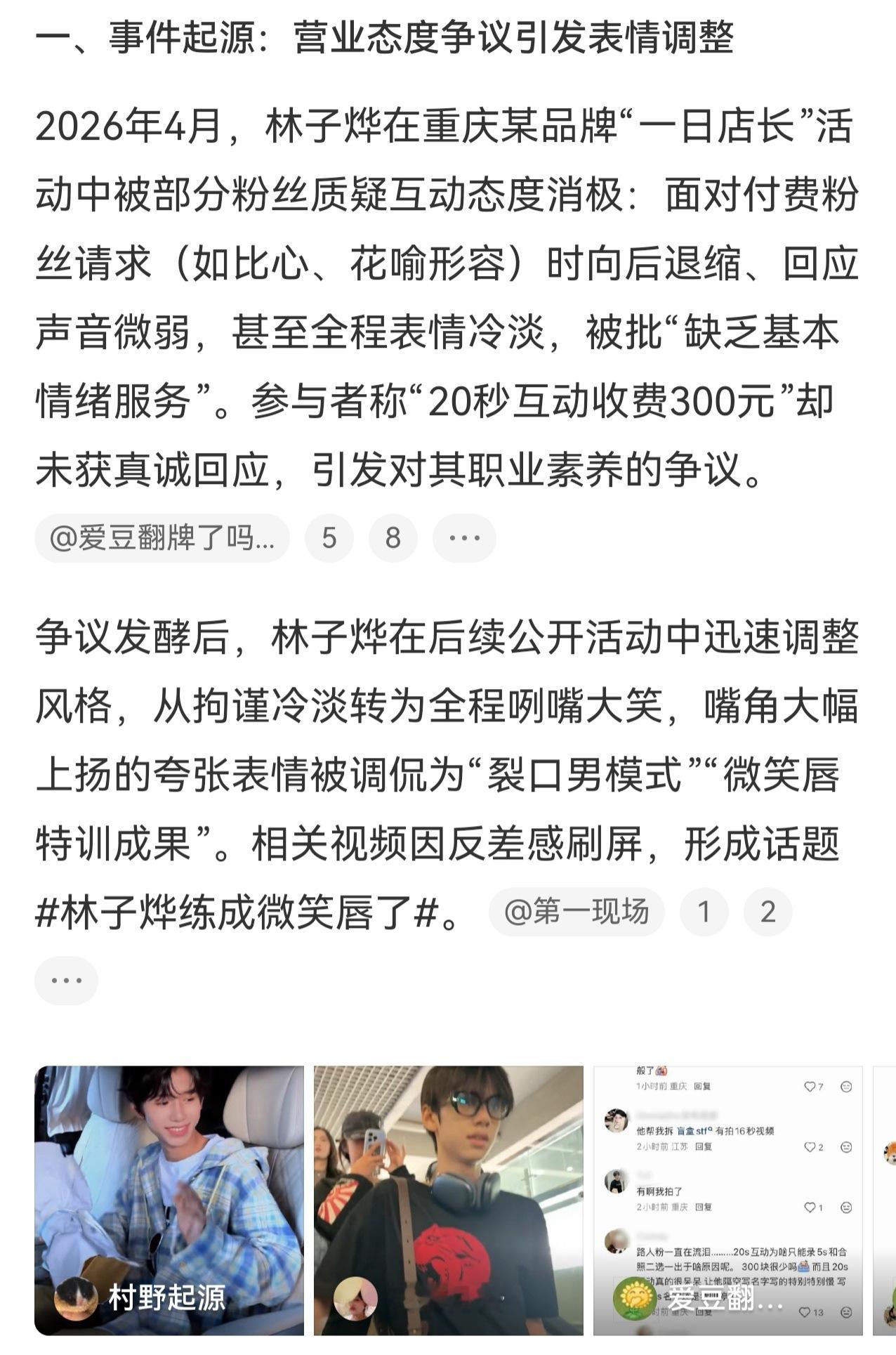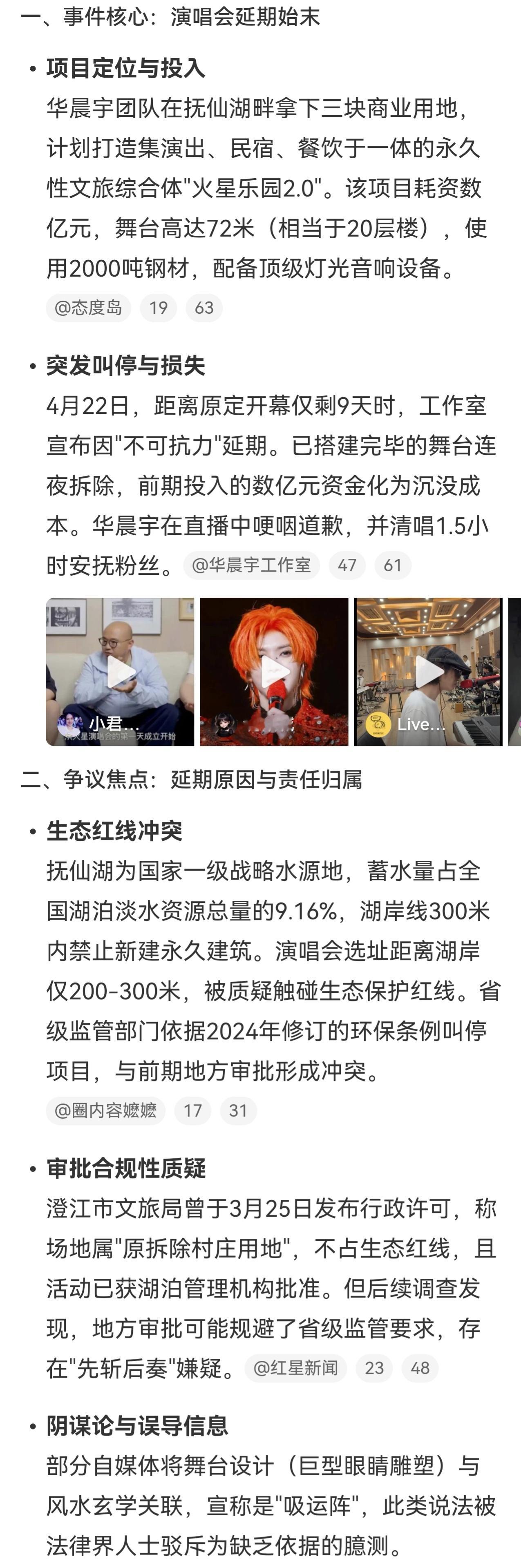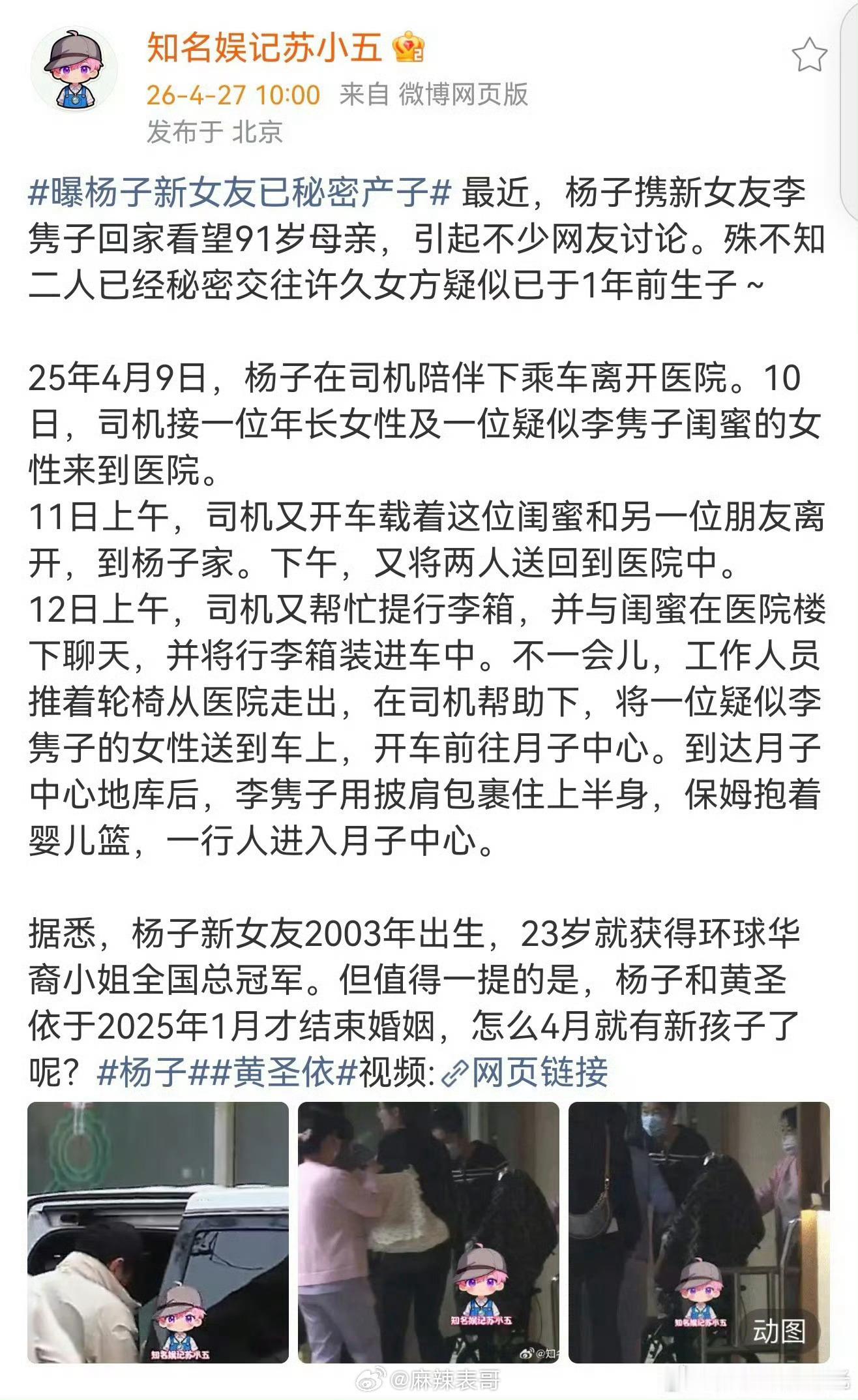2026-04-27总结①爱奇艺世界大会没和人家订蛋糕但是用了人家的设计稿 图1②网传杨子新女友2025年4月被拍到疑似生子,杨子黄圣依2025年1月才分开,而且杨子新女友是2003年出生 图2③陈德修发表声明,明确要求他人停止在演出中擅自使用其作曲的《够爱》旋律搭配歌词或引导观众合唱 图3④微店发起的四代单人cha活动,时代峰峻要求微店立即下线活动、删除侵权内容及数据,并在平台显著位置发布澄清声明 图4⑤触及生态保护红线,华晨宇抚仙湖演唱会延期 图5⑥五哈第六季中,因2024年底酒后滋事事件暂别节目的宝石老舅(董宝石)以飞行嘉宾身份回归,并在镜头前公开道歉 图6