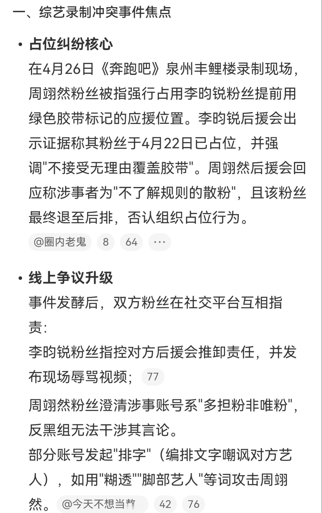 撕❶跑男,周翊然家被指强占李昀锐粉丝位置不归还,hyh说是散粉 行为管不了,且该粉丝最终退至后排,否认组织占位行为。 图7❷黄杨钿甜接受新浪采访,首次回应耳环事件 图8❸林子烨重庆参加活动被粉丝吐槽态度差小牌大耍,全程非常敷衍和不耐烦 图9❹八千里云和月,被指双线剧情差距太大,一边在抗战一边在谈情说爱,有工作人员爆说是一条线拍完之后经费就花超了,导致另一条线根本没钱也没时间展开 图10爆料原剧本里田家泰和丁玉娇还有多次表白的感情线,于和伟对人物剧本逻辑向编剧提出了一系列问题,然后探讨进行修改 图11❺宁艺卓发布多组个人照片后,部分评论指责其造型“擦边”“不妥当”,回怼差评 图12❻张泽禹粉丝控诉张函瑞粉丝帆布包抄袭 图13❼张碧晨在节目里说自己耳朵听不见,被工作人员嘲笑,粉丝觉得工作人员很不尊重人,粉丝给音你而来排字了,要求对方道歉 图14❽鸟巢演唱会庆功宴,张杰工作室文案中使用短句“回到那一天,初见面”引发争议,有人质疑其抄袭五月天演唱会主题,粉丝澄清该句实为张杰2010年歌曲《今生今世》的原创歌词 图15❾侯明昊2026年巡回演唱会因舞美及宣发设计与檀健次2024年“多见一次”巡演高度相似,被质疑系统性抄袭 图16❿唐艺昕参加《乘风2026》,有不少夫妻恩爱热搜之后,张若昀粉丝非常不满,说不能让唐艺昕强行捆绑张若昀 图17❶❶品牌方Hitcard推出《天地剑心》官方影视收藏卡第二弹,声称已获正版IP及艺人授权。但部分粉丝质疑卡面使用未公开废弃妆造,且存在肖像严重失真问题,要求品牌下架并追责。图18