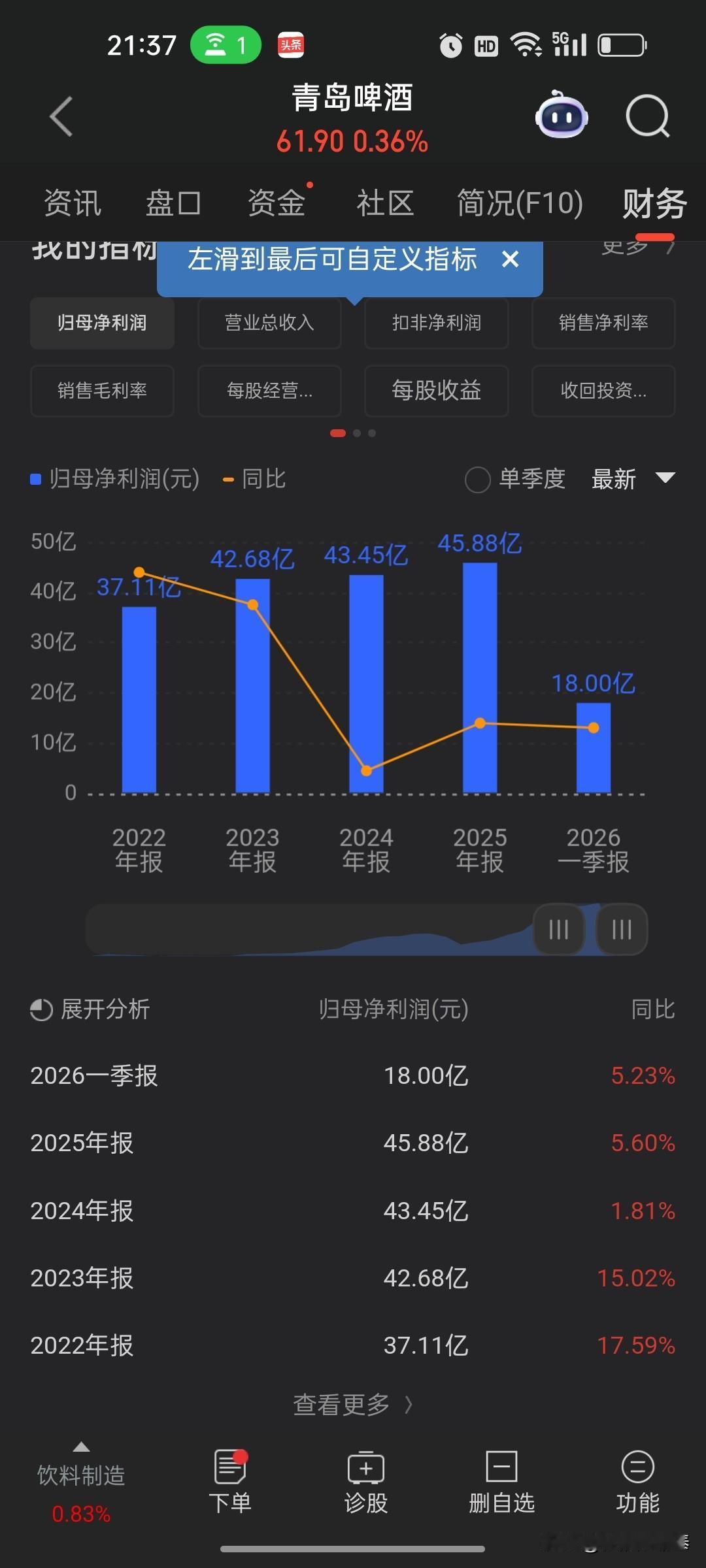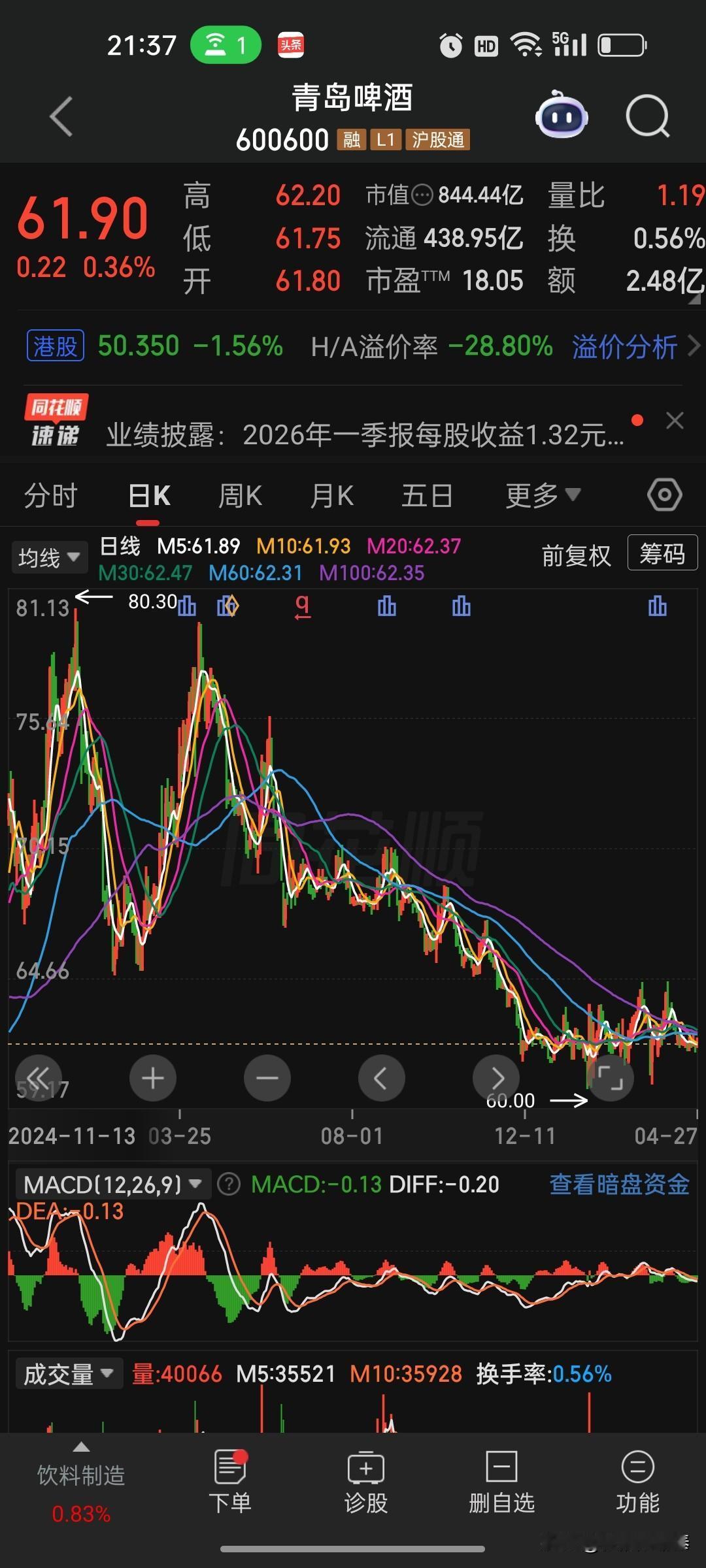 青岛啤酒(600600)2026年一季报深度点评:营收承压、盈利超预期,高端化筑牢护城河 整体结论:短期营收略有下滑,但盈利韧性远超行业,成本控制+高端化战略双轮驱动,是消费板块里的“稳增长标杆”。 一、核心数据拆解(关键结论) - 营收:102.85亿元,同比-1.54%,略低于市场预期,但降幅大幅收窄,行业淡季背景下基本稳住了基本盘。 - 归母净利润:18.00亿元,同比+5.23%,大幅跑赢营收增速,超出市场预测区间上限,盈利质量优异。 - 扣非净利润:17.06亿元,同比+6.42%,说明利润增长并非靠非经常性损益,而是主业实打实的改善。 - 每股收益:1.32元,同比+4.76%,盈利能力持续提升。 - 市盈率TTM:18.05倍,在消费龙头中处于合理偏低水平,估值性价比凸显。 二、亮点:利润超预期的核心逻辑 1. 成本控制+高端化双轮驱动,毛利率持续改善 虽然营收微降,但利润逆势增长,核心是高端产品占比提升+原材料成本下行。公司主打的经典1903、白啤、纯生等高端产品占比持续提升,吨酒价稳步上涨,抵消了销量的小幅波动。同时,大麦、包装材料等成本压力缓解,带动毛利率修复,是利润增长的核心引擎。 2. 行业淡季表现超预期,龙头韧性凸显 一季度是啤酒传统淡季,叠加宏观消费环境偏弱,行业整体增速放缓。但青岛啤酒实现了利润正增长,且增速高于行业平均水平,体现了品牌护城河和渠道控制力的优势。 3. 财务结构稳健,现金流充裕 作为央企背景的消费龙头,公司资产负债率长期维持在合理区间,货币资金充足,经营现金流健康,抗风险能力极强,在消费板块中属于“高安全垫”标的。 4. 港股溢价率-28.80%,存在估值修复空间 当前A股股价较港股折价近30%,在消费龙头中较为罕见,若后续北向资金回流或市场风格切换,存在估值修复的潜在机会。 三、隐忧:需要警惕的风险点 1. 营收增速放缓,行业竞争加剧 一季度营收同比微降,说明终端消费复苏不及预期,行业价格战、渠道战仍在持续。若后续旺季动销不及预期,营收增长压力可能进一步显现。 2. 高端化增速放缓,增长天花板隐现 国内啤酒行业高端化进入下半场,增速逐步放缓,公司高端产品的增长能否持续,将直接影响未来利润增速。 3. 原材料价格波动风险 大麦、铝罐等大宗商品价格若出现反弹,可能会对公司毛利率造成压力,影响利润增长的持续性。 4. 短期股价承压,技术面偏弱 从日线图看,股价仍处于下跌趋势中,多条均线呈空头排列,MACD指标尚未完全翻红,短期缺乏明确的上涨信号,需警惕震荡回调风险。 四、综合判断与投资建议 - 对稳健投资者:适合长期配置,作为消费板块的压舱石。公司品牌壁垒深厚,盈利稳定,股息率可观,适合追求低波动、稳健收益的资金。 - 对趋势投资者:短期需等待股价突破均线压力位(62.3元附近),并配合成交量放大,才能确认趋势反转。目前仍处于震荡筑底阶段,耐心等待更明确的信号。 - 行业展望:随着二季度消费旺季来临,叠加端午、欧洲杯等活动催化,终端动销有望回暖,营收增速大概率修复,利润增长的确定性较强。 一句话总结:短期营收略弱,但利润韧性超预期,长期高端化逻辑不变,是消费板块里“稳字当头”的优质标的,短期需关注旺季动销和股价突破信号。 以上内容均为个人观点与解读,仅供参考,不代表平台立场,也不构成任何投资或决策建议。 信息来源: 青岛啤酒2026年第一季度报告、