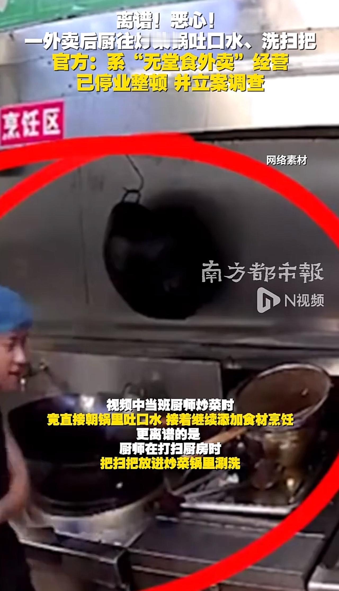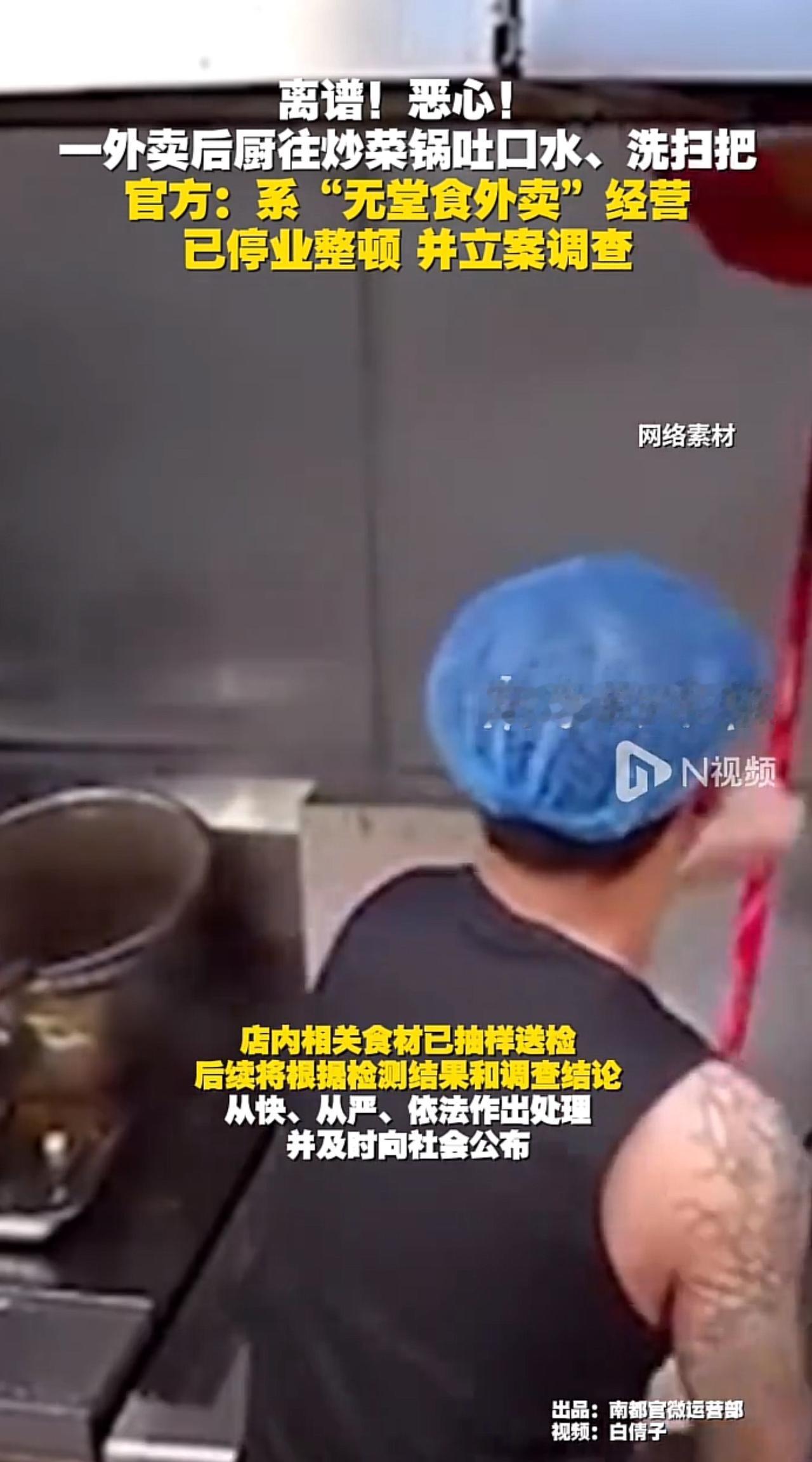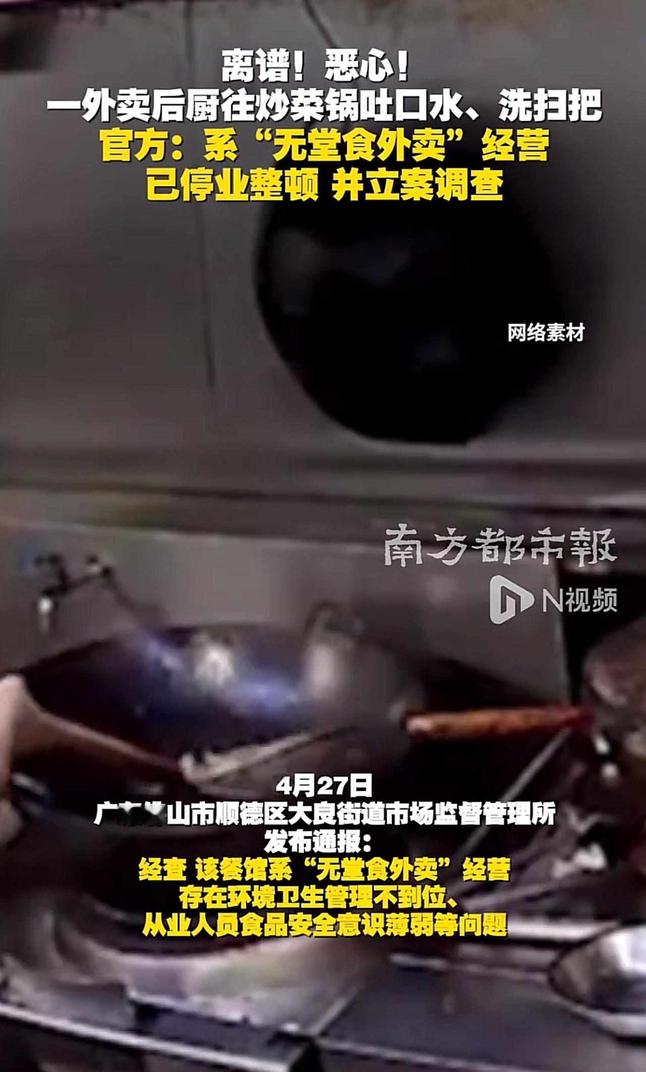 刷到佛山这家外卖店的视频,我隔夜饭都要吐出来了! 当班厨师炒菜时,居然直接朝锅里吐口水,转头又接着往锅里加食材烹饪;更离谱的是打扫厨房时,他把地上用的扫把直接伸进炒菜锅里涮洗,画面隔着屏幕都让人犯恶心。 官方也通报了,已经停业整顿立案了,就该这么管! 你说我们点个外卖,不就图个省事吗?结果是省事儿,不省心呀。看来以后以后真的不敢乱点了,点外卖必须找有堂食的。好吃不好吃放一边,必须保证干净卫生。 话又说回来,这个厨师得多么心理阴暗,他图什么呢?