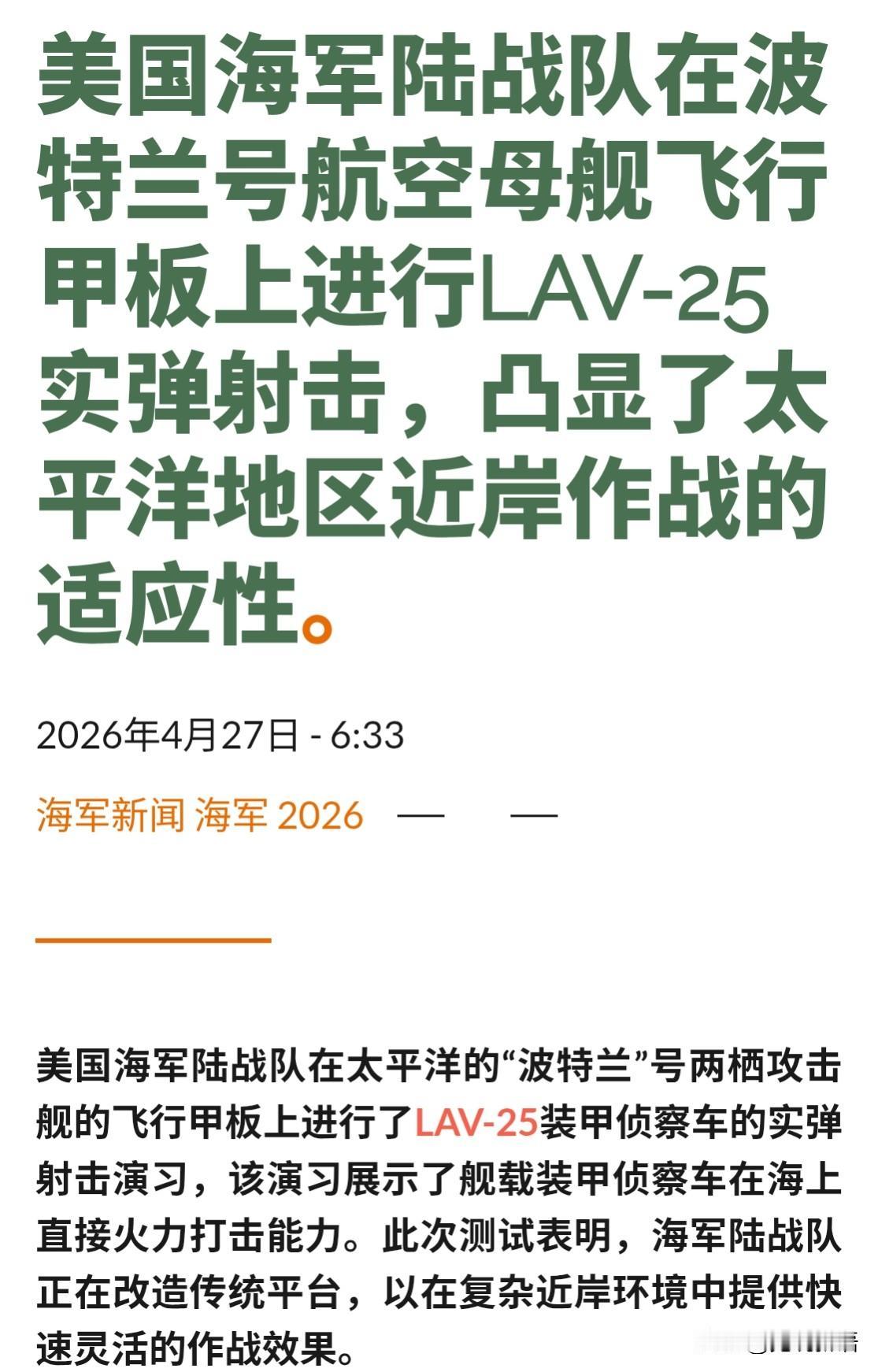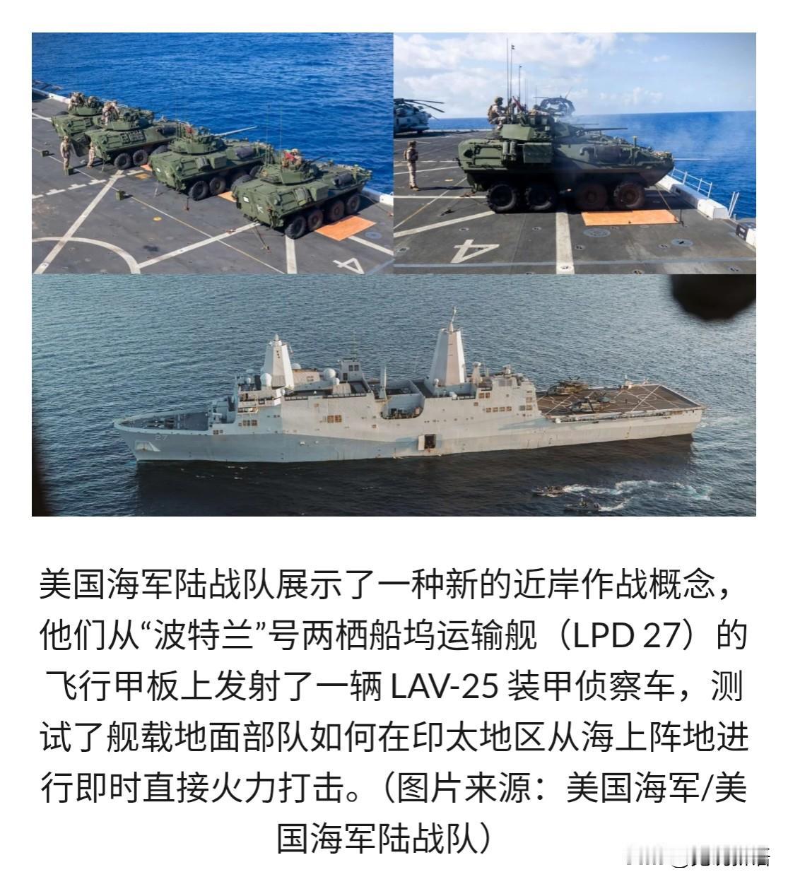 近期,美海军陆战队训练起了一个30年前曾出现过的战术,那就是陆炮上舰。他们将LAV-25装甲车开到了“波特兰”号船坞登陆舰上并固定完毕,测试了车载火力的打击效果,认为这对于未来在西太平洋地区与“高端对手”进行近岸作战时“大有用处”。 30年前,他们两支航母编队外加“塔拉瓦”级远征特遣编队大摇大摆地前来,三个编队总排水量超过50万吨,而咱们当年各种舰艇全部加起来才44万吨,能发射导弹的水面作战舰艇更是只有10万吨,它们的武器只有射程40公里的鹰击82。空军更是没有什么打击手段,彼时24架苏-27刚刚接收,对海攻击手段只有射程5公里的火箭弹和自由落体航弹,无奈之下这才想到了陆炮上舰。 现在美军又搞起了这个,可能是因为最近他们确实消耗了太多精确打击武器,没有三五年恢复不过来。想必也深刻意识到,假如有朝一日和他们心目中的“高端对手”作战,自己的昂贵弹药那必然是不足的。 不过既然都知道是“高端对手”了,还想着用这种办法在西太进行近岸作战,也不先好好想想自己能靠近吗,毕竟他的对手30年前经历过那种无能为力的痛苦,自此以后患上了严重的火力不足恐惧症,现在无论火箭炮还是导弹绝对都是量大管饱了。