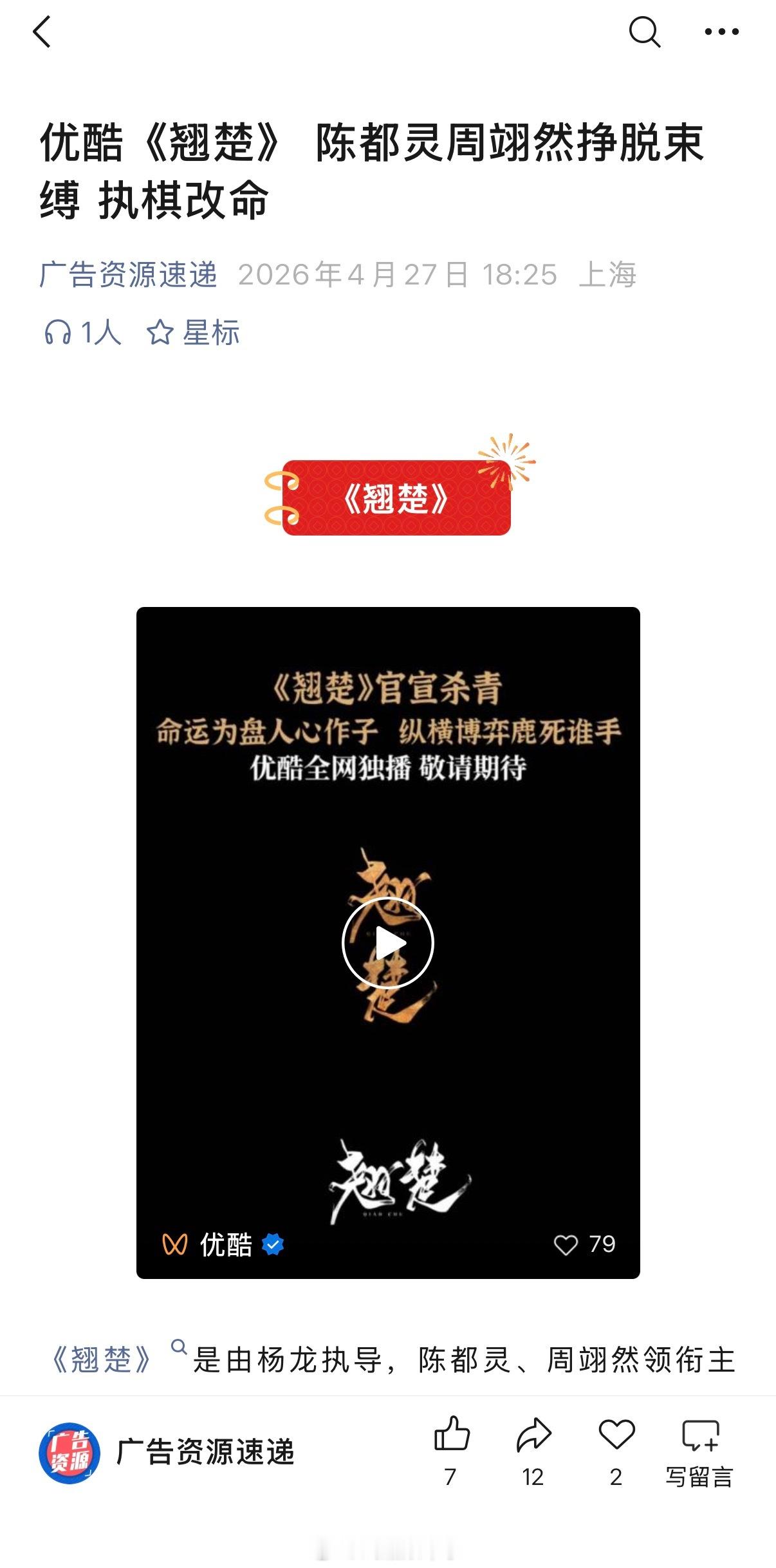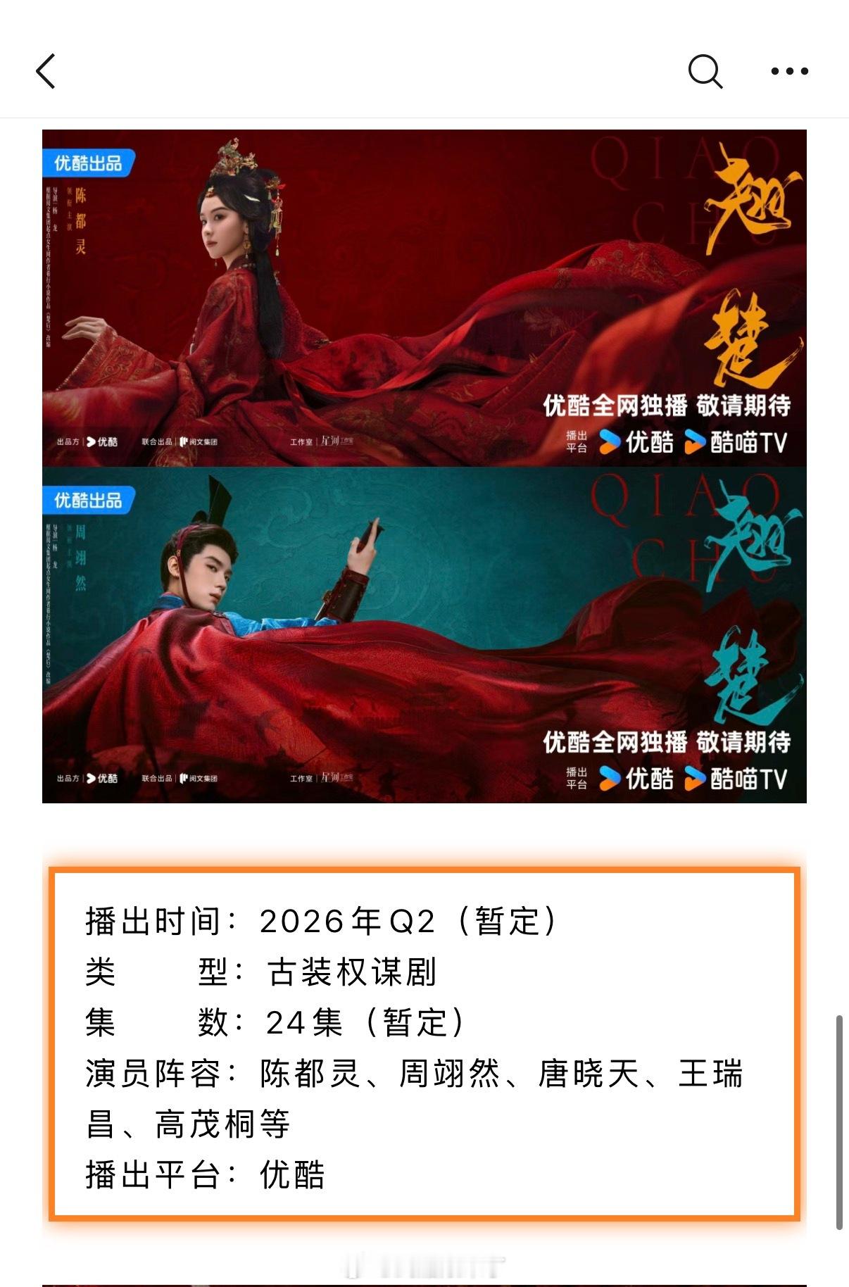 陈都灵、周翊然主演《翘楚》开启播前招商,暂定Q2播出