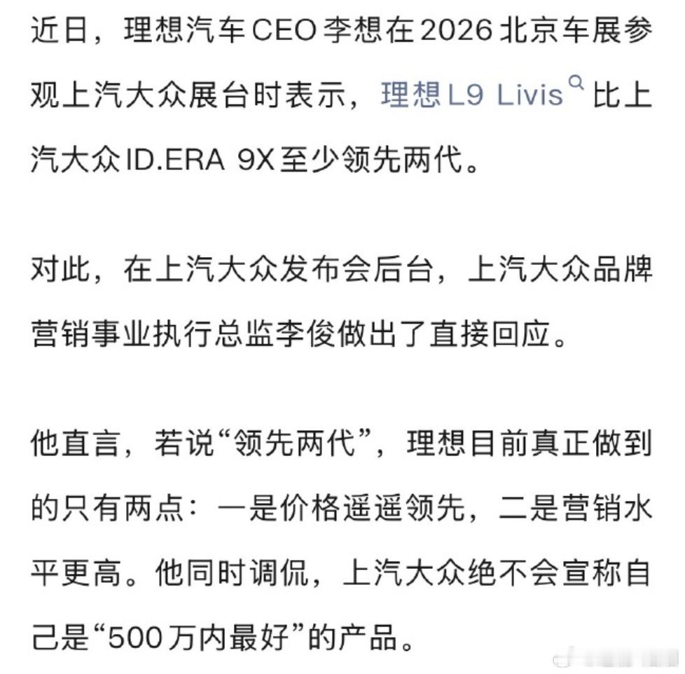 李想称理想L9领先大众9X两代 这波是大家都抓住了流量!李想表示理想L9 Livis比上汽大众ID.ERA 9X至少领先两代。上汽大众回应:若说“领先两代”,理想目前真正做到的只有两点:一是价格遥遥领先,二是营销水平更高。