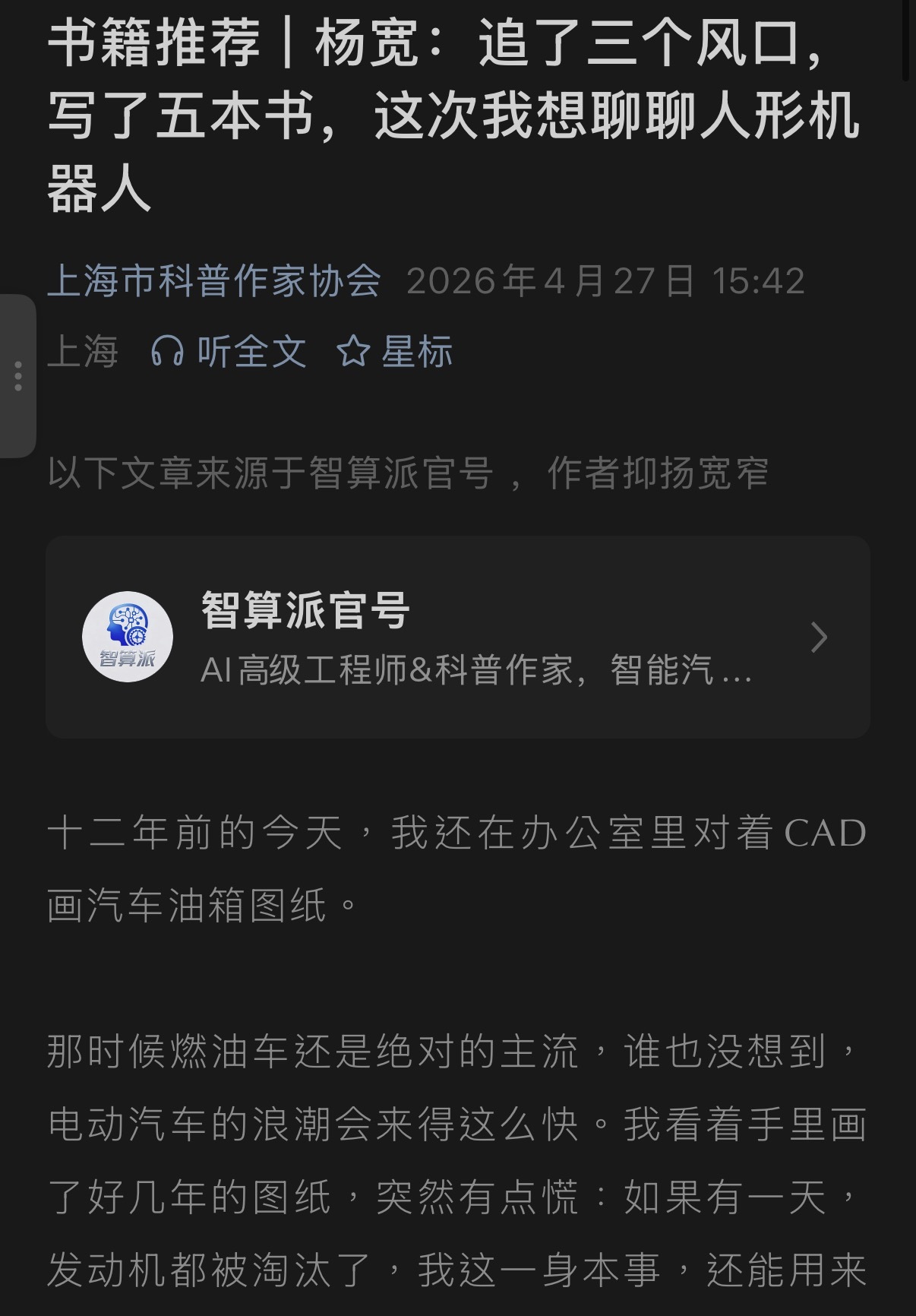今天看到上海市科普作家协会转发了我关于《一本书读懂人形机器人》的文章。