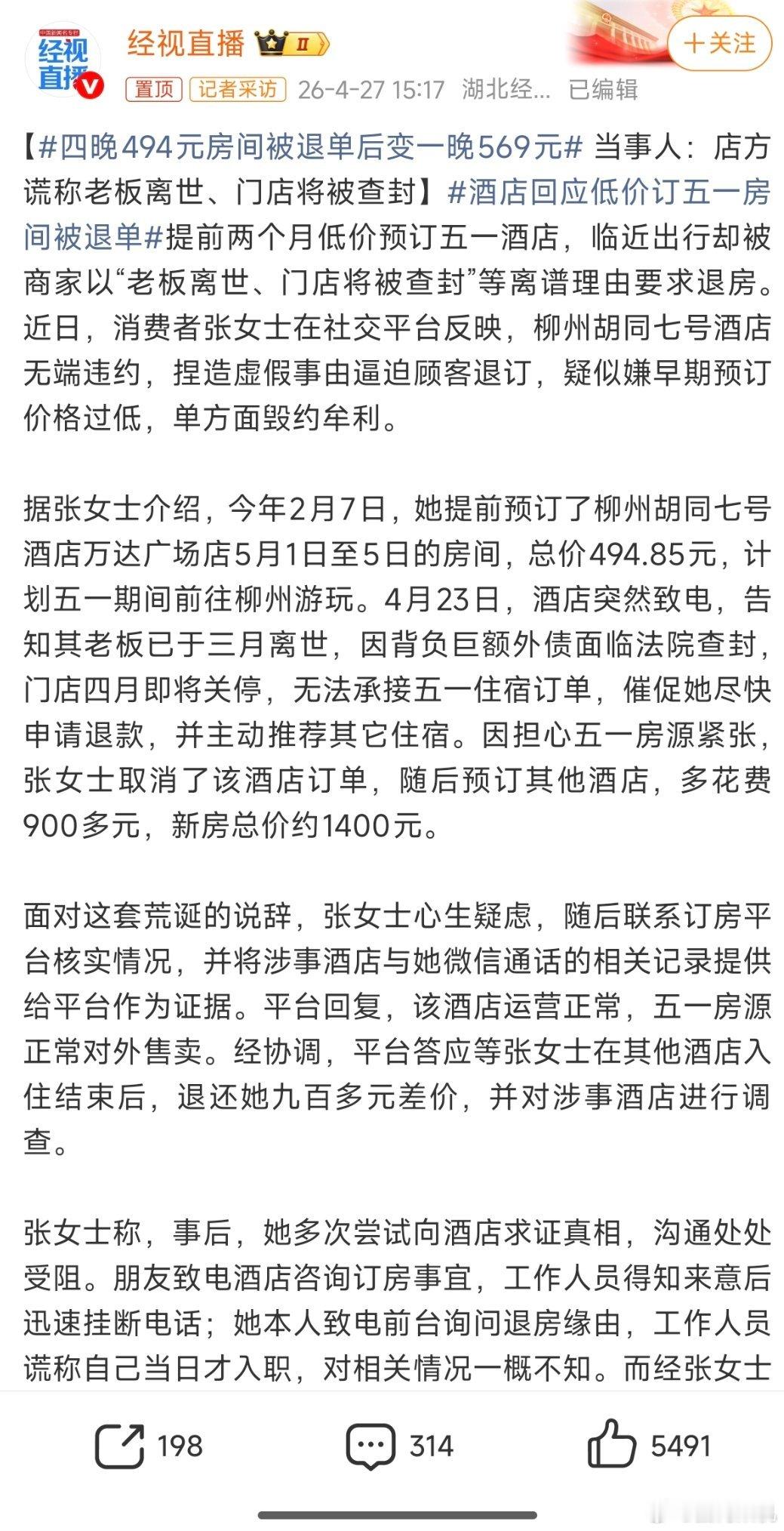 四晚494元房间被退单后变一晚569元