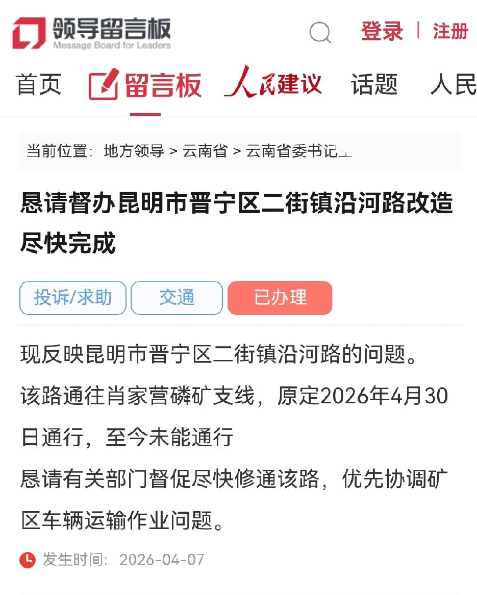 网民给云南省委书记留言反映昆明市晋宁区二街镇某路更新改造的问题 ✍📨➡️4月7日昆明网民通过领导留言板给云南省委书记的留言 恳请督办昆明市晋宁区二街镇X路改造尽快完成 现反映昆明市晋宁区二街镇X路的问题。 该路通往肖家营磷矿支线,原定2026年4月30日通行,至今未能通行 恳请有关部门督促尽快修通该路,优先协调矿区车辆运输作业问题。 发生时间: 2026-04-07 2026年04月24日 📢📢📢昆明市晋宁区二街镇官方回复 网民同志:您好! 您通过人民网领导留言板的留言收悉,经晋宁区二街镇调查处理,现将有关情况回复如下: 一、关于管制时间的最新界定。 此前流传的“2026年4月30日通车”信息已不再适用。根据昆明市公安局晋宁分局交通管理大队、昆明市晋宁区交通运输局、昆明市晋宁区二街镇于2026年3月5日联合发布的最新《通告》,沿河路路面修复施工的交通管制时间已正式调整为:2026年3月8日0时起,至2026年7月31日24时止。 二、关于工期延长的原因。 此次沿河路提升改造工程旨在彻底解决道路安全隐患,提升通行质量。由于施工路段地质条件复杂,为确保工程质量及施工安全,必须严格执行封闭施工措施。根据《通告》规定,若因极端天气、地质灾害等不可抗力因素导致工程延期,管制期限将相应顺延,不再另行发文 感谢您的理解与支持,顺祝身体健康、生活愉快! 道路 更新