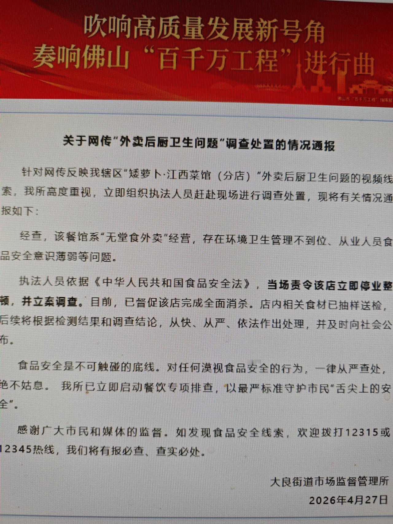 一次曝光毁灭一家店 25日,一个网友好奇的打开某外卖平台的“明厨亮灶”,竟然发现了某著名外卖连锁品牌的后厨乱像。 众所周知,这个所谓的“明厨亮灶”工程,本就是在餐饮行业,由商家自愿参加的一项展示后厨操作的活动。 通过安装在餐饮商家后厨的摄像头,任何人都可随时查看,以凸显商家的工作质量。录像内容保留14天。目前是自愿参加。 而能够或者敢参加的餐饮商家,一般来说,都是对自己的后厨操作绝对自信的。绝对的自信应该建立在严格管理之上,可惜有些商家并非如此。 “矮萝卜.江西菜馆”是主打江西菜的外卖连锁品牌。在国内至少有56家以上的门店。然而,就在4月25日,一网友登录“明厨亮灶”视频,看到了该家后厨的乱像。 视频中,当班厨师炒菜时,朝锅里吐口水,接着继续添加食材进行烹饪。更有甚者,这名厨师在打扫卫生时,居然将扫把放进锅里洗涮。 视频曝光后,该家店长回应说,厨师是热油溅嘴,本能吐一下;扫把有专用。并且承诺整改、换锅、处罚员工。 与此同时,27日当地市场监督部门通报,该店为无堂食外卖店,环境卫生脏乱,人员安全意识差,同时,对该店停业整顿立案调查。 说实话,该店为“矮萝卜.江西菜馆”的连锁店之一,这种后厨乱像曝光后,其后果非常严重。且不说官方的处理,就是其市场声誉也将破产。 56家以上的外卖连锁店,要想在外卖行业生存与发展,其品牌声誉非常重要。要不,老板会参加餐饮行业的“明厨亮灶”工程,其目的就是显示操作规范卫生。 老板有此信心,可56家门店的店长和厨师服务员等未必会严格按照规范要求来执行。比如这家被网友曝光的门店,厨师没有“厨德”,也没人性的底线。 甚至,事情曝光后,店长还试图解释。怎么可能呢?如此赤裸裸的恶劣行径,任何一个人看到,都不会再点餐的,而点过餐的,或许会提起投诉。 当然了,当这样的视频曝光后,不敢说所有,至少绝大部分人会用脚投票的。即无视这家外卖连锁品牌店,而是换新的一家。另外,消费者时不时会打开店家的“明厨亮灶”视频观看。 就是说,每个点外卖的人,他们对自己的身体健康更负责任,不会接受如此恶劣行径的。而当声誉坍塌后,这家“矮萝卜,江西菜馆”还能存在吗? 当地的市场监督部门雷厉风行的进行立案调查,或许会有非常严厉的处罚,可这,也只是在问题餐馆“身上踩一只脚”而已。 不明白的是,这家外卖连锁品牌店,各种证照是否齐全。有56家门店,也是连锁品牌,估计证照齐全,那么发放证照的部门是否也该追究责任呢? 有“明厨亮灶”工程,可非得网友曝光后,才调查处理。难道说发证照纯粹是形式合规吗?是否有点背书的嫌疑? 其实,这起网友意外曝光的厨房乱像,损失或者说影响最大的消费者和该连锁品牌店投资者了。 能被网友曝光,说明类似的行为绝对不止这一次,而店长的回应也看出该连锁品牌的管理很差。管理差,自然就会出现乱像,而乱像就是破产的征兆。 在这家门店点过外卖的消费者,若是有证据的话,或许应该对这家外卖店进行追究。毕竟,乱像伤害的是消费者的身体健康。 到此,对这个网友曝光的外卖连锁品牌店的后厨乱像,我以为,正是这家店老板或者说投资人盲目自信、缺乏严格管理的体现。 所有受害者,都应该追究这家外卖连锁店的责任,也应该追究给这家外卖连锁店背书的发证照部门。呵呵,老板摊上大事了。