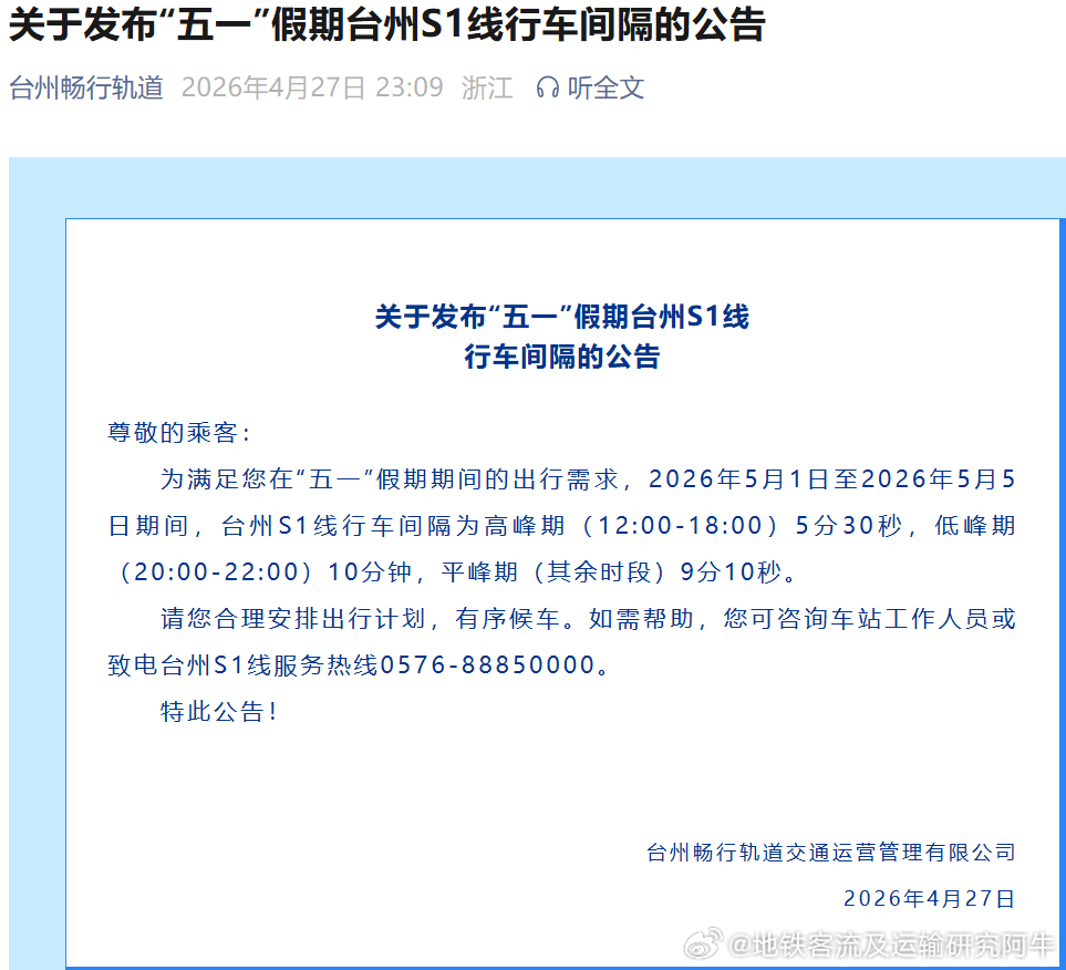 台州轨道交通【 2026年五一假期压间隔不延时】 2026年5月1日至2026年5月5日期间,台州S1线行车间隔为高峰期(12:00-18:00)5分30秒,低峰期(20:00-22:00)10分钟,平峰期(其余时段)9分10秒。