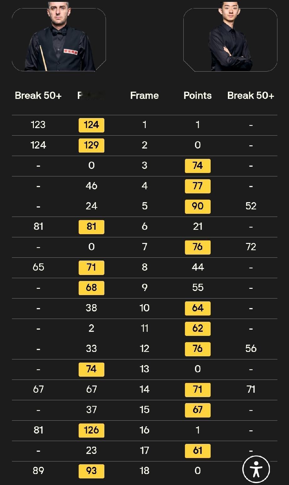 吴宜泽 10-8 马克·塞尔比 4月27日,斯诺克世锦赛正赛第二轮,吴宜泽与塞尔比第三阶段比赛开始。前16局结束,吴宜泽发挥炸裂!9-7领先打出两杆破百的四届世界冠军塞尔比。 第三阶段第17局,吴宜泽61-23获胜,比分10-7领先塞尔比。塞尔比单杆89分拿下第18局。