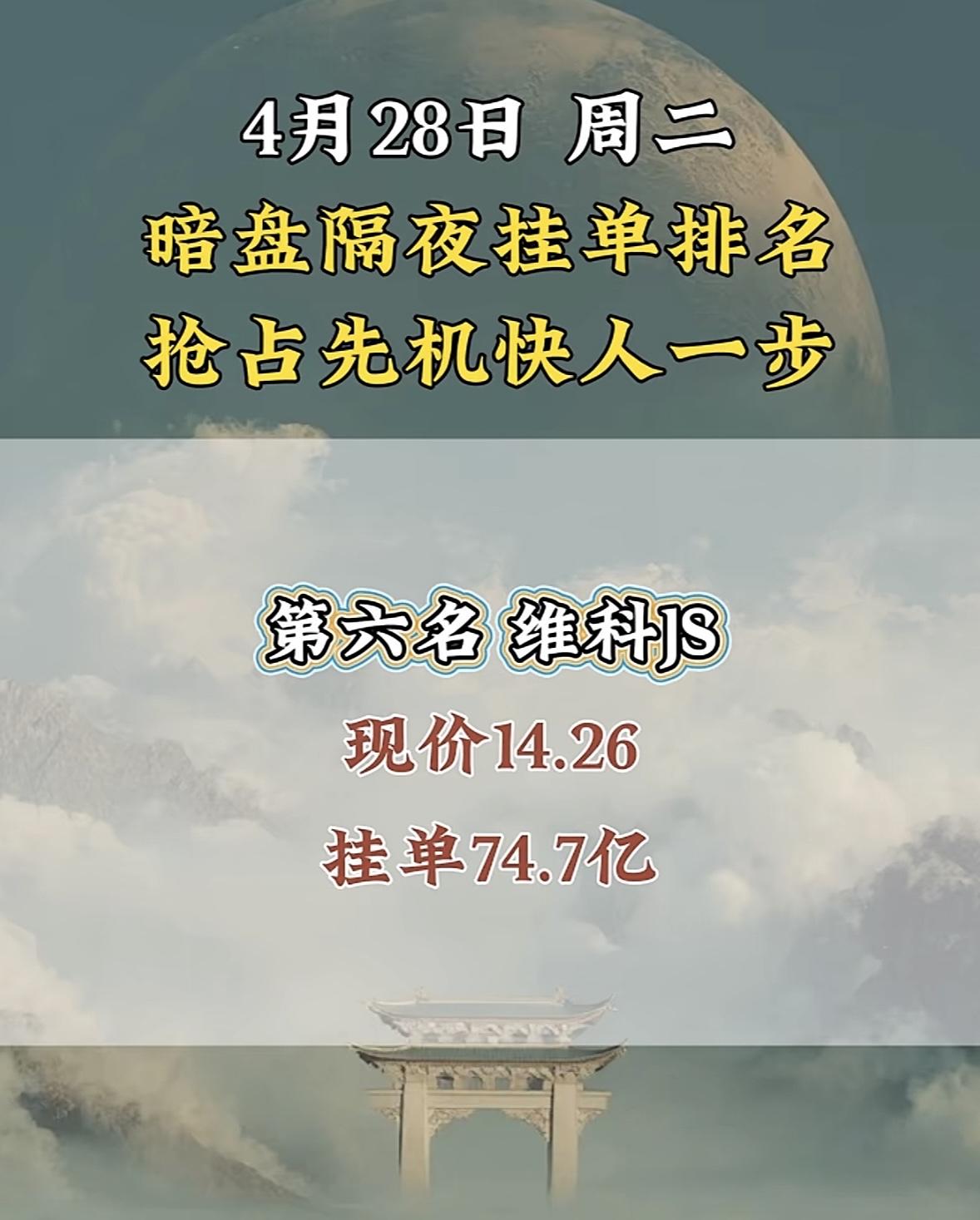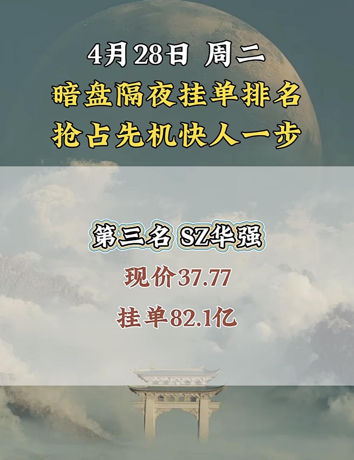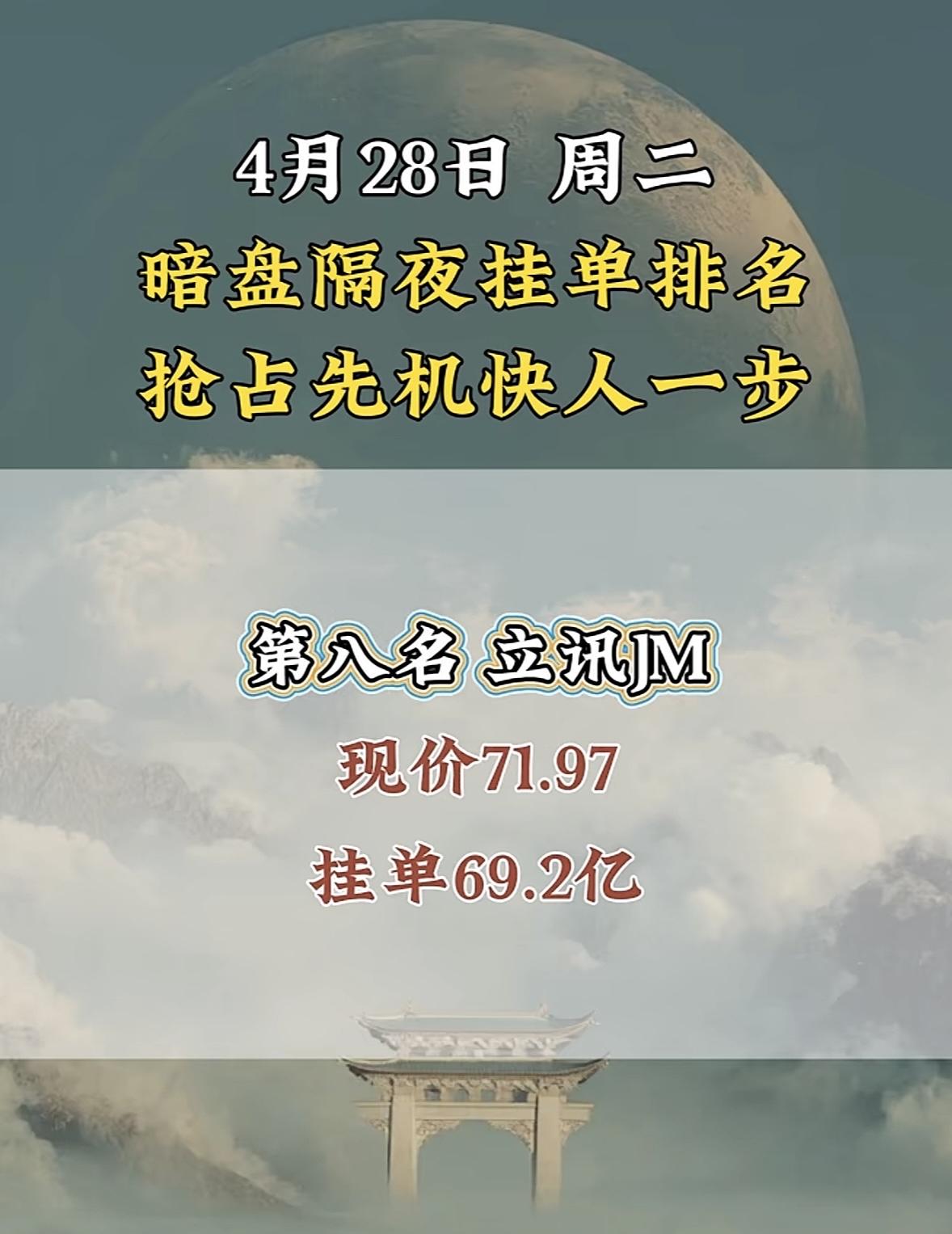 4月28日周二暗盘隔夜挂单排行榜揭晓 4月28日立讯精密在暗盘排名第八,现价71.97,这情况很值得说道。在股票市场里,暗盘表现就像是一场无声的较量,立讯精密能排到第八,那绝对是抢占了先机。 就好比大家都在同一起跑线竞争,它已经冲在前面。这个股价71.97,说不定后续还有上升空间。这让我想起那些在市场中敏锐捕捉机会的投资者,他们要是抓住了立讯精密这个机会,说不定就能在这场投资博弈中收获满满。不过,股市风云变幻,谁也不知道它之后会怎样,且看它后续表现吧。