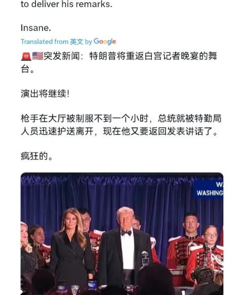 特朗普够爷们,够硬气!不是我吹,换作咱们见过的大多数政客,遇到这种事,早跑得没影了,哪还敢回去接着站舞台、发表讲话? 事情大家应该都听说了,特朗普出席白宫记者协会晚宴,本来这事儿还被外界解读成他和美国主流媒体“破冰”的信号,结果晚宴刚进行到一半,枪声就响了。 当晚欢迎辞结束没多久,特朗普还没来得及发表演讲,一名枪手就持枪冲过安检关卡,和特勤局人员交火,现场几百号记者、政商界人士吓得全趴地上避险,乱成一团。 按照常理来说,这时候最该做的是什么?肯定是赶紧撤离,先保证自己的安全再说。 当时在场的副总统万斯,第一个就被护送着离开了现场,其他不少官员也跟着慌忙撤离,这都能理解,趋利避害是人的本能,尤其是政客,身家性命、政治前途都在,没人愿意拿自己冒险。 特勤局一开始也建议特朗普取消晚宴,先避险,这也是出于安全考虑,合情合理。 但特朗普偏不,枪手被制服后,他竟然表示今后要继续举办宴会。 说实话,看到这一幕,我是真的有点佩服,不是佩服他的政治立场,也不是吹捧他这个人,而是佩服他这份在危险面前不怂、不逃、不半途而废的劲儿。 咱们见过太多政客,平时在台上说得天花乱坠,什么“为人民服务”“勇于担当”,可一旦遇到真危险、真麻烦,跑得比谁都快,早就把自己说过的话抛到九霄云外了。 可能有人会说,特朗普这是作秀,是为了拉选票,故意装硬气,我不否认,政客的任何行为都可能带有政治目的,特朗普也不例外,但咱们得讲道理,作秀也得有那个胆子,有那个底气。 让那些平时只会喊口号、遇到危险就跑路的政客,去装这个硬气,他们敢吗?根本不敢。 因为一旦出了意外,丢的是自己的性命,毁的是自己的政治前途,他们可不会拿自己的身家性命去作秀。 这次白宫记者晚宴,特朗普本来就和媒体的关系很紧张。 在这种情况下,他本来就面临着不小的压力,再加上枪击事件的突发,换作别人,可能就借坡下驴,取消晚宴,既避免了危险,也避开了和记者的正面冲突,可谓是“一举两得”。 但特朗普没有这么做,他选择重返现场,完成演讲,这本身就需要极大的勇气。 我并不是说特朗普是个完美的人,他身上的争议太多了,比如频繁攻击媒体、提起天价诽谤诉讼、利用总统身份推销代币被质疑利益输送,这些都值得诟病。 但咱们评价一个人,不能一棍子打死,得客观公正。 就事论事,在这次枪击事件中,他的表现,确实比很多政客都强,比那些只会明哲保身、趋利避害的政客,多了一份担当,多了一份硬气。 就像这次白宫记者晚宴上,除了特朗普,其他官员几乎都是第一时间撤离,没有一个人站出来说“活动继续”,没有一个人愿意留下来稳住现场的人心。 这就是现实,这就是很多政客的真实面目,平时喊着担当,关键时刻全怂了,而特朗普,恰恰在这个时候,用行动戳破了这种“伪担当”的面具。 咱再对比一下其他国家的政客,遇到类似的情况,大多也是选择紧急撤离、终止活动。 比如几年前,某国领导人出席公开活动时,遇到疑似袭击事件,不管真假,立刻被安保人员护送撤离,活动直接取消,事后也只是发表了一段简短的声明,根本没有重返现场的勇气。 这并不是说他们胆小,而是他们习惯了“明哲保身”,习惯了把自己的安全放在第一位,至于活动是否能继续,现场的人是否慌乱,似乎都没有自己的安全重要。 说来说去,特朗普这次的操作,之所以让人觉得“真爷们”,并不是因为他有多伟大,而是因为他在关键时刻,没有像其他政客那样趋利避害、临阵脱逃,而是选择了坚守,选择了完成自己该做的事。 这一点,就足以碾压很多只会喊口号、没担当的政客。 当然,我还是要强调,我不吹捧特朗普,也不认同他的所有做法。 他的很多政策、很多言论,确实有很大的争议,甚至很离谱。但就事论事,在这次枪击事件中,他的表现,确实值得点赞。 至少他让我们看到,不是所有政客,都是遇到危险就跑路的软骨头;至少他让我们明白,担当不是挂在嘴边的口号,而是关键时刻的挺身而出。 其实评价一个人,要客观公正,不能因为他有争议,就否定他所有的行为,也不能因为他做了一件值得肯定的事,就把他捧上神坛。 特朗普这次的表现,确实够硬气、够爷们,也戳破了很多政客的“伪担当”。 至于他的政治目的是什么,我们不用去过多揣测,就冲他在危险面前不怂、不逃、坚守到底这一点,就比很多政客强太多了。 (每期带大家了解一点不一样,点赞关注,主页的内容更加精彩!) 对此大家怎么看?