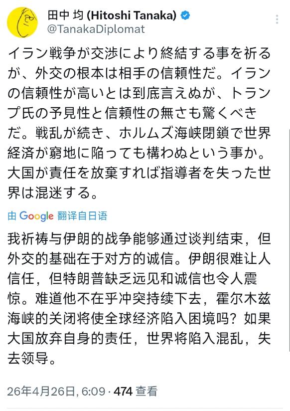 日本前外交官吐槽特朗普和伊朗,实则是自己不敢说实话 日本前外务副大臣田中均,4月26号发了段话,看似既说伊朗不可信,又骂特朗普没远见、没诚信,说得挺公正,其实就是装糊涂、自我麻痹,压根不敢直面日本的真实处境。 咱们先掰扯掰扯他的话,他说外交得讲诚信,一边嫌伊朗不可信,一边骂特朗普没远见,听着不偏不倚,其实就是捡软柿子捏。 特朗普行事没谱、出尔反尔,全世界都知道,就说这次美伊谈判,伊朗刚去巴基斯坦谈完,特朗普就突然取消美方行程,还嘴硬说浪费时间,让伊朗直接给他打电话,态度特别傲慢,田中均骂他,确实没毛病。 可关键问题来了,他明知特朗普不靠谱,却不敢多问一句:日本明明跟着倒霉,为啥只能眼睁睁看着?他担心霍尔木兹海峡关闭拖垮全球经济,其实最该慌的是日本自己。 日本啥资源都缺,94%的石油都从中东进口,还得全靠霍尔木兹海峡运过来,这海峡要是关了,日本的石油就断供了,工厂停工、老百姓电费燃气费暴涨,损失大了去了。 田中均心里跟明镜似的,最倒霉的是日本,可他为啥不敢说根源?因为日本自己绑死了美国。 安全上,日本全靠美国保护,每年花巨额钱养驻日美军,还得高价买美国武器,特朗普让他多花钱,他也不敢反驳。 更讽刺的是,号称保护日本的美军,全被调去中东打伊朗,把日本当临时客栈,日本连话语权都没有。 经济上,日本更离不开美国。为了让美国少收关税,日本签了不平等协议,给美国投了几千亿美元,相当于给美国输血;想摆脱中东石油依赖,四处找油,最后还是得买美国的,说白了就是换个依赖对象,还是没逃开美国的手掌心。 田中均作为老外交官,这些事他能不知道?他说伊朗不诚信,其实伊朗只是维护自己的权利,只是不符合美日的利益;他骂特朗普没远见,可特朗普只想着美国自己,不管盟友死活,这些他都清楚,就是不敢说美国半个不字。 说白了,田中均就是不敢得罪美国,装公正吐槽别人,实则是自我麻痹。他的话听着有道理,其实没说到点子上,日本的麻烦,不是伊朗和特朗普造成的,是自己非要绑在美国战车上,放弃了自己的话语权。 这种不敢说真话的样子,不光解决不了问题,还让人看清了日本外交的无奈和虚伪,纯属自欺欺人。