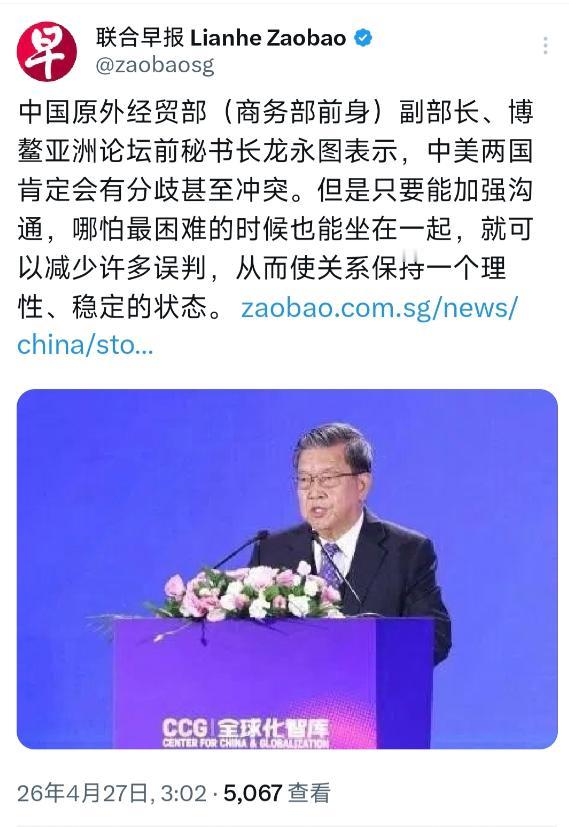4月27日,新加坡联合早报登了龙永图的一段话,特别实在。龙永图以前是中国外经贸部副部长,就是现在商务部的前身,还当过博鳌亚洲论坛秘书长,一辈子跟中美做生意,说话有分量。 他直白说,中美肯定有分歧、有冲突,这很正常,但再难也得坐下来沟通,这样才能少闹误会,关系才能稳。 说白了,他就是劝双方:别赌气硬刚,坐下来聊才管用,这不是天真,是别再亏下去的底线,再斗下去,谁都没好处。 大家都清楚,中美是全世界最有钱、最有影响力的两个国家,他俩的关系好不好,全世界都受影响。 咱们常说“合则两利,斗则俱伤”,中国一直都懂,也一直这么做,但美国现在就是没开窍,一门心思跟中国对着干、瞎折腾。 有人可能觉得,龙永图说“再难也得坐下来”太天真,其实一点不。现在中美闹得挺僵,美国不想着合作赚钱,反倒把做生意的事搞成政治事,天天琢磨加关税、卡科技,就怕中国超过它、抢了它的霸权。 这做法看着强硬,其实是自己坑自己,美国企业亏惨了,老百姓也跟着遭罪,连全球发展都被拖慢了。 就说美国搞的关税战,2018年就开始给中国商品加税,到现在,3700亿美元的中国货都要多花钱。 美国本来想搞垮中国企业、让自己的工厂回来,结果反倒是自己国内物价涨得厉害,四年里食品杂货贵了25%,相当于政府变相给老百姓加税。 美国企业也亏大了,比如美光科技,以前靠中国市场赚不少钱,现在因为美国封锁,收入大降,还得花钱游说政府继续搞封锁,纯属本末倒置。 还有科技封锁,美国对中国芯片管得越来越严,最近更是变本加厉,连咱们常用的光刻机都不让出口,还不让人家给咱们修设备,就是想把中国芯片产业卡死。 可笑的是,美国商务部长自己都承认,这做法极度愚蠢,不但拦不住中国,还逼着中国自己搞研发,彻底摆脱美国技术。 美国这么折腾,说白了就是怕中国发展太快,心里慌。但它忘了,现在早就不是一家独大的时代了,中美合作早就你中有我、我中有你,想彻底分开根本不可能。 中美贸易从建交时的不到25亿美元,涨到现在快7000亿美元,美国的大豆、棉花一半都出口到中国,真斗起来,美国农民、企业都得亏哭。 咱们普通人别觉得中美关系跟自己没关系,其实关系大得很。中美好好合作,咱们能买到便宜货,企业能赚钱、老百姓能就业;要是一直斗下去,物价越来越高,工作越来越难,最后亏的还是咱们老百姓。 龙永图的话,就是给双方提个醒:有分歧可以谈,别一直斗,别放弃沟通。中国懂合作共赢的理,也愿意坐下来谈,现在就看美国能不能放下架子,别再瞎折腾。 毕竟斗来斗去没有赢家,只有坐下来好好谈,一起赚钱,才是对大家都好的事。