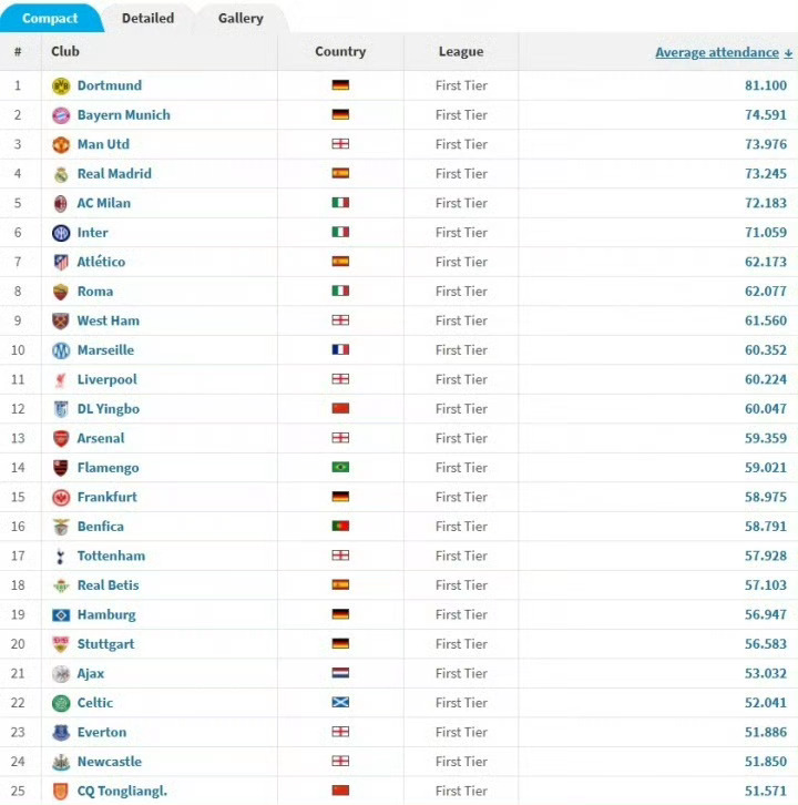 据德转数据统计,大连英博主场梭鱼湾的平均上座人数为60047人,位列全球第12,甚至高于阿森纳酋长球场的59359人。此外,重庆铜梁龙主场平均上座51571人,位列全球第25。
