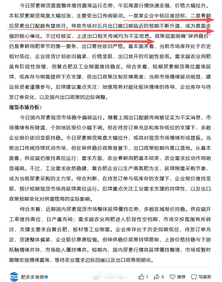 今日尿素期货盘面整体维持震荡运行态势,午后尾盘行情快速走强,价格大幅拉升。本轮尿素期货尾盘大幅拉涨,主要受出口传闻驱动。一是某企业中标印度招标,二是春耕后尿素出口配额有望放开。导致市场对五月出口窗口期临近的预期不断升温,成为盘面走强的核心催化。不过经核实,上述出口相关传闻均为不实信息。政策层面明确“保供稳价”仍是春耕用肥季节的第一要务,出口管控依旧严格。基本面来看,当前市场库存处于历史相对低位,企业排货计划依旧偏紧,价格坚挺,出口放开的可能性极低。需求端农业用肥虽有阶段性放缓,但复合肥及工业刚需维持稳定。综合来看,短期尿素期货高位震荡延续,低库存与刚需提供下方支撑,但出口政策压制反弹高度;当前市场情绪驱动明显,建议投资者谨慎参与。后续建议重点关注:地缘局势对能化板块情绪的传导、企业库存与待发订单变化,以及国内出口政策的边际调整。(来源:肥多多)尿素期货