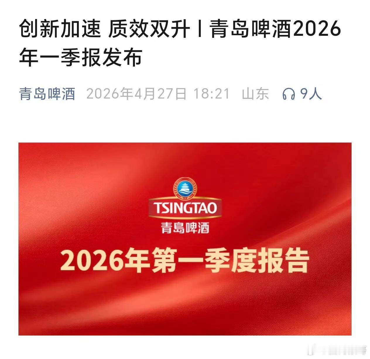 肖战作为品牌代言人的青岛啤酒发布2026年第一季度财报,产品销量220.2万千升,实现营业收入人民币102.9亿元;实现归属于上市公司股东的净利润人民币18亿元,同比增长5.2%,再创历史新高!肖战真是财神呀,不仅影视剧口碑、收视率、票房、招商在赚,代言的品牌也在大赚特赚!