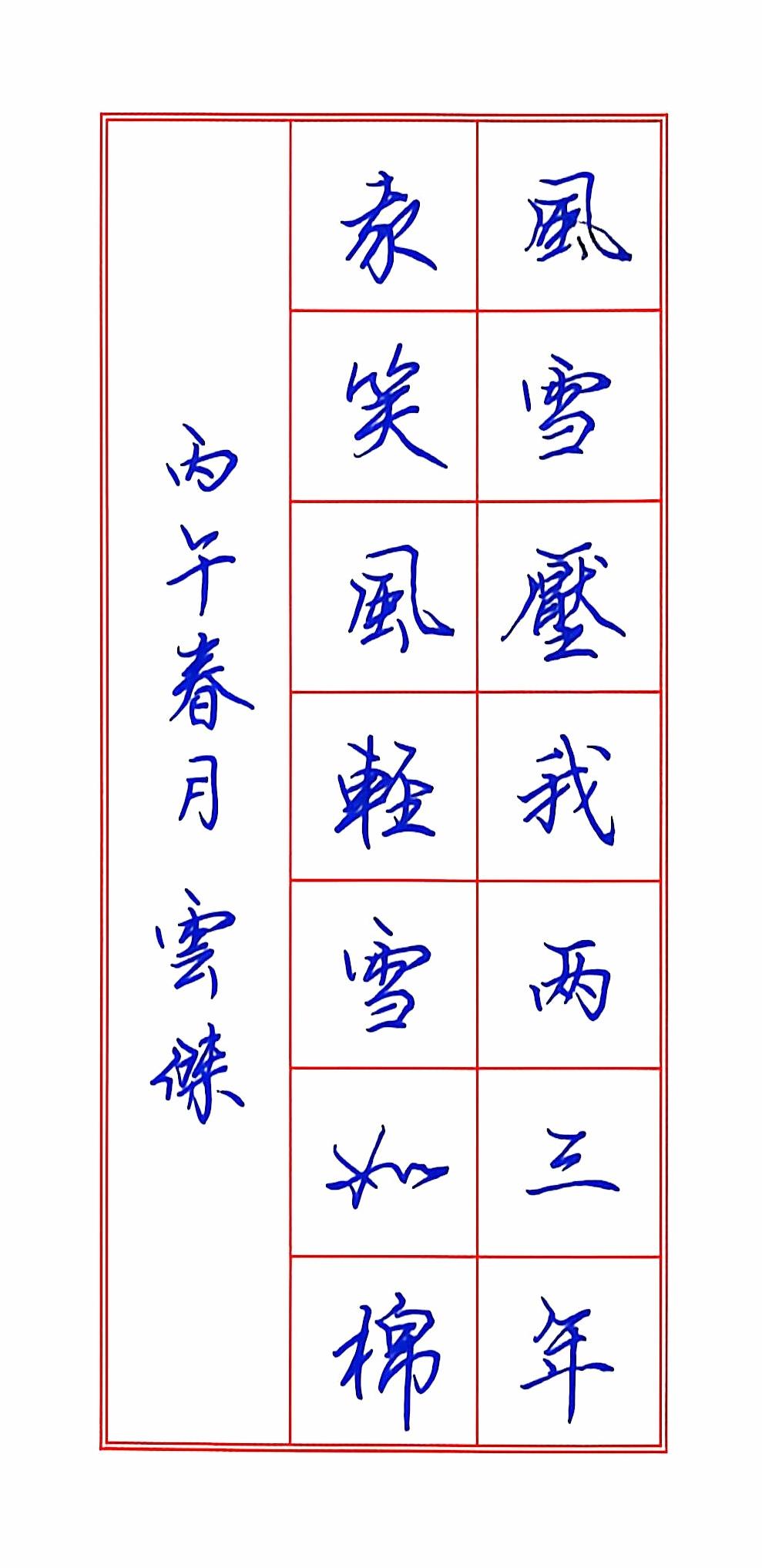 风雪压我两三年,我笑风轻雪如棉。手写硬笔 抖音书法