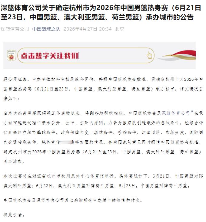 中国篮球之队公布了6月下旬的中国男篮热身赛承办城市,杭州将在6月21-23日举办中国男篮、澳大利亚男篮、荷兰男篮之间的热身赛。
