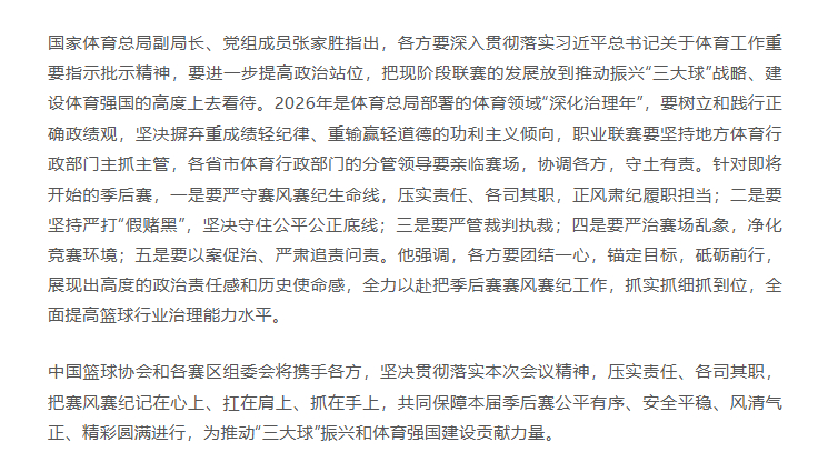 “职业联赛要坚持地方体育行政部门主抓主管,各省市体育行政部门的分管领导要亲临赛场,协调各方,守土有责”