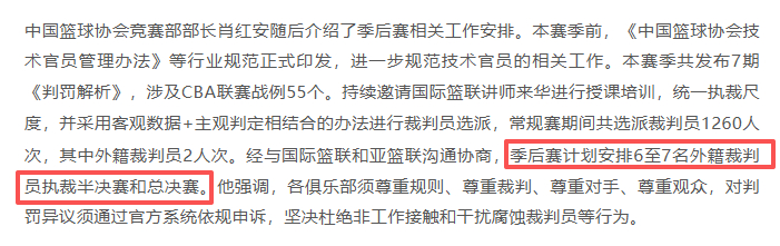 中国篮协:计划安排6-7名外籍裁判执裁半决赛和总决赛。