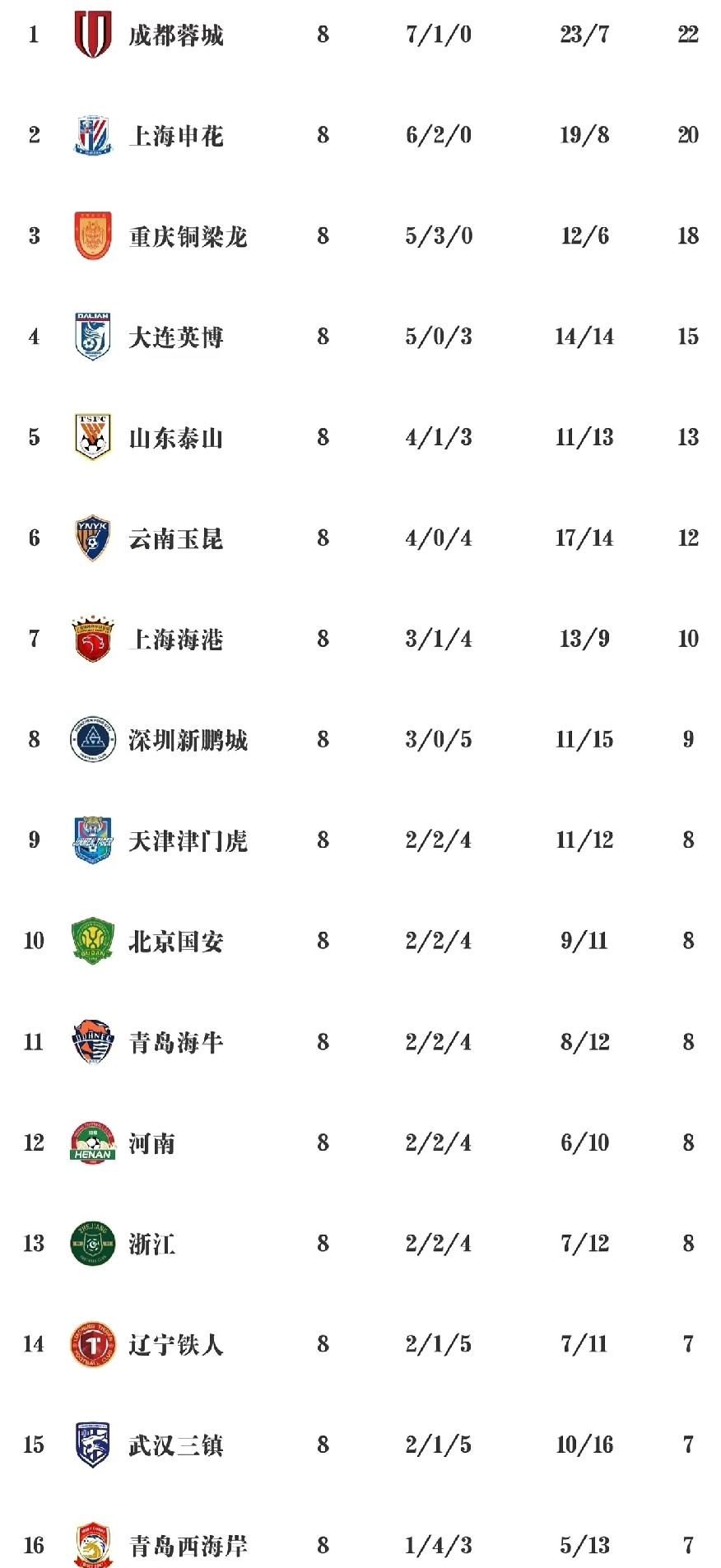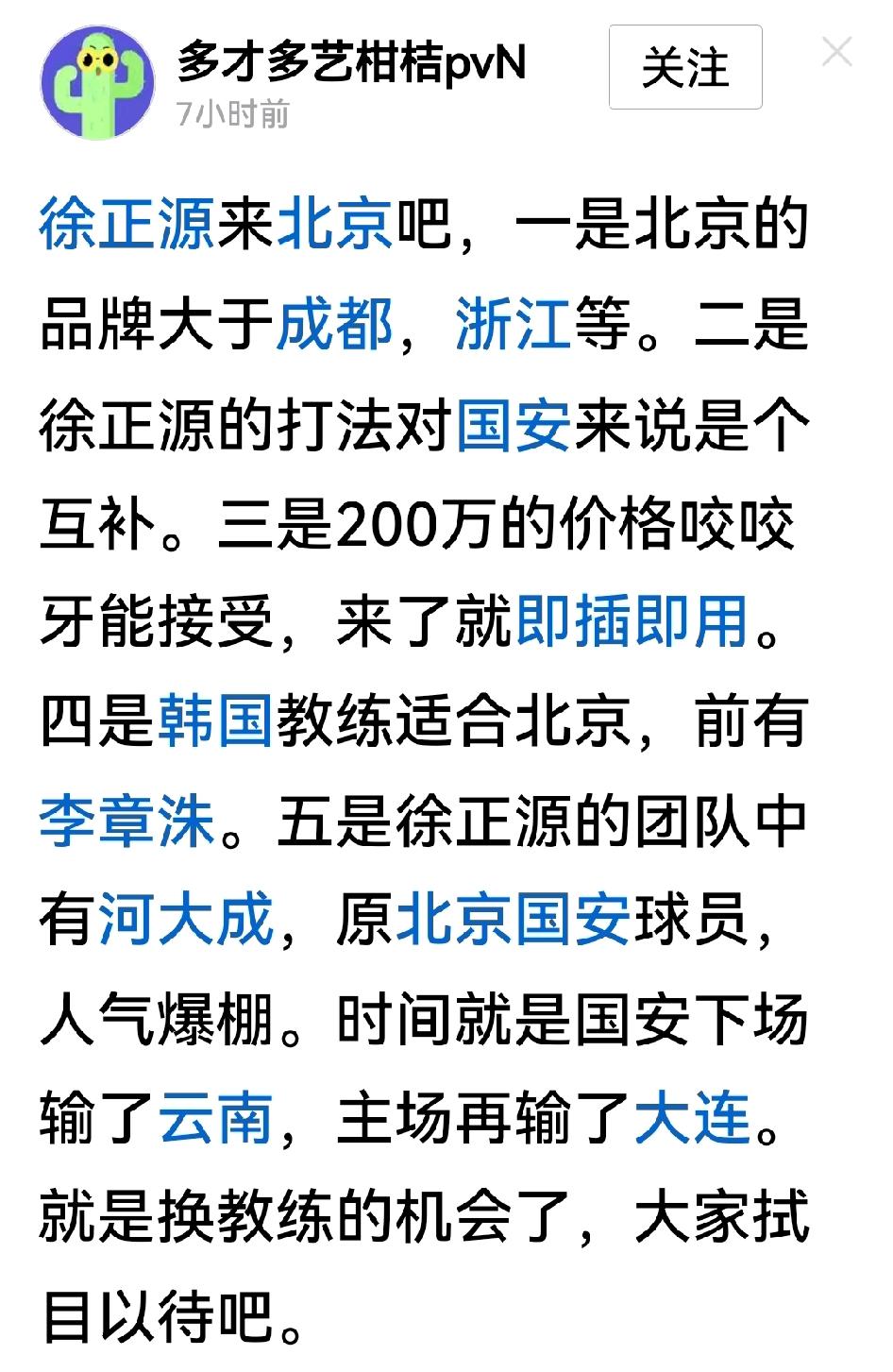 面对北京球迷的呼唤,徐正源说:别急,我再看看! 刚刚刷到北京球迷喊徐正源执教国安,理由一讲就是五大点。但你站到我老徐的角度,也要讲五点:一曰钱不是问题,问题是你要给够钱;二曰教练团队我来定,别给我耍心眼;三曰内外援的引进,必须韩国经纪人操作;四曰谁上场谁下课啥阵型我拍板,不要听媒体和球迷扯蛋;五曰给我充分的信任,别给我整小圈圈。 再说,按中超前八轮实际战绩(图三),武汉、辽宁、浙江、海牛、津门虎、西海岸,甚至新鹏城、泰山,哪个不对我老徐睁大双眼?请容我慢慢看,慢慢选!