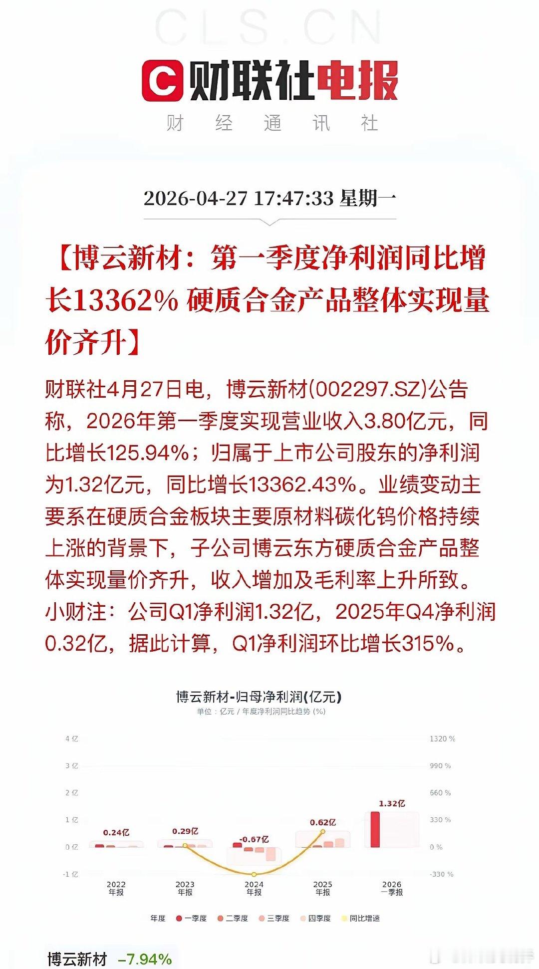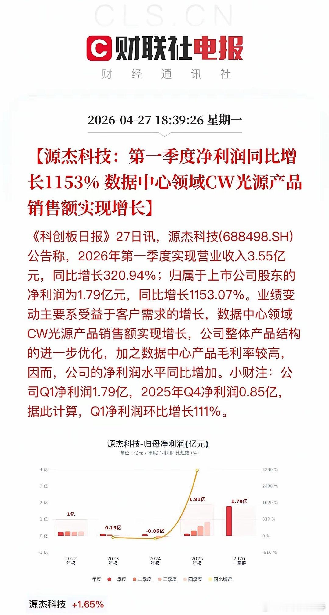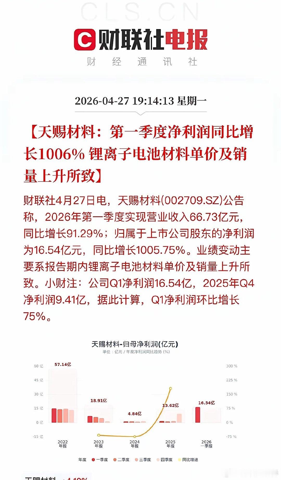 盘后大利好!近40家A股公司发布“喜报”!晚间,A股一季报披露进入高潮,近40家A股公司“报喜”!多家公司净利润增幅超10倍,博云新材更是以133倍的惊人增速领跑全场。一、新能源沉寂许久的锂电和光伏板块此次可谓“火力全开”,碳酸锂涨价驱动下,多股实现超10倍增长。·天齐锂业:Q1净利润18.76亿,同比暴增近17倍,环比超5倍增长,受益于锂产品销售均价大幅上涨。·永兴材料:紧随其后,净利同比增长155%,同样受益于碳酸锂价格走高。·天赐材料:净利润16.54亿,同比增长超10倍。·湖南裕能:净利润13.56亿,同比增幅高达1338%,印证了磷酸铁锂正极材料需求的旺盛。·永太科技:凭借锂电板块销售增加,净利润增长890%。·富祥药业:受益于新能源行业景气度提升,净利润增长超26倍。·融捷股份:净利润2.78亿,同比增长1296%,锂精矿产销量增加及价格上涨带动采选业务利润大增。·阳光电源:作为逆变器龙头,Q1净利润环比增长45%,但同比下滑40%,主因销售规模下降及汇兑损失影响。二、硬科技AI算力需求从预期走向业绩兑现,光模块、芯片设计、半导体设备全面开花。·东山精密:营收破百亿,净利润大增143%,光模块业务实现收入翻倍。·剑桥科技:同样因高速光模块业务规模扩大,净利润大增276%,环比更是暴增27倍。·源杰科技:受益于数据中心CW光源产品销售额增长,净利润增幅高达1153%。·思瑞浦:在光模块、服务器等领域持续放量,净利润大增577%。·中微公司:营收29.15亿,净利增长197%,高端刻蚀设备在先进逻辑和存储器件制造中持续放量。·鼎龙股份:CMP材料业务持续增长,净利润增78%。·南亚新材:覆铜板产品量价齐升,净利润大增611%。·紫光国微:特种集成电路业务回暖,净利润增长180%。·澜起科技:受益于DDR5子代持续迭代,净利润增长61%。· 协创数据:净利润7.50亿,同比增长343%,销售收入增长与毛利率提高共同驱动。·方正科技:净利润2.32亿,同比增长195%,PCB业务平均销售价格和销量双增。·中电港:净利润1.58亿,同比增长87%,存储芯片价格上涨带动客户需求提升。·宝鼎科技:净利润6604.65万,同比增长268%,覆铜板及铜箔产品销量增加。三、周期资源钨、铜、贵金属等资源品涨价,航运维持高景气。多股净利润增幅超10倍,周期弹性尽显。·博云新材:净利润1.32亿,同比增长13362%,硬质合金产品实现量价齐升。·铜冠铜箔:净利润1.06亿,同比增长2138%,铜箔产品售价上涨是主因。·湖南白银:受益贵金属价格上涨,净利润增456%。·章源钨业:因钨价上涨,净利润大增796%。·中远海能:Q1净利润21.73亿,同比增长207%,受益于外贸油运市场保持高位。四、高端制造商业航天、机器人、船舶等新质生产力方向表现突出。·浙海德曼:净利润1656.53万,同比增长680%,订单增加、交付能力提升。·恒工精密:净利润6195.84万,同比增长211%,新增人形机器人本体业务贡献显著增量。·松发股份:净利润10.93亿,同比增长330%,船舶开工建造及交付量不断增长。·金信诺:净利润2112.73万,同比增长560%,海外战略及内部业务结构优化推升核心盈利能力。·汇川技术:净利润10.13亿,同比下降23%,工业自动化和新能源车业务增收不增利。·ST臻镭:净利润3958.11万,同比增长76%。电源管理芯片、射频收发芯片等卡位卫星互联网产业链。五、医药/游戏·沃森生物:净利润1.11亿,同比增长4082%,主要因会计估计变更减少坏账计提及研发费用下降。·药明康德:净利润46.52亿,同比增长27%,在手订单同比增长23.6%,CRDMO模式效能持续释放。·巨人网络:净利润10.8亿,同比增长211%,主要系游戏收入大幅上升,环比增幅也超过3倍。本轮一季报高增长集中在半导体(AI算力)、锂电材料、有色金属三大方向:1. 硬科技自主可控:半导体设备、光模块国产替代加速,AI算力需求持续爆发,支撑业绩高增。2. 周期品量价齐升:锂、钨、贵金属价格触底反弹,周期股盈利弹性尽显。3. 新兴产业开花:机器人、商业航天、游戏等赛道快速成长。近40家公司密集“报喜”,超10倍增幅频现。高景气赛道的硬核业绩,有望成为市场反弹的核心驱动力。需注意:阳光电源受汇兑拖累,汇川技术增收不增利,相关方向仍需保持警惕。