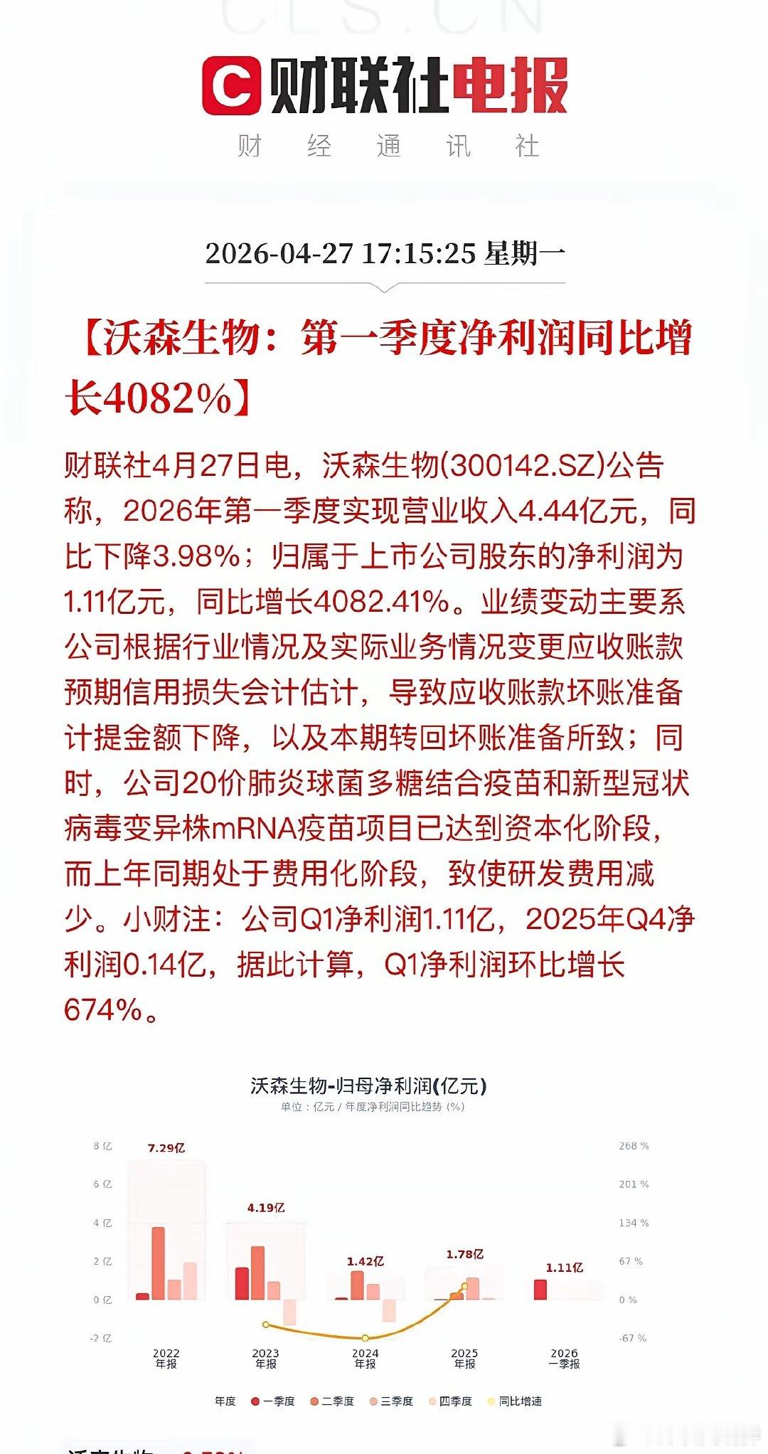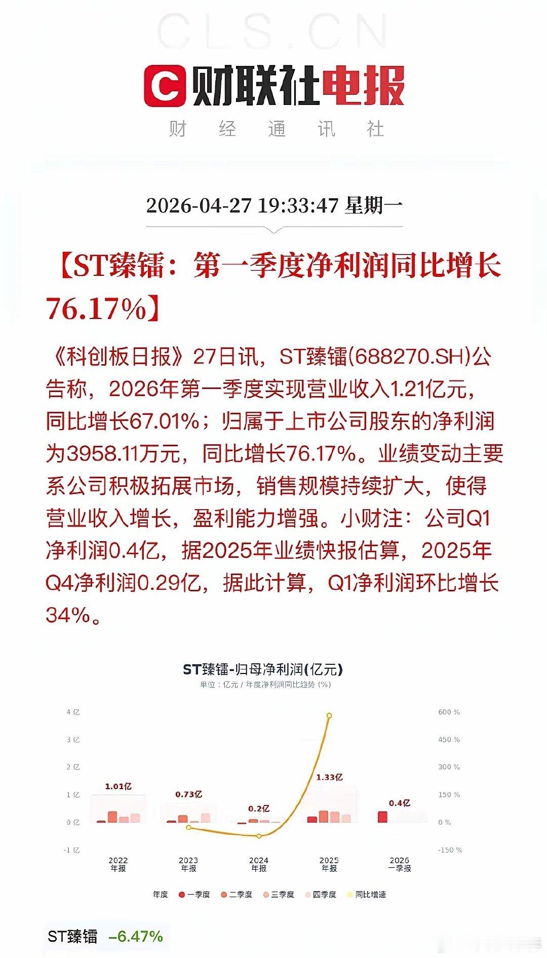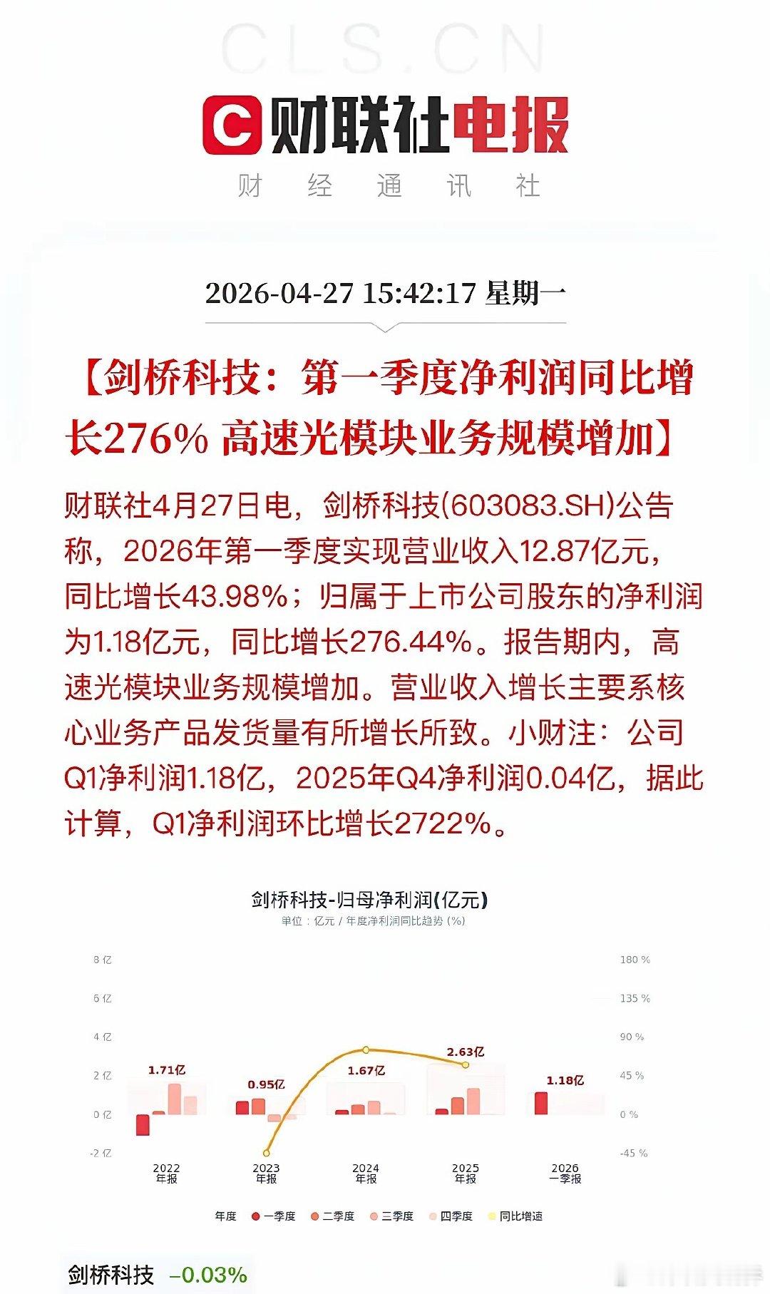 盘后大利好!近40家A股公司发布“喜报”!晚间,A股一季报披露进入高潮,近40家A股公司“报喜”!多家公司净利润增幅超10倍,博云新材更是以133倍的惊人增速领跑全场。一、新能源沉寂许久的锂电和光伏板块此次可谓“火力全开”,碳酸锂涨价驱动下,多股实现超10倍增长。·天齐锂业:Q1净利润18.76亿,同比暴增近17倍,环比超5倍增长,受益于锂产品销售均价大幅上涨。·永兴材料:紧随其后,净利同比增长155%,同样受益于碳酸锂价格走高。·天赐材料:净利润16.54亿,同比增长超10倍。·湖南裕能:净利润13.56亿,同比增幅高达1338%,印证了磷酸铁锂正极材料需求的旺盛。·永太科技:凭借锂电板块销售增加,净利润增长890%。·富祥药业:受益于新能源行业景气度提升,净利润增长超26倍。·融捷股份:净利润2.78亿,同比增长1296%,锂精矿产销量增加及价格上涨带动采选业务利润大增。·阳光电源:作为逆变器龙头,Q1净利润环比增长45%,但同比下滑40%,主因销售规模下降及汇兑损失影响。二、硬科技AI算力需求从预期走向业绩兑现,光模块、芯片设计、半导体设备全面开花。·东山精密:营收破百亿,净利润大增143%,光模块业务实现收入翻倍。·剑桥科技:同样因高速光模块业务规模扩大,净利润大增276%,环比更是暴增27倍。·源杰科技:受益于数据中心CW光源产品销售额增长,净利润增幅高达1153%。·思瑞浦:在光模块、服务器等领域持续放量,净利润大增577%。·中微公司:营收29.15亿,净利增长197%,高端刻蚀设备在先进逻辑和存储器件制造中持续放量。·鼎龙股份:CMP材料业务持续增长,净利润增78%。·南亚新材:覆铜板产品量价齐升,净利润大增611%。·紫光国微:特种集成电路业务回暖,净利润增长180%。·澜起科技:受益于DDR5子代持续迭代,净利润增长61%。· 协创数据:净利润7.50亿,同比增长343%,销售收入增长与毛利率提高共同驱动。·方正科技:净利润2.32亿,同比增长195%,PCB业务平均销售价格和销量双增。·中电港:净利润1.58亿,同比增长87%,存储芯片价格上涨带动客户需求提升。·宝鼎科技:净利润6604.65万,同比增长268%,覆铜板及铜箔产品销量增加。三、周期资源钨、铜、贵金属等资源品涨价,航运维持高景气。多股净利润增幅超10倍,周期弹性尽显。·博云新材:净利润1.32亿,同比增长13362%,硬质合金产品实现量价齐升。·铜冠铜箔:净利润1.06亿,同比增长2138%,铜箔产品售价上涨是主因。·湖南白银:受益贵金属价格上涨,净利润增456%。·章源钨业:因钨价上涨,净利润大增796%。·中远海能:Q1净利润21.73亿,同比增长207%,受益于外贸油运市场保持高位。四、高端制造商业航天、机器人、船舶等新质生产力方向表现突出。·浙海德曼:净利润1656.53万,同比增长680%,订单增加、交付能力提升。·恒工精密:净利润6195.84万,同比增长211%,新增人形机器人本体业务贡献显著增量。·松发股份:净利润10.93亿,同比增长330%,船舶开工建造及交付量不断增长。·金信诺:净利润2112.73万,同比增长560%,海外战略及内部业务结构优化推升核心盈利能力。·汇川技术:净利润10.13亿,同比下降23%,工业自动化和新能源车业务增收不增利。·ST臻镭:净利润3958.11万,同比增长76%。电源管理芯片、射频收发芯片等卡位卫星互联网产业链。五、医药/游戏·沃森生物:净利润1.11亿,同比增长4082%,主要因会计估计变更减少坏账计提及研发费用下降。·药明康德:净利润46.52亿,同比增长27%,在手订单同比增长23.6%,CRDMO模式效能持续释放。·巨人网络:净利润10.8亿,同比增长211%,主要系游戏收入大幅上升,环比增幅也超过3倍。本轮一季报高增长集中在半导体(AI算力)、锂电材料、有色金属三大方向:1. 硬科技自主可控:半导体设备、光模块国产替代加速,AI算力需求持续爆发,支撑业绩高增。2. 周期品量价齐升:锂、钨、贵金属价格触底反弹,周期股盈利弹性尽显。3. 新兴产业开花:机器人、商业航天、游戏等赛道快速成长。近40家公司密集“报喜”,超10倍增幅频现。高景气赛道的硬核业绩,有望成为市场反弹的核心驱动力。需注意:阳光电源受汇兑拖累,汇川技术增收不增利,相关方向仍需保持警惕。