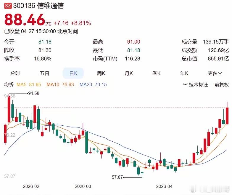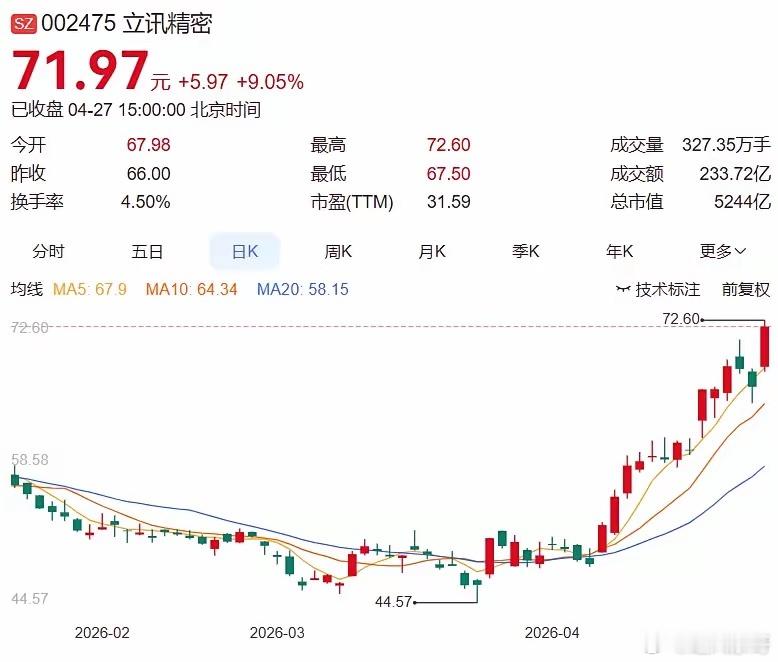 多股20cm涨停1.立讯精密+24.57亿:算力硬件龙头涨停创新高,主力净买入居首2.信维通信+12.94亿:通信板块活跃,获主力大幅增持3.北方华创+10.99亿:半导体设备龙头逼近涨停,主力抢筹4.江波龙+10.26亿:存储芯片概念,主力积极做多5.比亚迪+9.19亿:新能源车龙头,主力净流入明显6.中兴通讯+9.13亿:通信设备龙头,获主力加仓7.澜起科技+超7亿:半导体芯片,主力净买入居前8.中芯国际+超7亿:晶圆代工龙头,主力大幅增持9.豪威集团+超11亿:CIS芯片龙头涨停,半日净流入居首10.摩尔线程+超7亿:算力芯片一季报扭亏,主力抢筹二、今日主力净卖出前十名1.中际旭创-34.39亿:CPO龙头遭主力大幅抛售居首2.云南锗业-11.81亿:光芯片概念回调,资金获利了结3.新易盛-11.77亿:光模块概念走弱,主力持续流出4.拓维信息-9.81亿:算力概念调整,主力净卖出5.宁德时代-9.81亿:电池龙头震荡,资金净流出6.恩捷股份-9.47亿:锂电隔膜调整,主力抛售明显7.贵州茅台-:白酒龙头下跌,主力净流出8.杭钢股份-:算力租赁跌停,资金出逃9.浙数文化-:阿里云概念跌停,主力抛售10.金螳螂-:苏州本地股连续跌停,资金撤离三、热门板块半导体/芯片板块:10余只成分股涨停:英特尔业绩超预期叠加费城半导体指数18连涨,帝奥微、欧莱新材20cm涨停。如:①帝奥微20cm涨停 ②欧莱新材20cm涨停 ③豪威集团涨停机器人板块:多只个股封板:国家电网68亿采购计划催化,科森科技、合力泰等多股涨停。如:①科森科技涨停 ②合力泰涨停 ③申昊科技涨超10%PCB/算力硬件板块:反复活跃:PCB价格4月单月涨40%,立讯精密涨停创新高。如:①立讯精密涨停创新高 ②景旺电子涨停 ③天津普林涨停四、热门股点评:立讯精密:算力硬件龙头涨停,主力净买入24.57亿居首华电能源:绿电概念上演地天板,强势晋级3连板中际旭创:CPO龙头遭主力抛售34.39亿,净流出居首水发燃气:氦气概念强势晋级4连板,成市场高度板帝奥微:半导体20cm涨停,股价创近3年新高4月27日市场分化加剧,沪指微涨0.16%收报4086点,科创50指数大涨超3%逼近历史高点。半导体板块受英特尔业绩超预期及费城半导体指数18连涨催化全线爆发,帝奥微等多股20cm涨停,电子行业获128亿主力资金净流入居首。机器人板块受国家电网68亿采购计划提振表现活跃,科森科技等多股涨停。CPO概念则遭遇资金集中兑现,中际旭创遭主力抛售34亿居首,光模块与PCB板块呈现明显的“高低切换”特征。整体来看,资金正从高位算力硬件向半导体设备、机器人等新方向切换,业绩确定性与政策催化成为核心锚点。