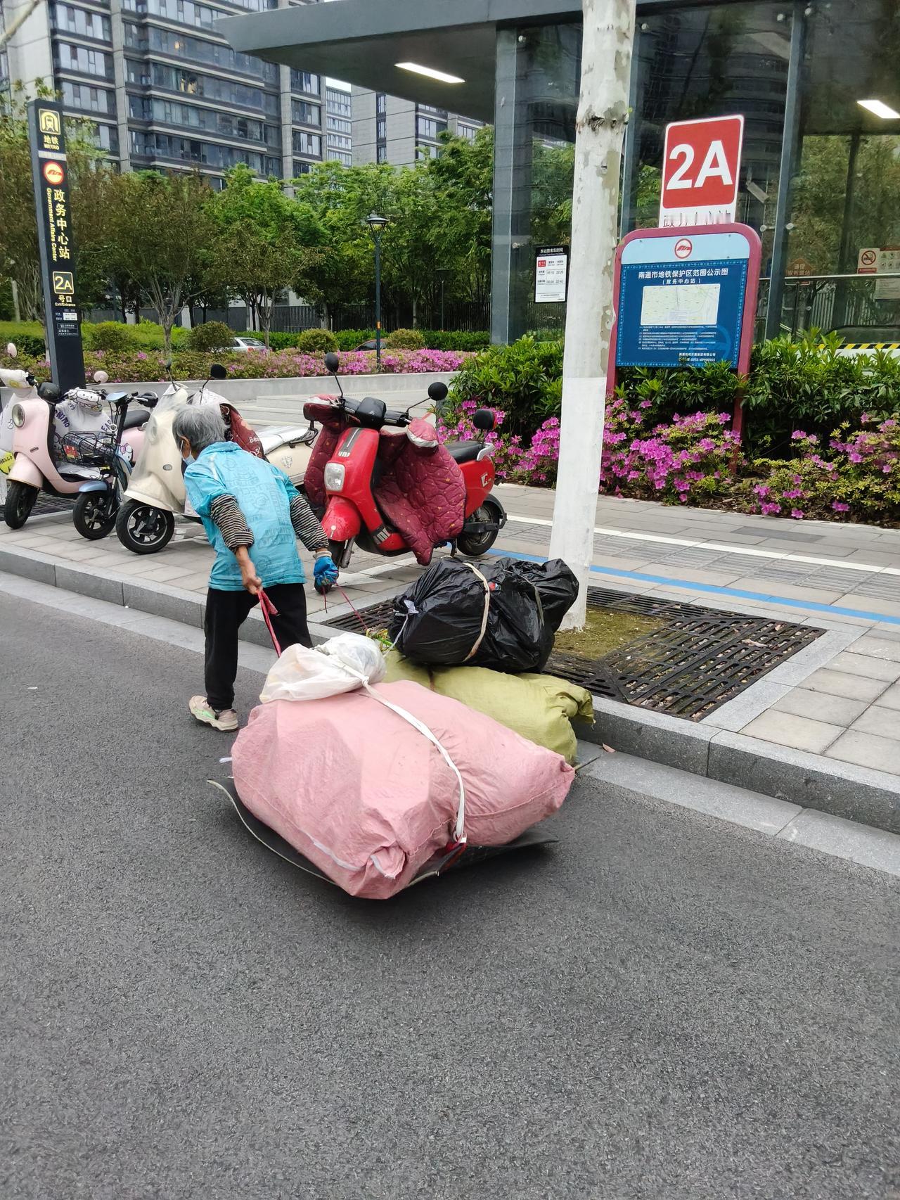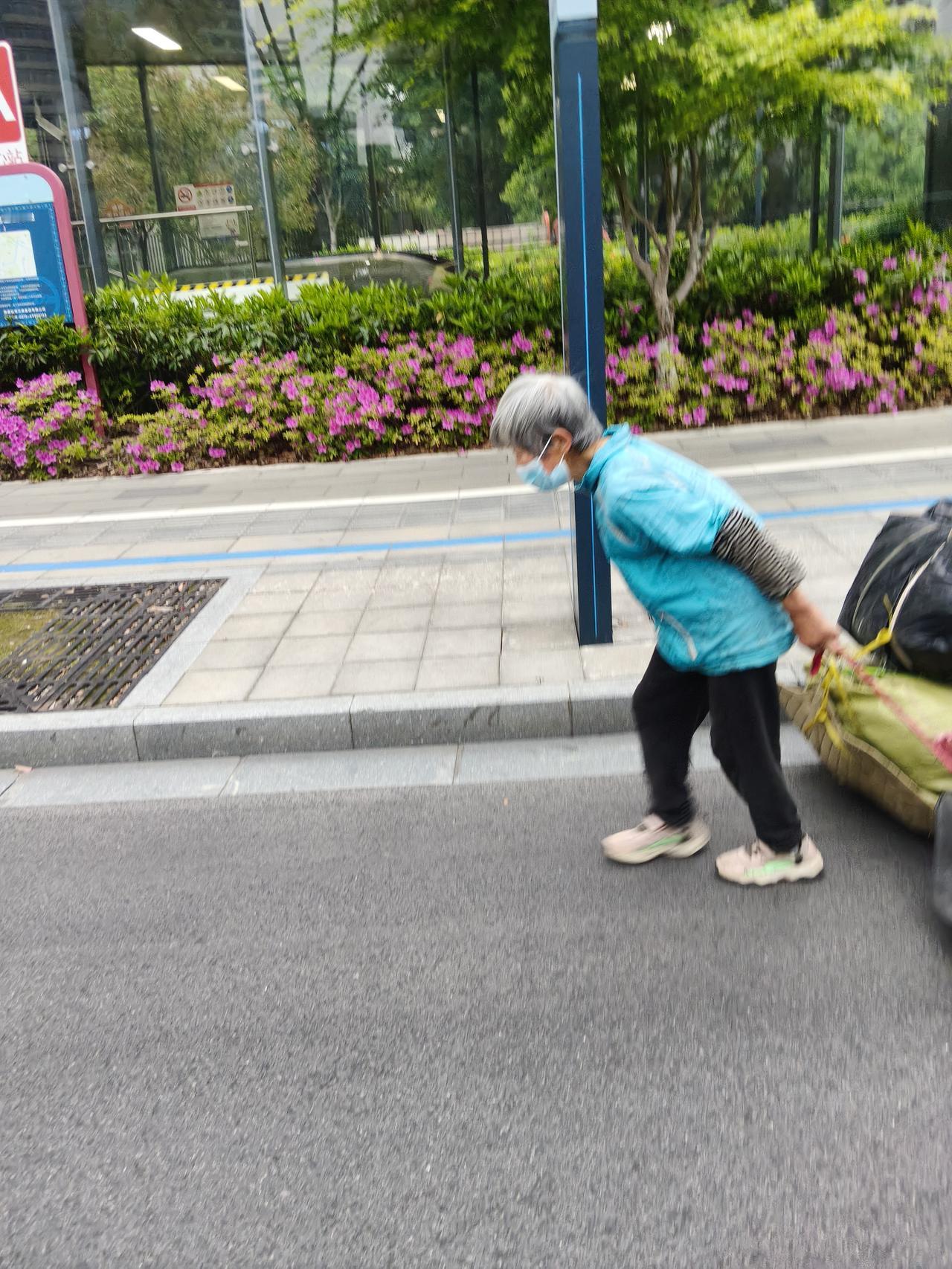 拖拉重物的老妇 今天下午在繁华的工农路上偶然拍到一位拖拉重物的老妇,只见她头发花白,戴着口罩,弯腰缓慢前行,双手拖着4、5个鼓鼓的包装袋,看上去十分费劲。真不知这位老妇是干什么的?为何要拖着重物艰难前行?朋友,您认为是昨回事呢?!
