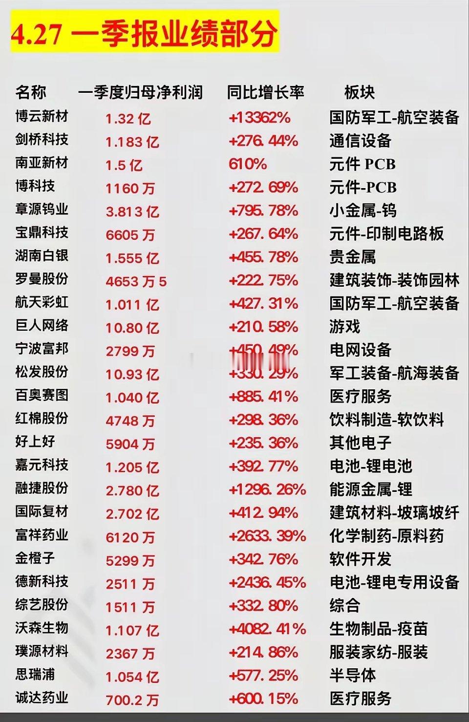 一季报业绩炸裂!多股净利暴增超2000%,这些赛道成最大赢家4月27日,A股一季报披露进入冲刺阶段,一批业绩超预期的“黑马股”浮出水面,多股净利润同比暴增超200%,最高增幅超13000%,成为市场焦点。从榜单来看,国防军工、锂电、医药三大板块成业绩爆发主阵地。博云新材以1.32亿净利润、同比+13362%的增幅领跑,航天彩虹、松发股份等军工股也交出超400%的增长答卷,航空装备、航海装备赛道景气度持续攀升。锂电产业链同样亮眼,融捷股份净利润同比暴增1296.26%,嘉元科技、德新科技分别以392.77%、2436.45%的增幅紧随其后,锂资源与锂电设备企业业绩迎来戴维斯双击。医药板块中,沃森生物净利润同比大增4082.41%,富祥药业、诚达药业也以超600%的增幅领跑,疫苗与原料药赛道迎来业绩拐点。此外,PCB、贵金属、游戏等板块也有不少亮眼标的:章源钨业、湖南白银受益于金属价格上涨,净利增幅分别达795.78%、455.78%;巨人网络以10.80亿净利润、210.58%的增幅领跑游戏板块,显示出行业复苏信号。业绩暴增背后,既有行业周期回暖的推动,也有企业自身产能释放与成本优化的加持。不过需要提醒的是,以上数据仅为公开信息整理,不构成投资建议。股市有风险,投资需谨慎。A股一季报 业绩超预期军工 锂电池医药
