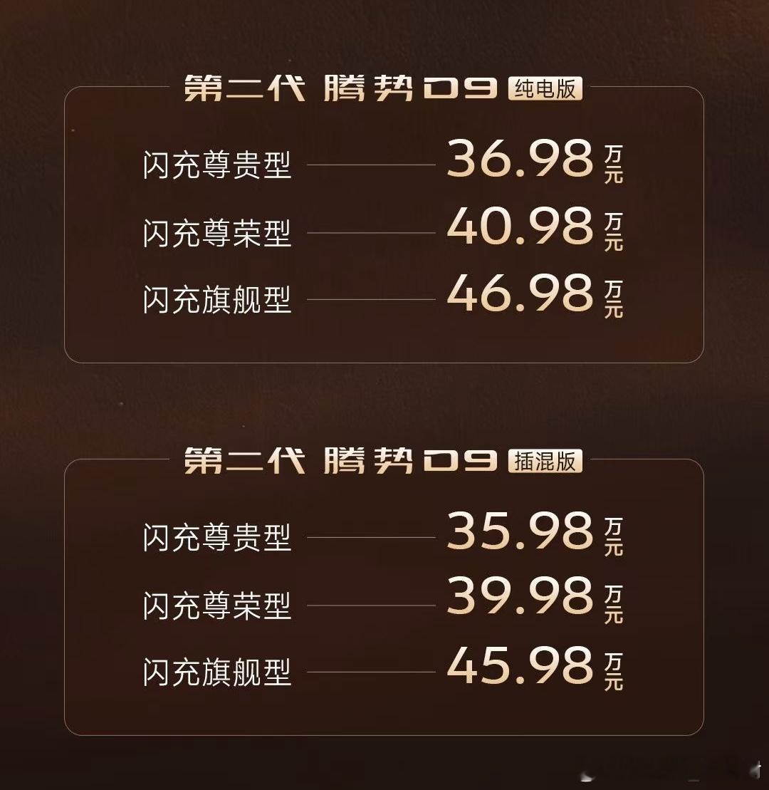 第二代腾势D9 上市价35.98万-46.98万元大电池长续航+闪充技术+遍地开花的闪充站光这一点就够能打的了!