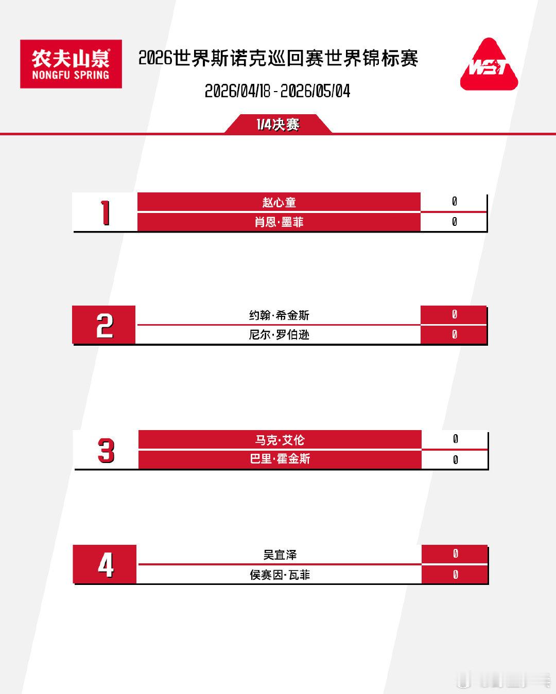 赵心童 VS 肖恩·墨菲马克·艾伦 VS 巴里·霍金斯约翰·希金斯 VS 尼尔·罗伯逊吴宜泽 VS 侯赛因·瓦菲赵心童吴宜泽携手晋级8强看斯诺克上咪咕