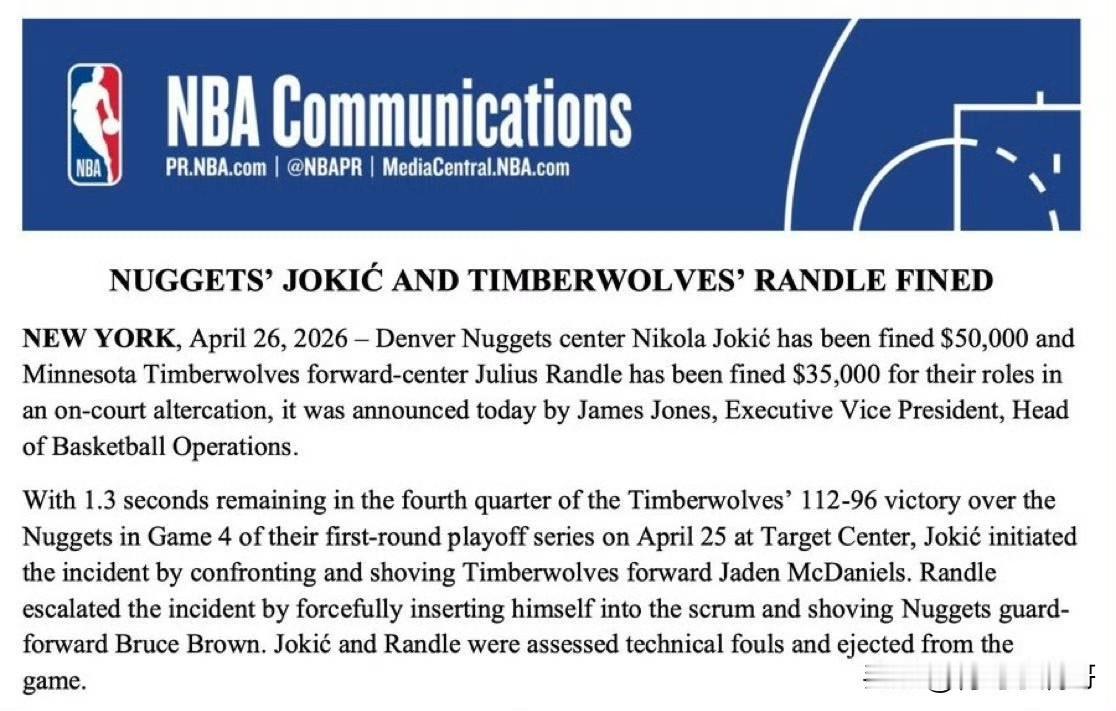 没有禁赛!!!跟麦丹没关系,约基奇罚款5万美元,兰德尔罚款3.5万美元! 根据NBA官方发布消息,在掘金和森林狼的G4最后时刻,掘金和森林狼球员发生冲突,约基奇激动的冲向麦克丹尼尔斯,最终经过联盟研究决定,约基奇因参与冲突被罚5万美元,兰德尔被罚3.5万美元。 好消息是没有任何人被禁赛,明天的G5将于上午十点半在掘金主场继续进行,目前森林狼3-1拿到了赛点,对掘金来说可以说是濒临绝境。 在常规赛的末尾,都说掘金不挑对手,至少是首轮不会挑,看看现在吧,他们还会这么觉得吗? 这个罚款也是很有意思,约基奇是奔着麦丹去的,结果却和兰德尔纠缠起来,最终约基奇和兰德尔被罚款,反而和麦丹没关系……真的是匪夷所思。 森林狼目前迪文琴佐和华子都打不了,如果真的进了次轮对他们也是一个挑战,加油吧! 约基奇 掘金 森林狼
