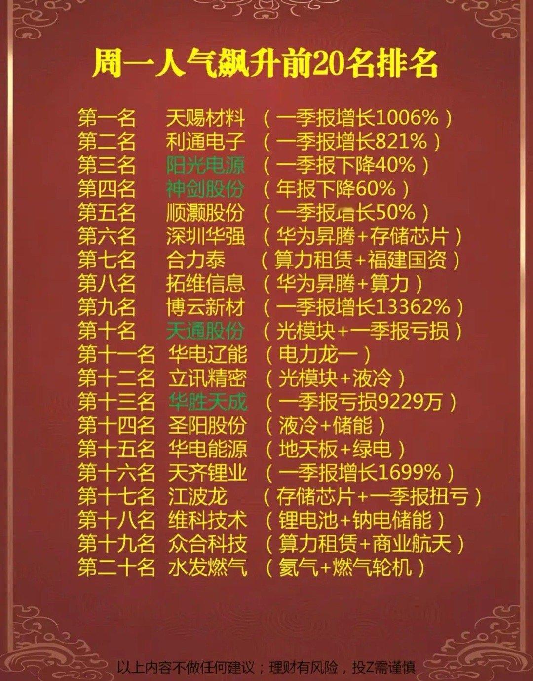 周一市场人气飙升前20名股票榜单。其中,天赐材料、博云新材、天齐锂业等因一季度业绩大幅增长(如博云新材增长超133倍)人气高涨;也有阳光电源、神创股份等业绩下滑或亏损的个股上榜,同时华为昇腾、算力租赁、光模块、液冷等热门题材股也在列。图片内容不构成投资建议,理财有风险,投资需谨慎。