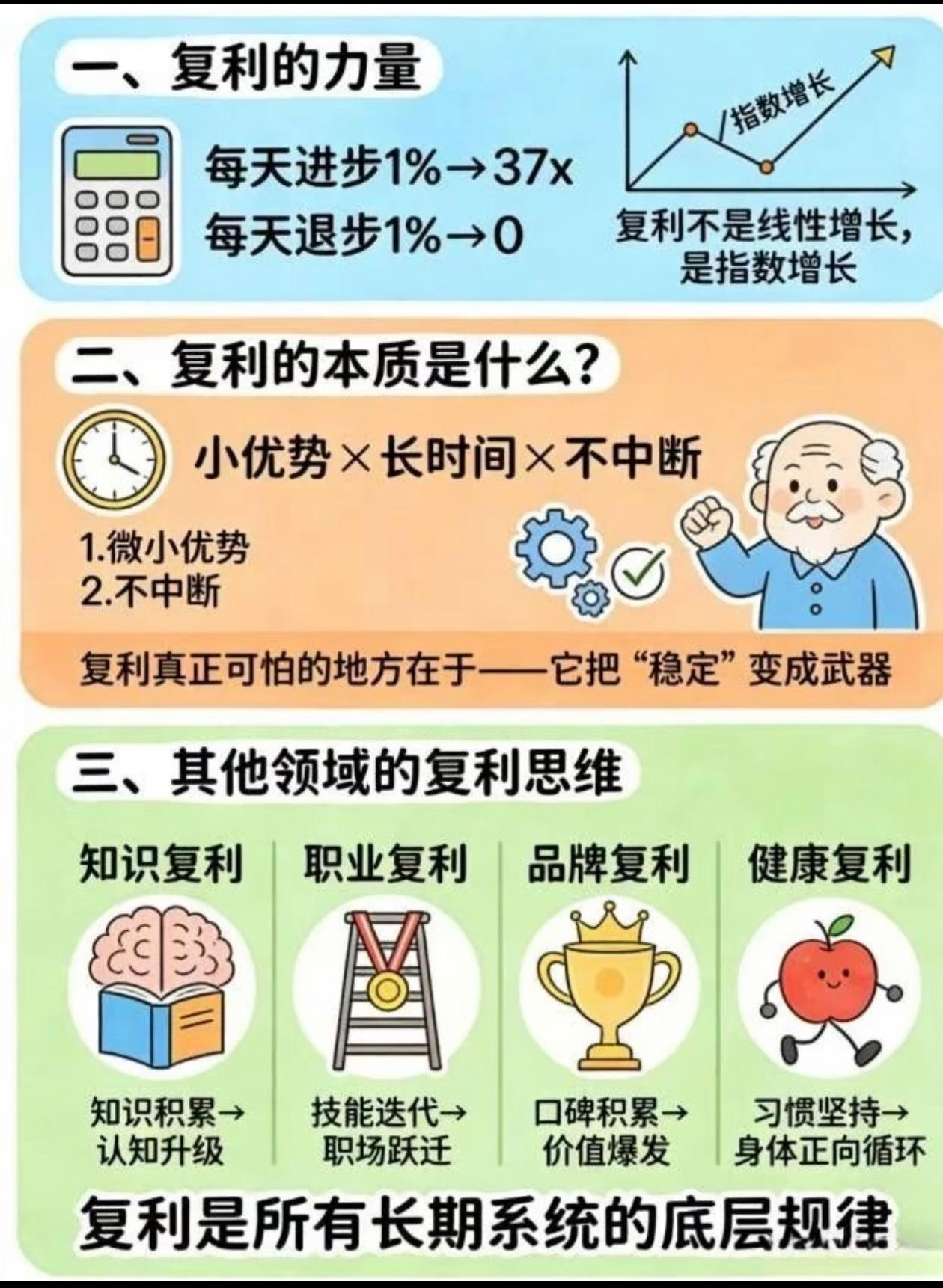 知道不重要,重视起来才重要 “复利是世界第八大奇迹”这句话,很多人都听过。 但真正靠它赚到钱的,寥寥无几。 不是复利没用,而是你没真正重视它: - 知道要持有优质资产,却总忍不住追涨杀跌; - 知道要长期持有,却总想一夜翻倍; - 知道要控制回撤,却在亏损时舍不得止损。 复利的核心,从来不是“知道”,而是“做到”。 每天进步1%,一年翻37倍;每天退步1%,一年归零。 稳定的小优势,乘以时间,才是普通人财富跨越的终极武器。 ⚠️ 风险提示:本文仅为投资理念分享,不构成任何具体投资建议。股市有风险,投资需谨慎。 复利思维 长期主义 优质资产 投资干货 你有在坚持的复利习惯吗?评论区聊聊,收藏起来提醒自己别放弃~