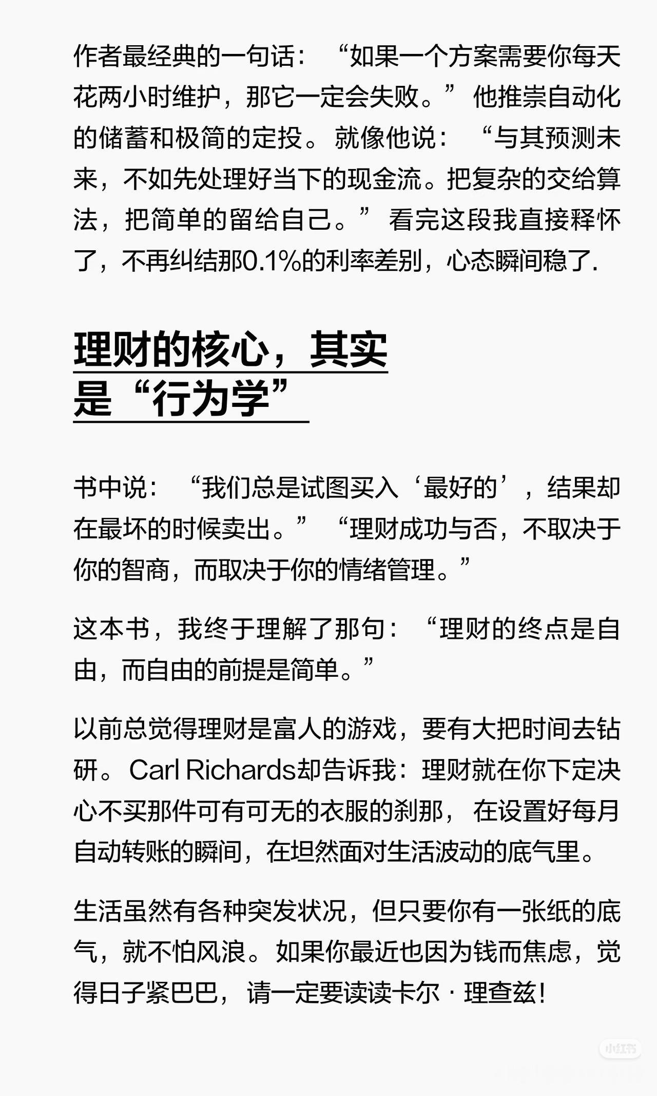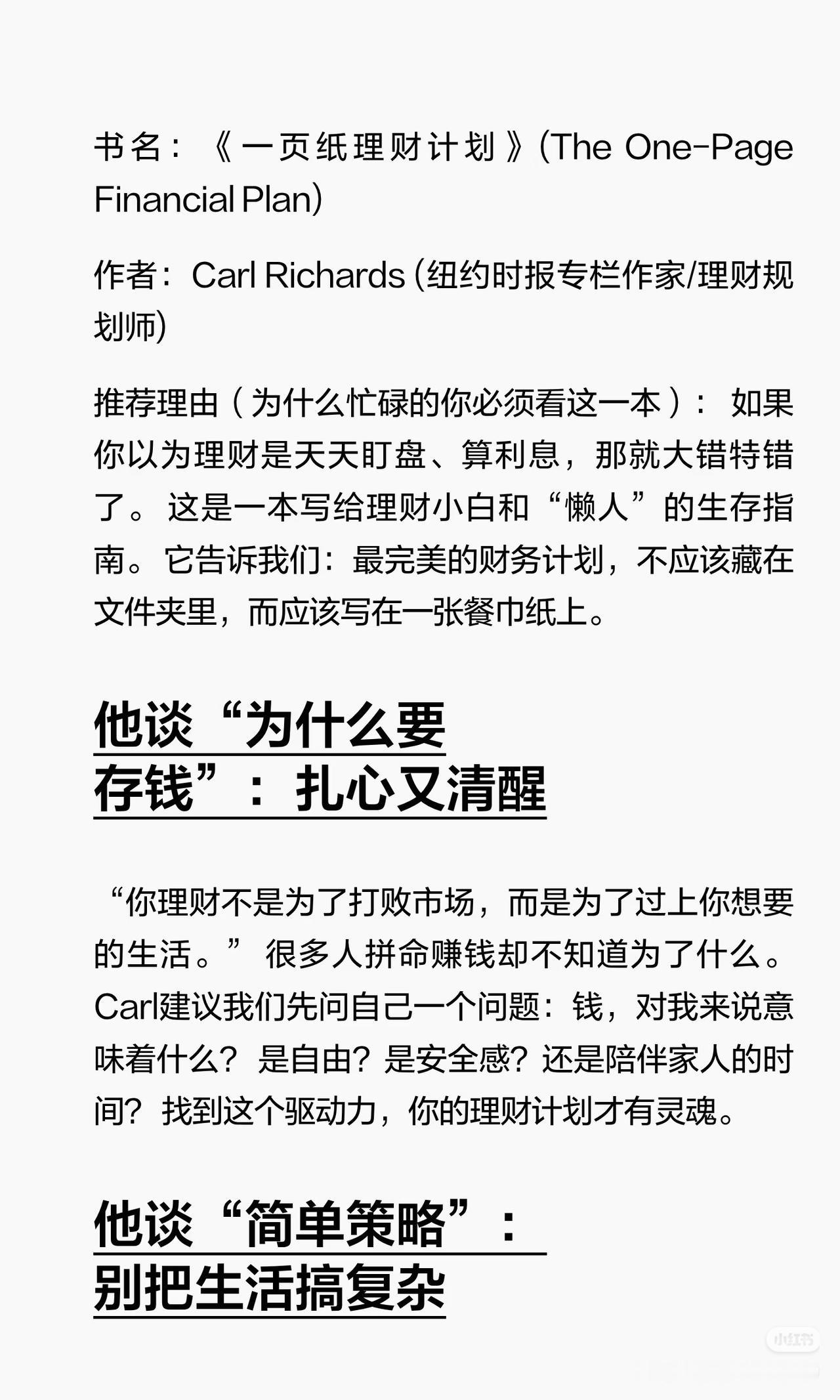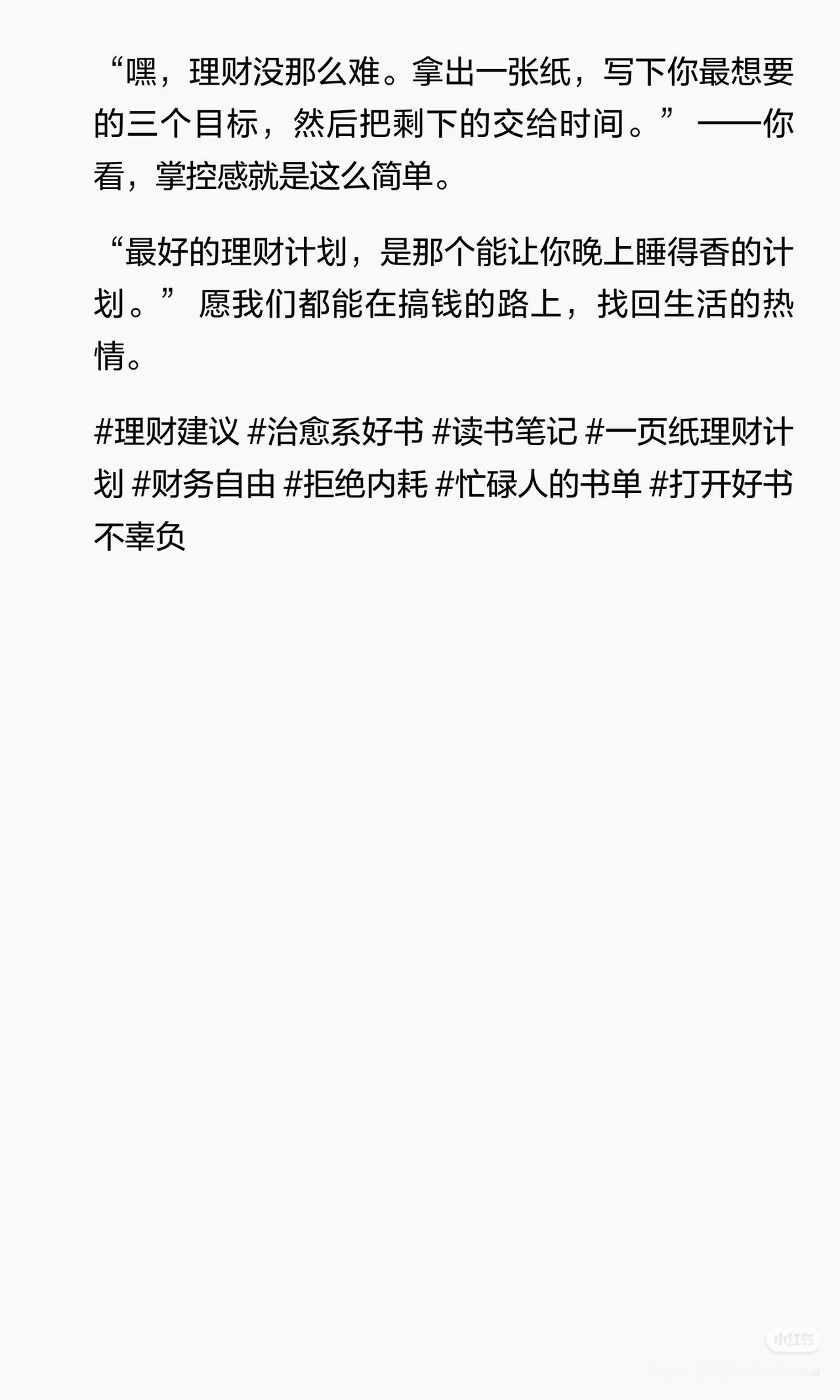 理财不是为了变富,而是为了睡得香 “最好的理财计划,是那个能让你晚上睡得香的计划。” 很多人把理财当成一夜暴富的捷径,追涨杀跌、频繁交易,结果越理越焦虑。 其实理财的真相,就写在《一页纸理财计划》里: ✅ 理财不是为了打败市场,而是为了过上你想要的生活; ✅ 不用盯盘、不用纠结0.1%的利率,自动化储蓄+极简定投就够了; ✅ 真正的敌人不是市场,而是你追涨杀跌的情绪; ✅ 一张纸写下目标,剩下的交给时间,比复杂的计划更靠谱。 与其在市场里内耗,不如做个简单的计划,让钱为你带来底气,而不是焦虑。 ⚠️ 风险提示:本文仅为理财理念分享,不构成任何具体投资建议。市场有风险,投资需谨慎。 理财干货 拒绝焦虑 长期主义 优质资产 你理财的目标是什么?评论区聊聊,收藏起来提醒自己别内耗~