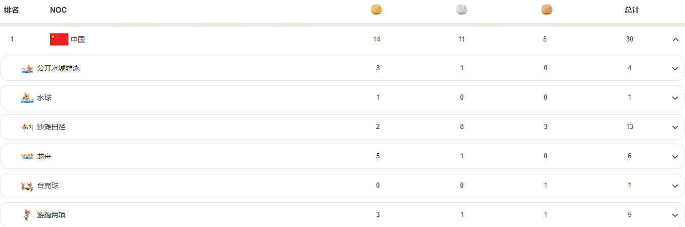 三亚亚沙会,中国队目前斩获14金11银5铜,领跑金牌数和奖牌数