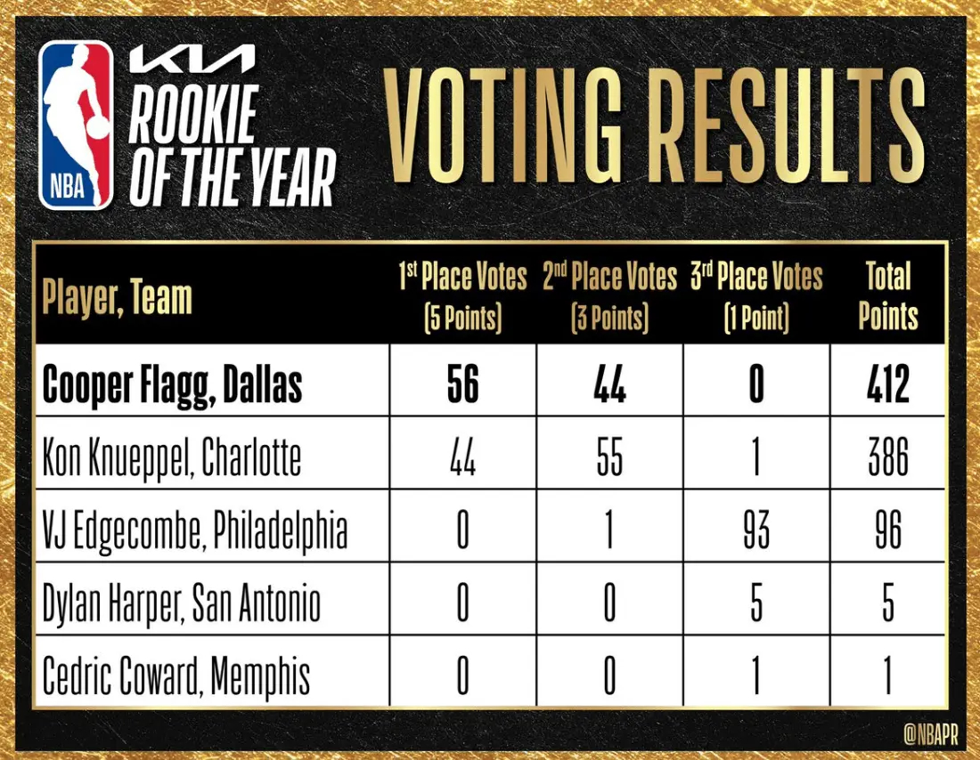 据知名记者Shams Charania报道,达拉斯独行侠队的库珀-弗拉格当选本赛季最佳新秀。