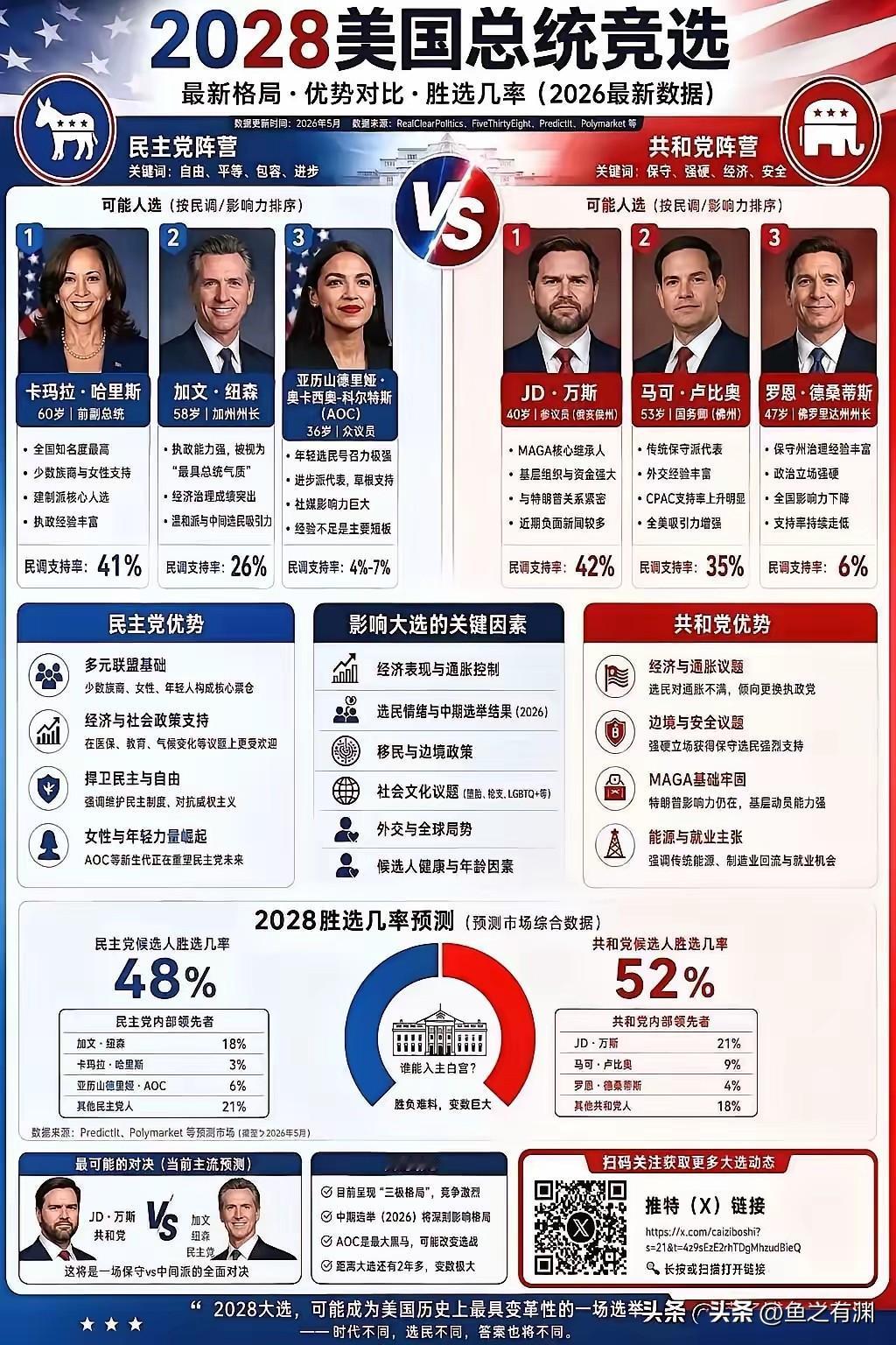 下一任美国总统,不可能在共和党出现了!特朗普做了大贡献。如果美国人还选共和党,那么是他们自己心甘情愿被蹂躏。 目前民主党阵营是集体反特朗普的,特别是奥巴马和拜登,简直被特朗普气死了!原来所有的政治成果全部被特朗普推翻,还天天被特朗普骂。只要特朗普没干好的事情,都是民主党拜登和奥巴马的错! 按照现有人选,共和党只能拿出现在的副总统万斯来抗衡。民主党这边除了原副总统哈里斯,还有加州州长纽森。上次哈里斯小负特朗普,如果继续参选,应该是可以获胜的,如果获胜,她将成为美国历史上第一位女总统!