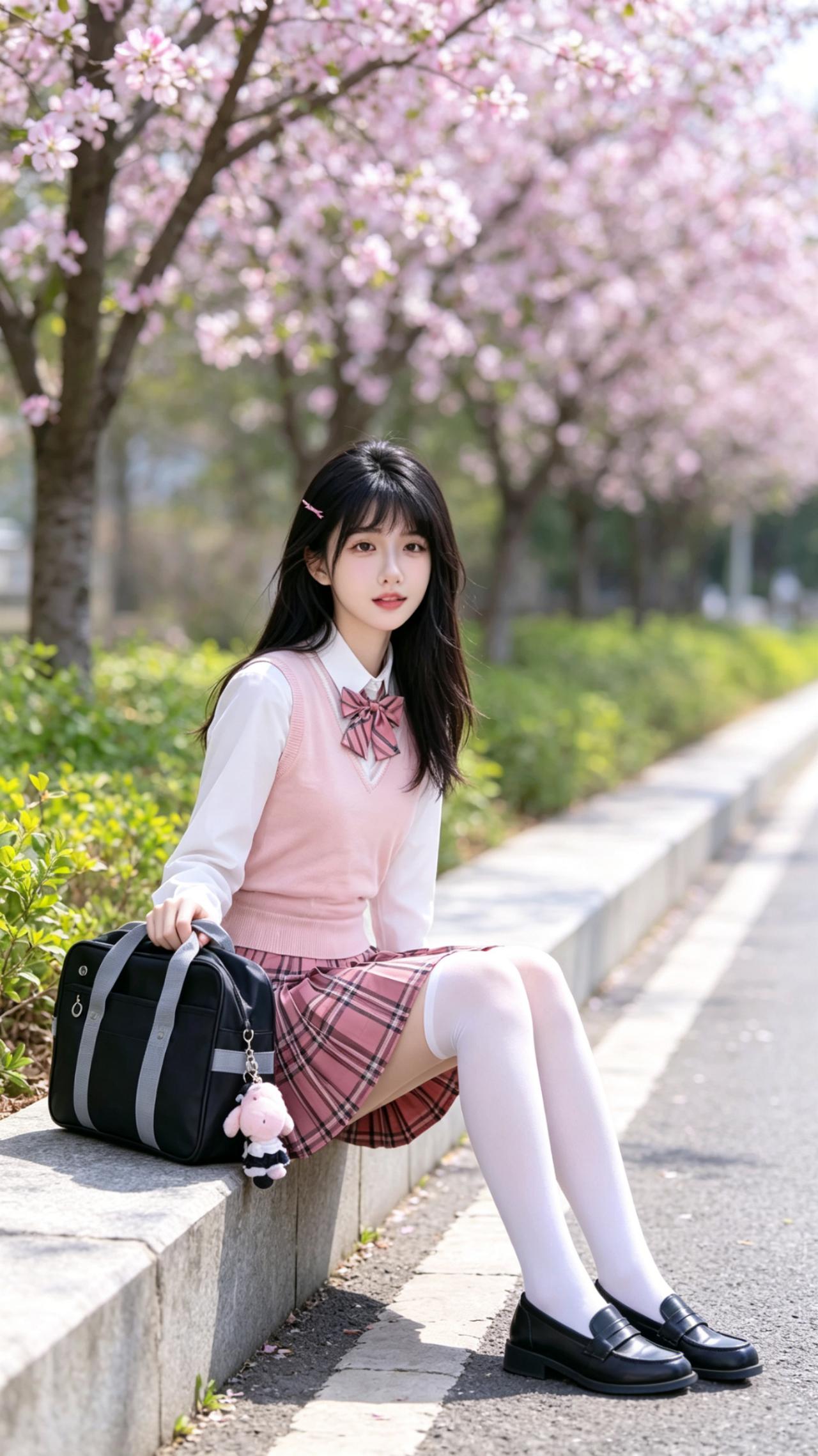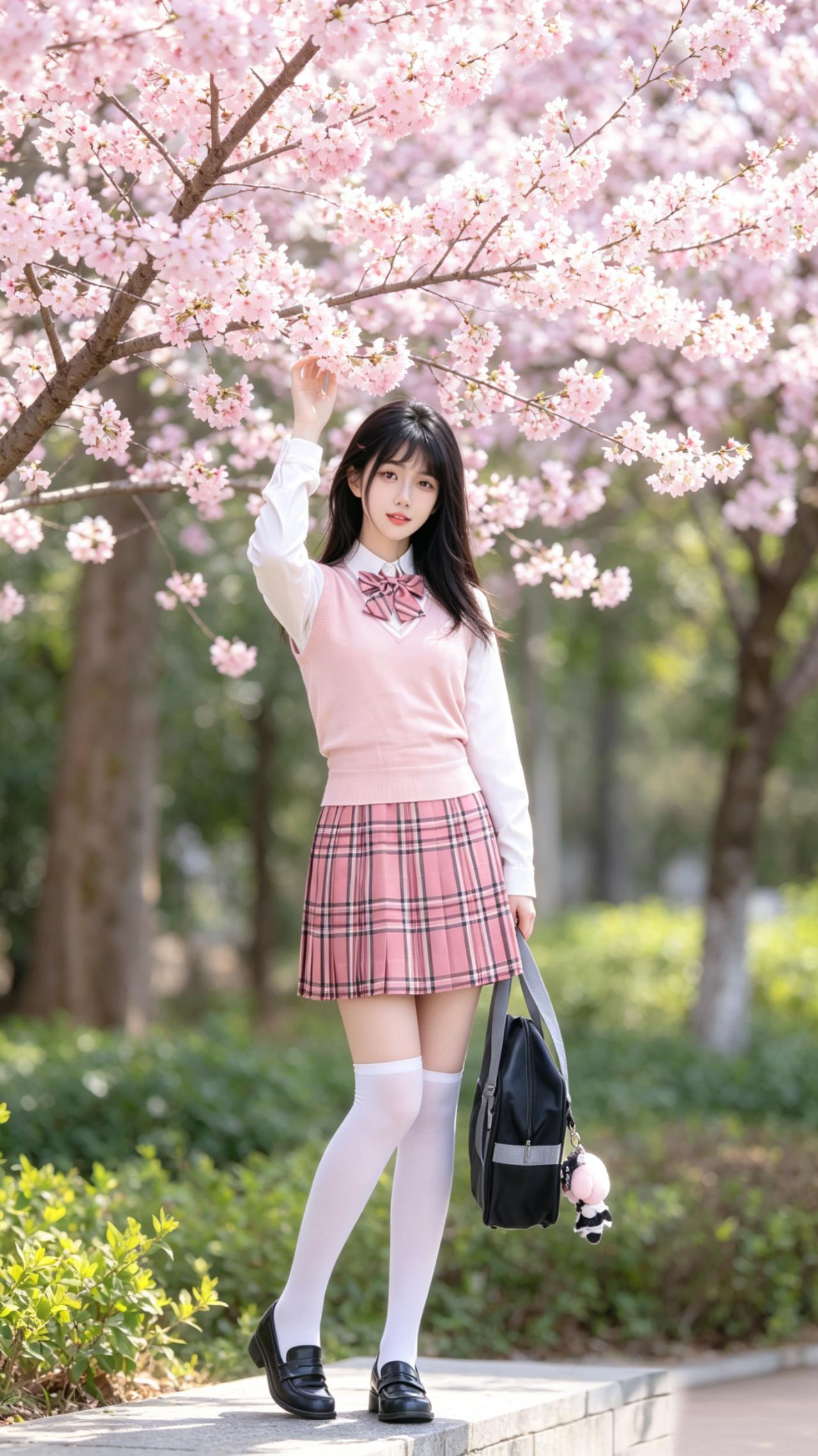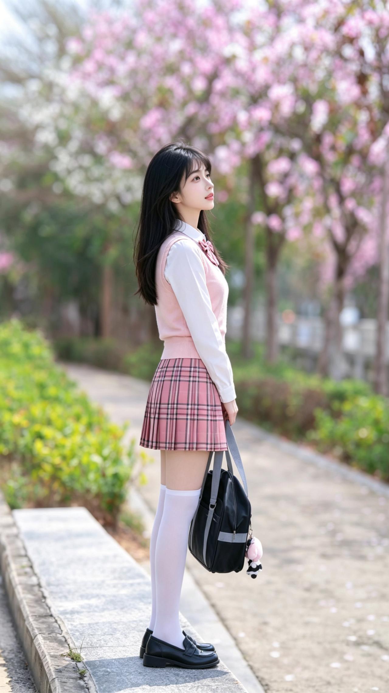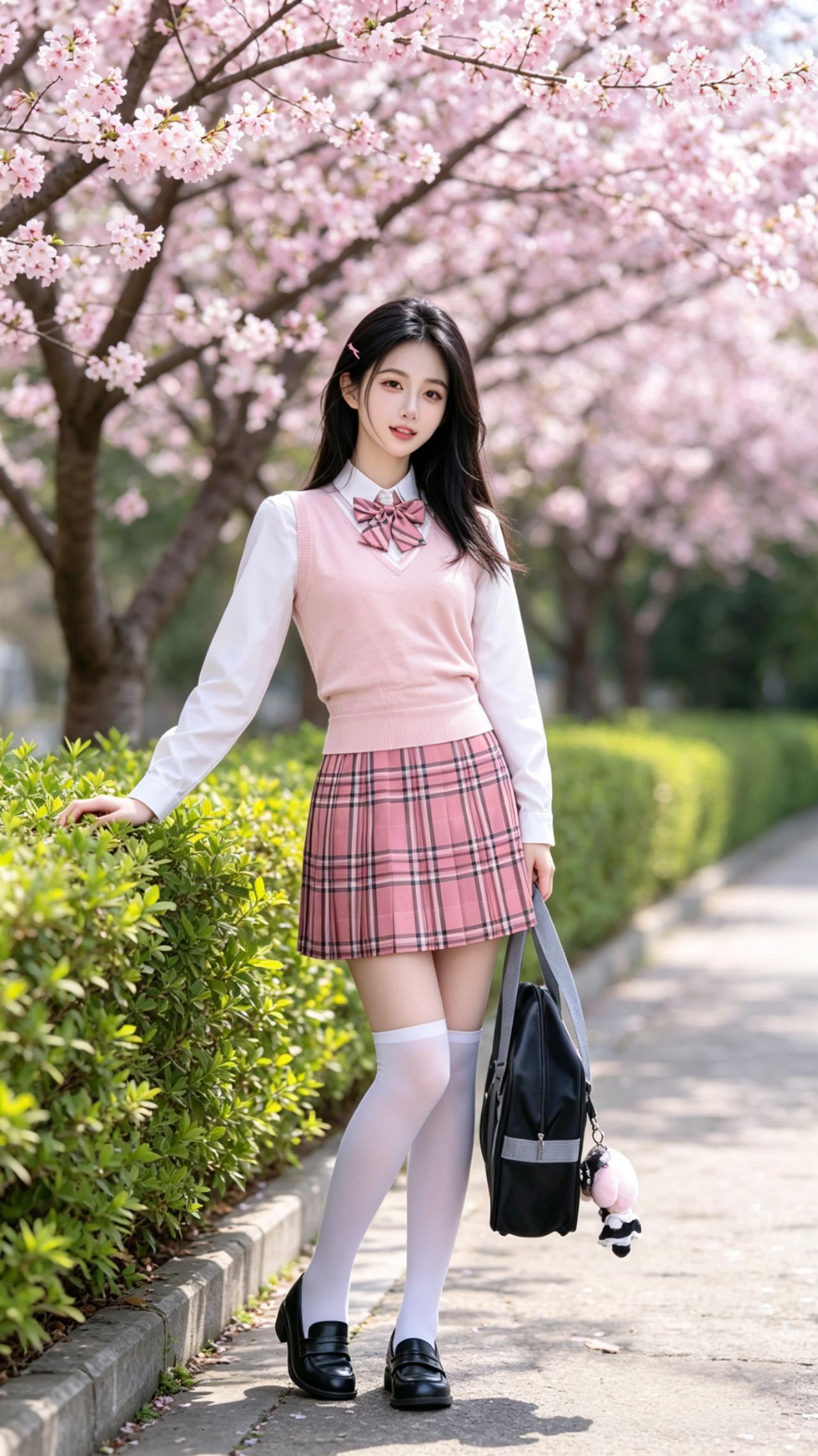 穿搭风格:清甜日系jk制服套装 少女身着清甜日系JK制服套装,满是校园青春感:白衬衫外搭柔粉V领针织背心,领口系着粉黑条纹蝴蝶结,温柔又乖巧;下装是同色系格纹百褶裙,规整的褶皱带着利落的学院感;搭配白色过膝袜与黑色乐福小皮鞋,手提缀着玩偶挂饰的黑色制服包,发间别着粉色小发夹,将少女的娇俏灵动与校园的纯粹元气完美融合,干净又治愈。 她漫步在樱花盛放的春日小径,粉云般的樱花缀满枝头,落英轻飘在石阶与绿篱间,暖光漫洒在花影与衣袂上,晕染出温柔治愈的春日光景。柔粉制服与漫天樱花浑然相融,格纹裙的甜与樱花的柔交相呼应,白袜与黑鞋的经典搭配衬出少年感的清爽。她指尖轻触绿篱,眉眼含笑,穿搭的清甜元气与春日的浪漫诗意交织,宛若从樱花雨里走出的校园少女,将青春里的明媚与温柔,妥帖安放于这片粉白花间。 jk青春感穿搭 jk风日常穿搭 jk日系穿搭 jk通勤穿搭 jk服装穿搭 jk女神穿搭 jk衬衫套装
