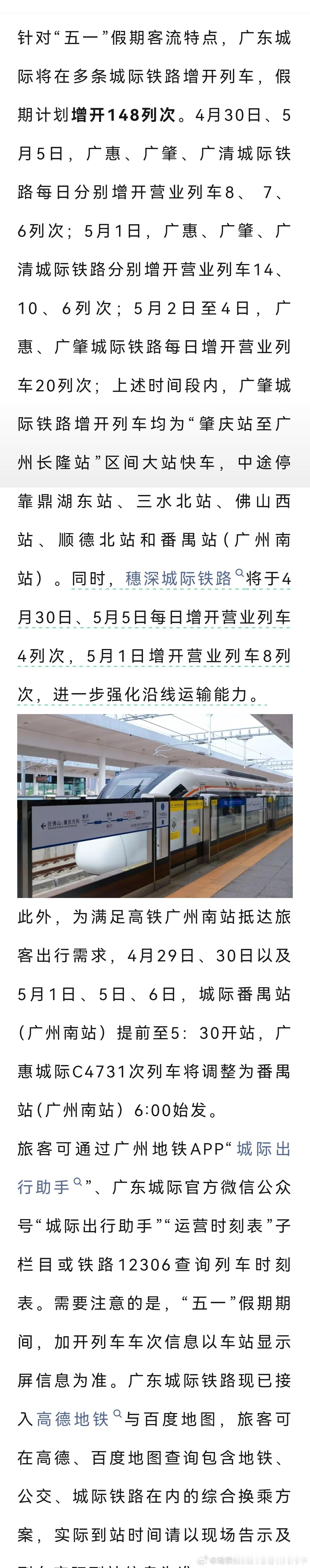 【2026年五一假期广东城际 五一假期多条线路增开列车148列】针对“五一”假期客流特点,广东城际将在多条城际铁路增开列车,假期计划增开148列次。2026年4月30日、5月5日,广惠、广肇、广清城际铁路每日分别增开营业列车8、 7、 6列次;5月1日,广惠、广肇、广清城际铁路分别增开营业列车14、10、6列次;5月2日至4日,广惠、广肇城际铁路每日增开营业列车20列次;上述时间段内,广肇城际铁路增开列车均为“肇庆站至广州长隆站”区间大站快车,中途停靠鼎湖东站、三水北站、佛山西站、顺德北站和番禺站(广州南站)。同时,穗深城际铁路将于4月30日、5月5日每日增开营业列车4列次,5月1日增开营业列车8列次,进一步强化沿线运输能力。此外,为满足高铁广州南站抵达旅客出行需求,4月29日、30日以及5月1日、5日、6日,城际番禺站(广州南站)提前至5:30开站,广惠城际C4731次列车将调整为番禺站(广州南站)6:00始发。(广东城际)