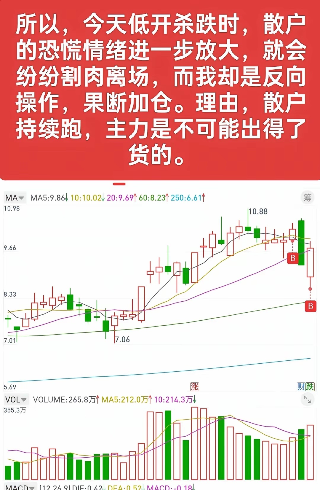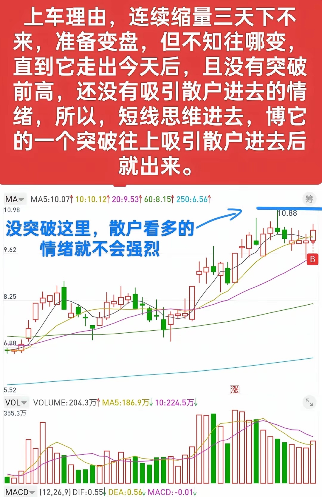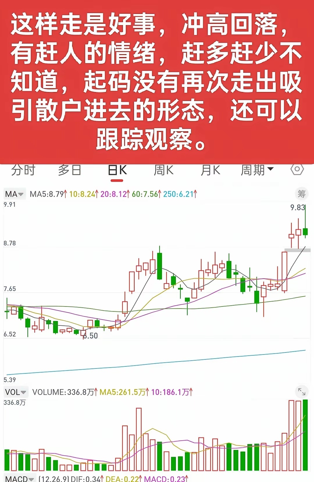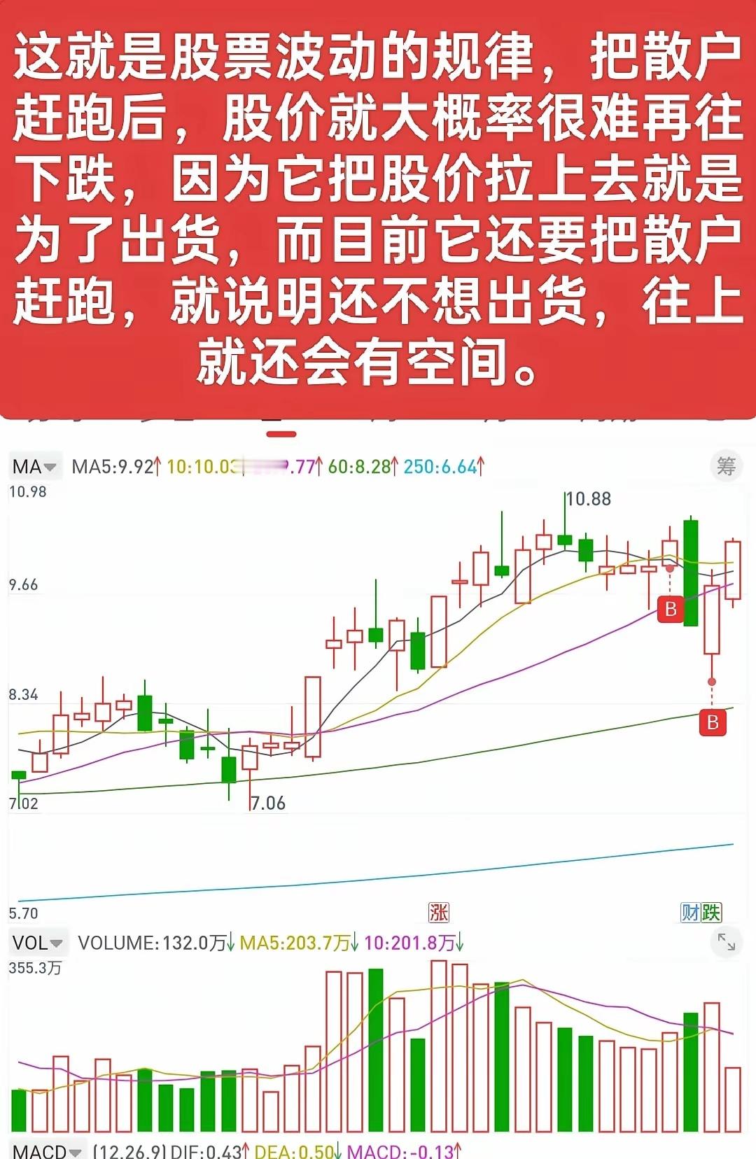 买卖的行为,最好是能理解到广大散户情绪的连续性,这对分析股票的局部形态是很有帮助的。比如卖出时,当看到有散户进去的情绪时,不要着急马上就卖出,可以适当减仓,也可以不要动,看看后面还有没有继续吸引散户进去的形态,如果有,那就再挥一挥衣袖走人。如果后面没有走出吸引散户进去的形态,反而是走出赶人的形态,那么就还可以继续跟踪观察,直至再次拉升出现二次的进人情绪。买入也是,不要一看到赶人形态就马上进去,最好也要跟踪看看有没有赶人情绪的连续性,也就是说,有没有持续的让车上的散户感到害怕的情绪,因为让散户感到恐惧的情绪越强烈,他们卖出的意愿就越大,这个时候才是相对好的买入点。我这个买卖情绪,如果认真看,都是很反人性的,也就是说,卖出时,都是你很不想卖出的时候,买入时,也都是你很不想或不敢买入的时候,所以,股票从不是顺人性的,顺人性操作永远都是被人家收割的。